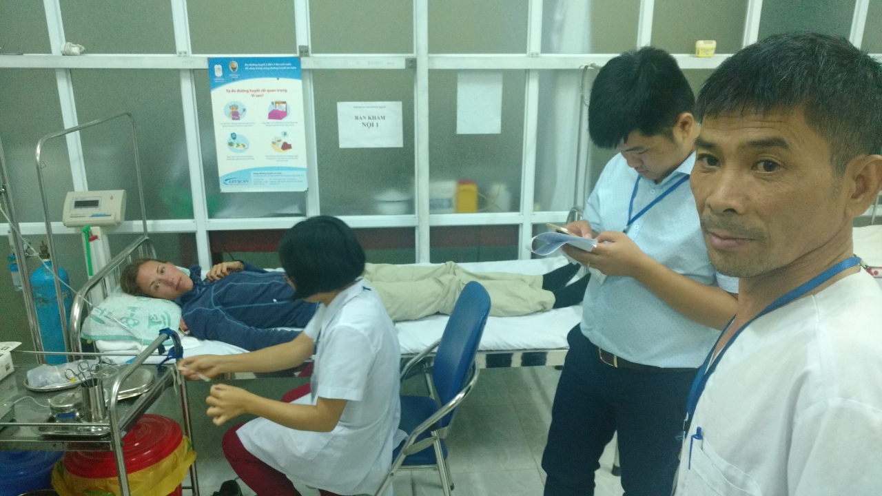 Arrivés à Ha Giang, Julien dépose Elise transie dans la chambre d’hôtel, puis gère l’intendance (moto à rendre, sacs à récupérer). On nous indique une école de médecine avec des docteurs parlant anglais. Arrivés sur place, ce seront pas moins de 5 médecins qui entoureront Elise pour comprendre ce qui se passe. On a un peu l’impression d’être une attraction, tout ça les fait rigoler.