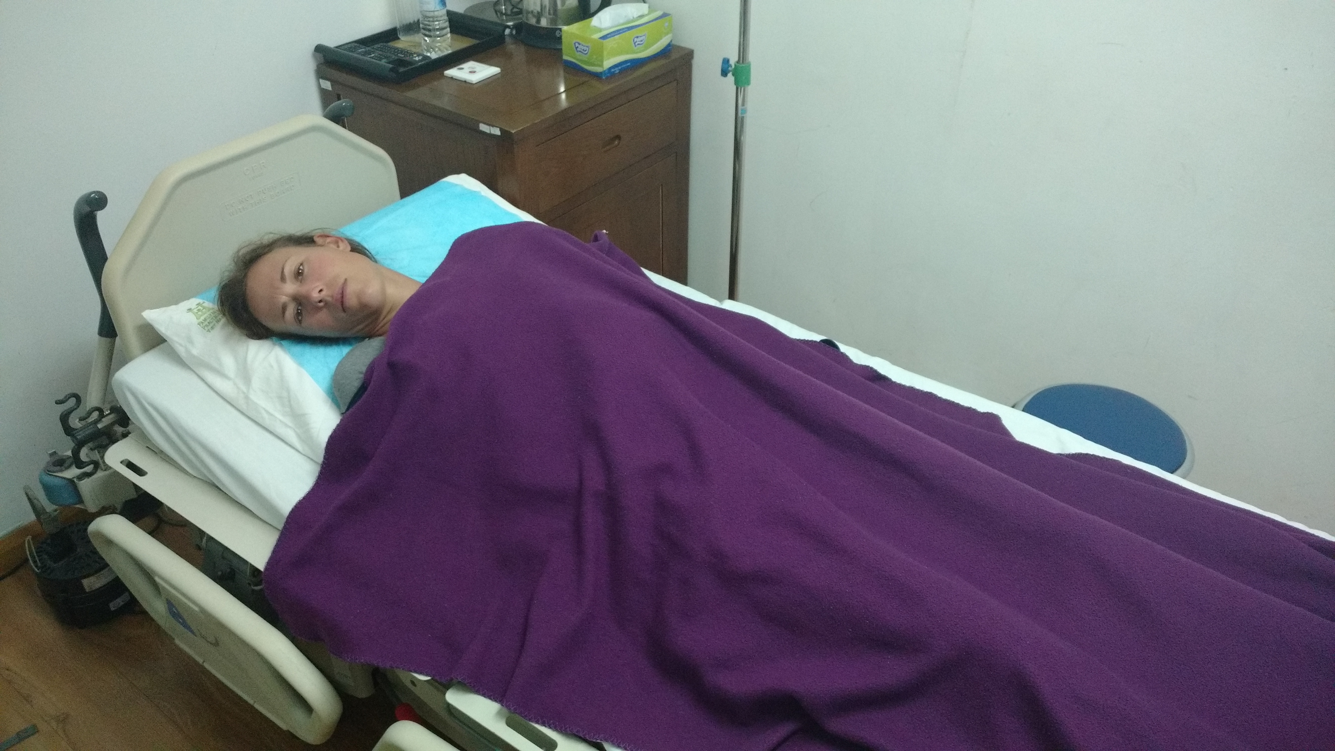 A l’hôpital, on a un médecin français (et ça, ça n’a pas de prix… ah bah si en fait… mais ça fait une grosse différence !). Auscultation puis prise de sang pour vérifier Dengue, Paludisme, Grippe et autres joyeusetés… 1 heure plus tard on a le résultat : c’est une dengue… La dengue dure environ 7 jours avec un « pic » au 5ème jour (puis d’une convalescence d’une quinzaine de jours). Elise en était justement à son 5ème jour de fièvre… Le médecin décide de l’hospitaliser.