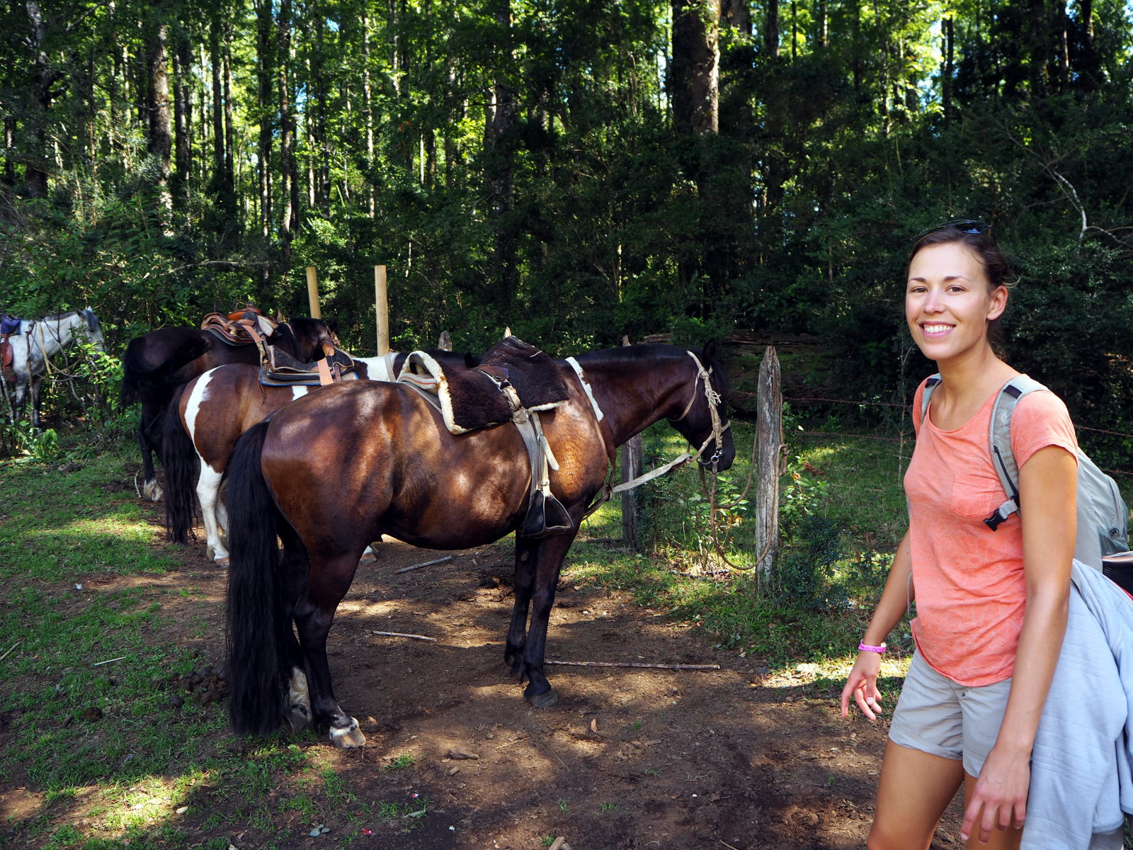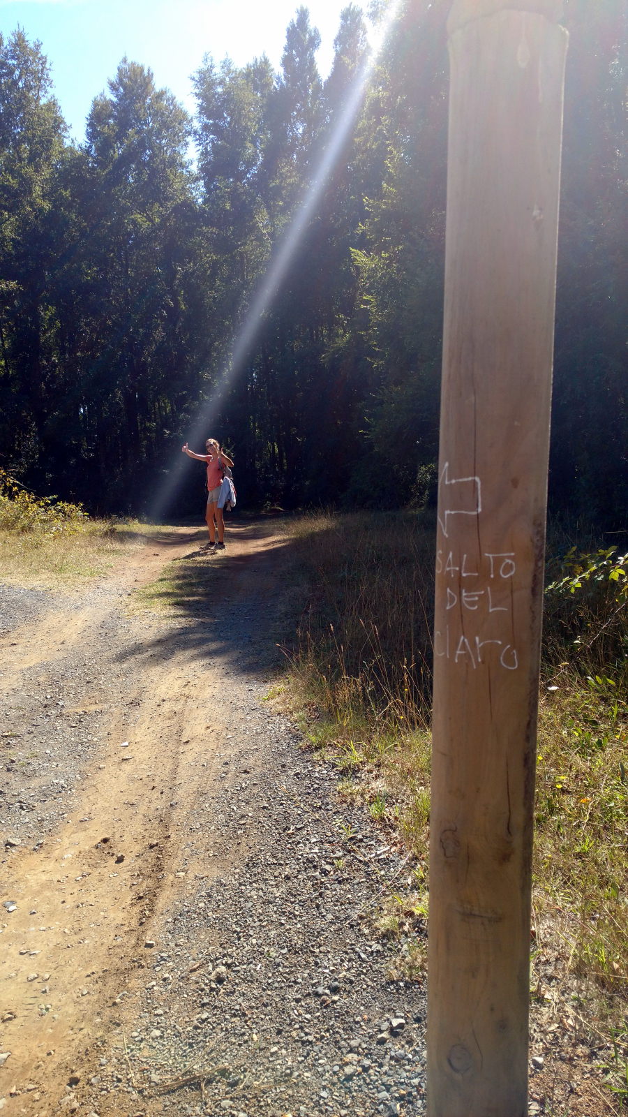 Un gaucho (un chilien qui monte à cheval) nous indique qu’il faut descendre dans la foret. Par chance nous tombons sur deux chiliens super sympas qui nous indiquent le bon chemin, et nous invitent à les suivre. Heureusement car sans eux nous n’aurions peut-être pas trouvé par nous-mêmes ! Il faut descendre un chemin de terre bien pentu à travers la foret pour pouvoir enfin accéder au bas de la cascade.