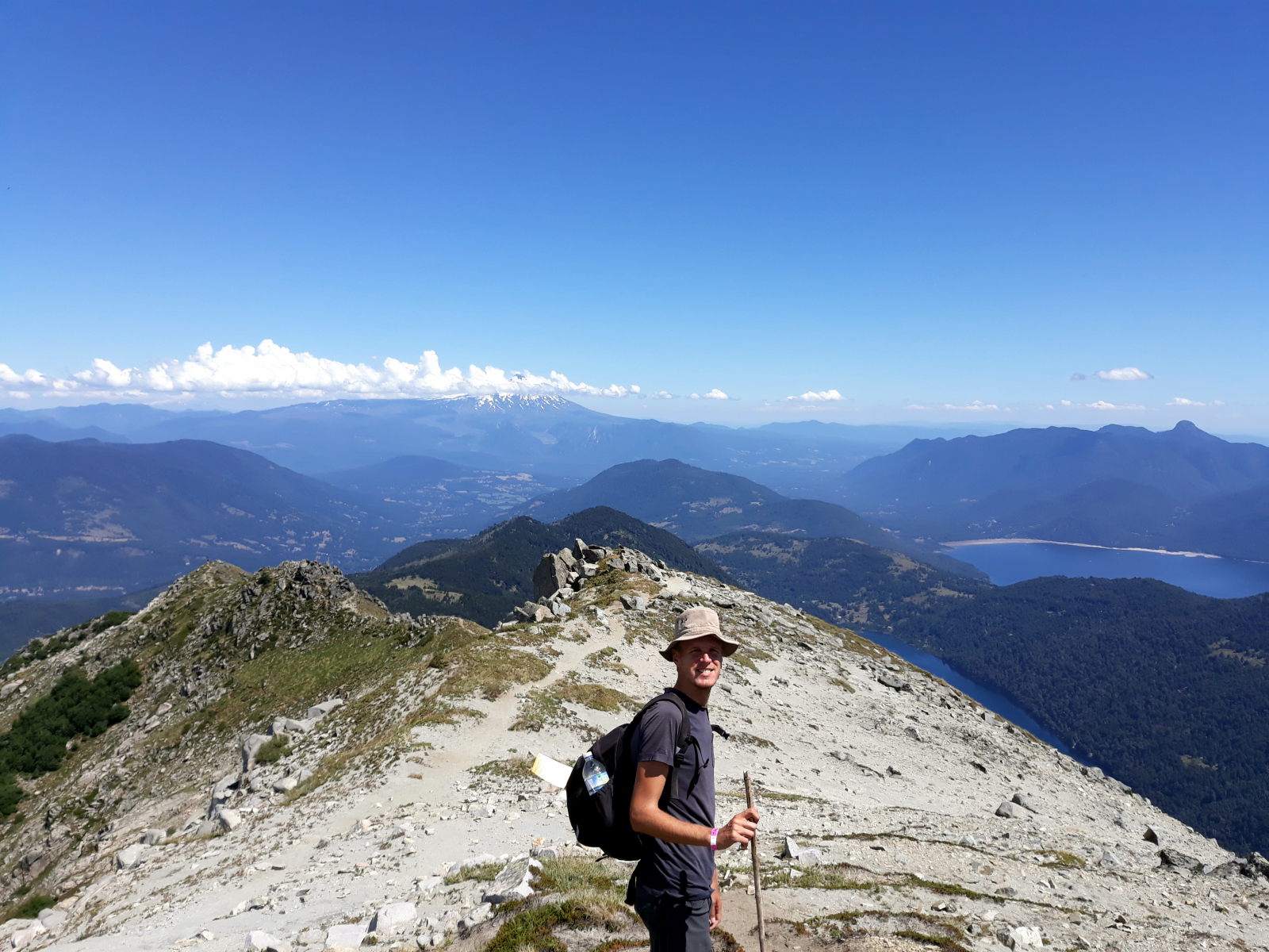 Mais une fois en haut du Cerro San Sebastian, la vue est incroyable ! Vue panoramique sur pas moins de 6 volcans ! Dommage pour nous des nuages ont désormais entouré les volcans au loin mais la vue reste magique. On aperçoit également en bas les lacs du parc. Il nous aura fallu 3h30 de montée environ et 2h45 de descente. La descente, bien que plus rapide, n’en reste pas moins « traître ». Attention aux genoux !