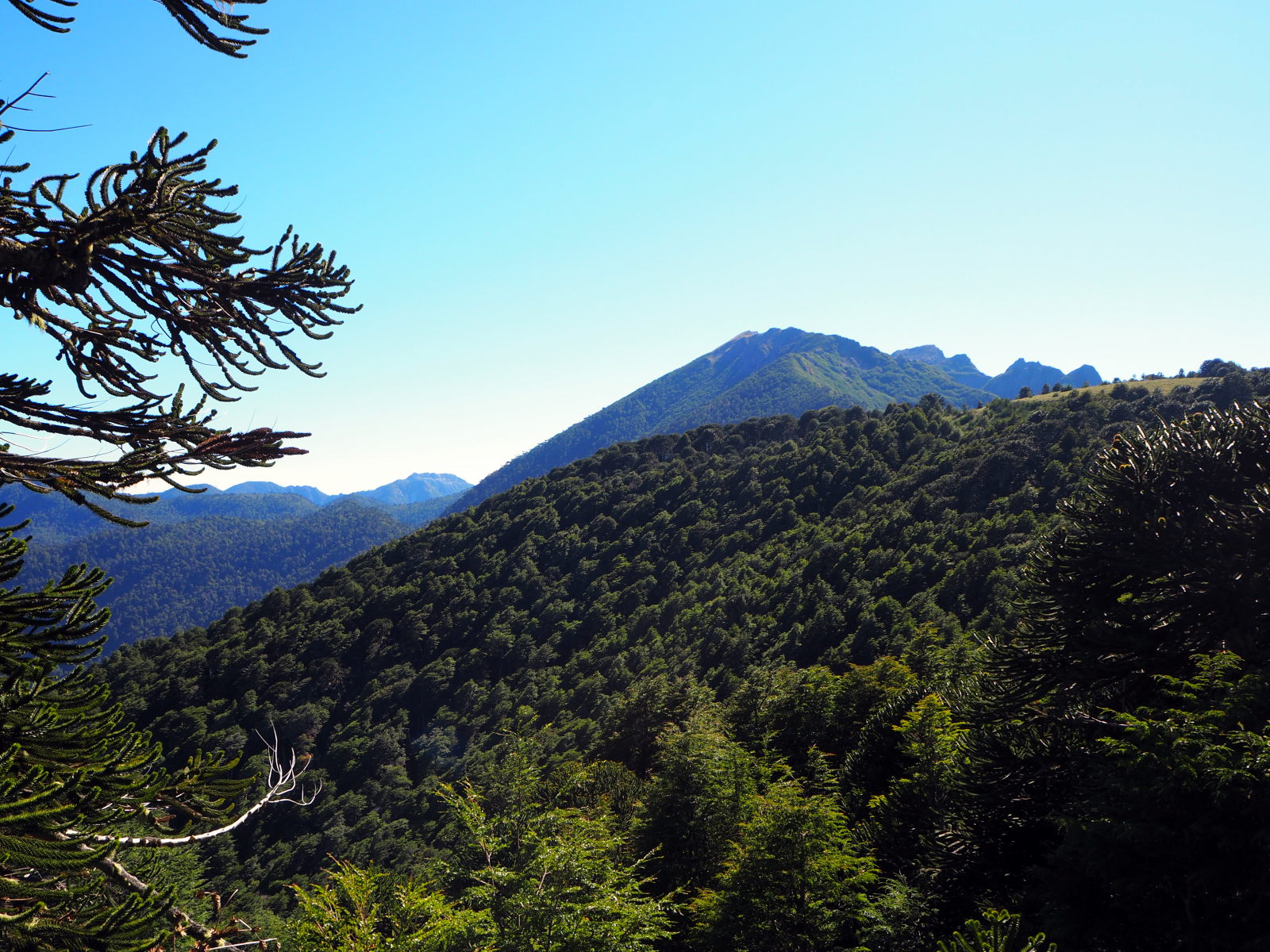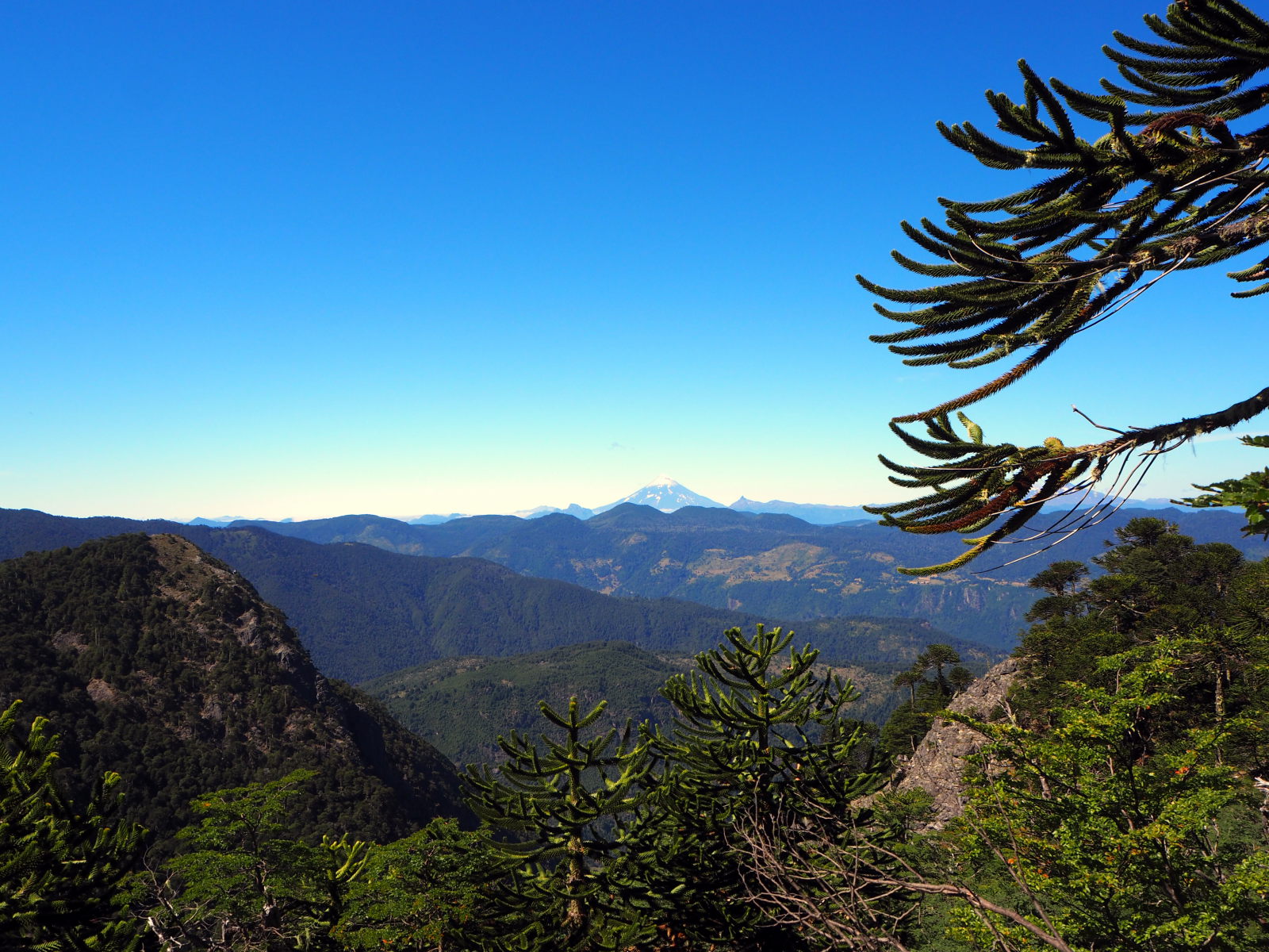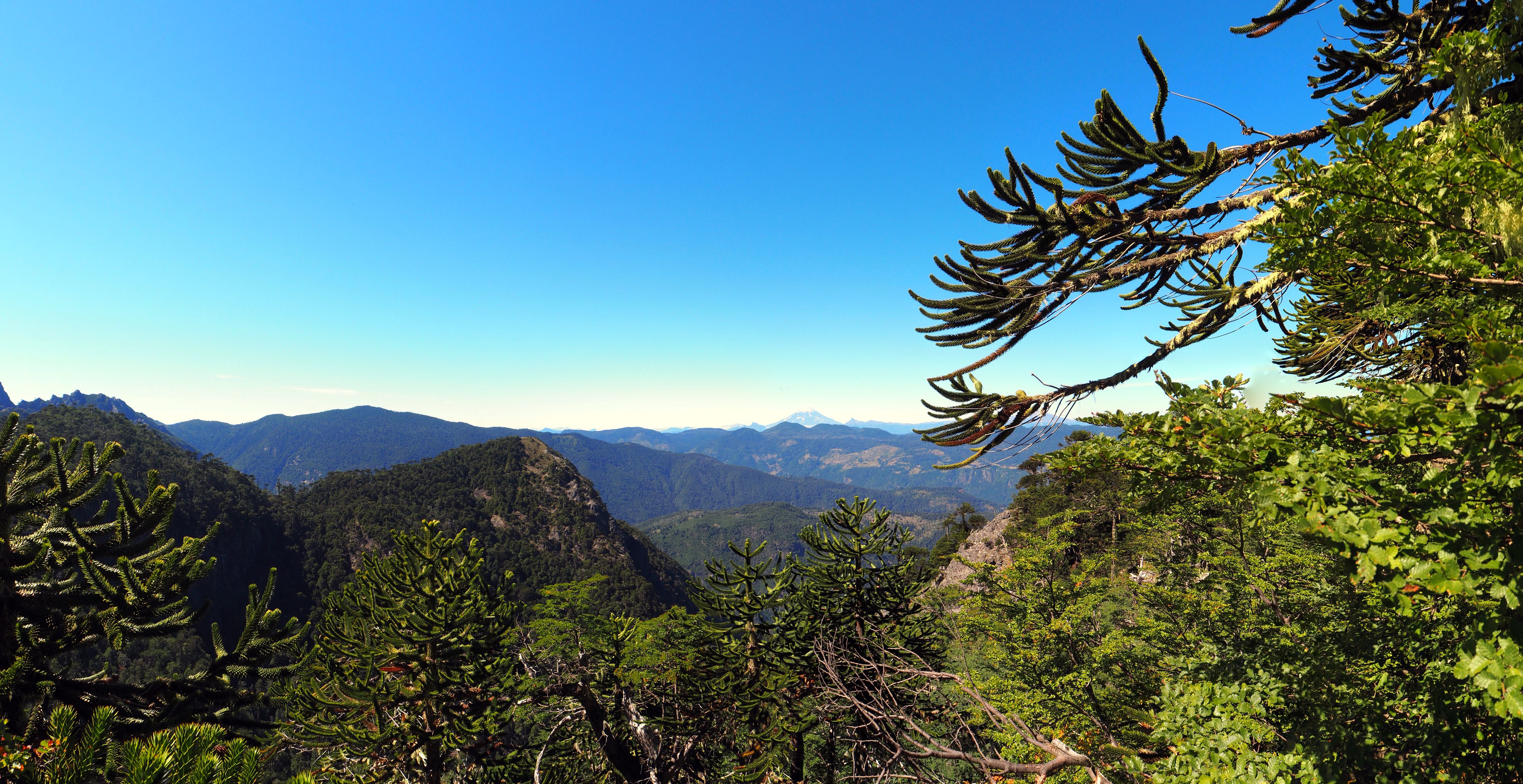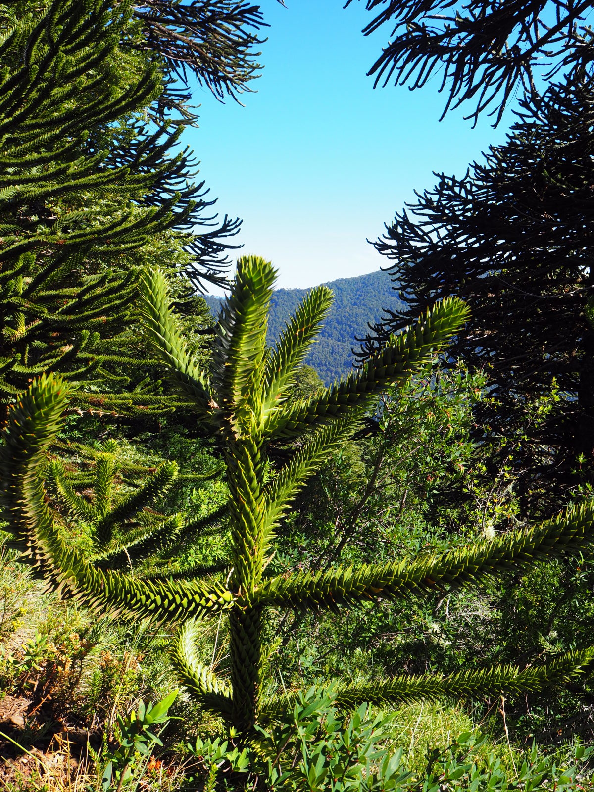 Dès le début ça monte assez raide dans la foret. Comme le chemin est bordé de bambous, on se fabrique des bâtons de marche pour nous aider à progresser. Heureusement, les points de vue pendant la montée sont nombreux et offrent de belles récompenses. On découvre également les fameux arbres Araucaria, typiques du coin. On dirait un croisement entre un sapin et un cactus. Puis nous arrivons sur un semi-plat qui offre une superbe vue sur les environs et quelques volcans !