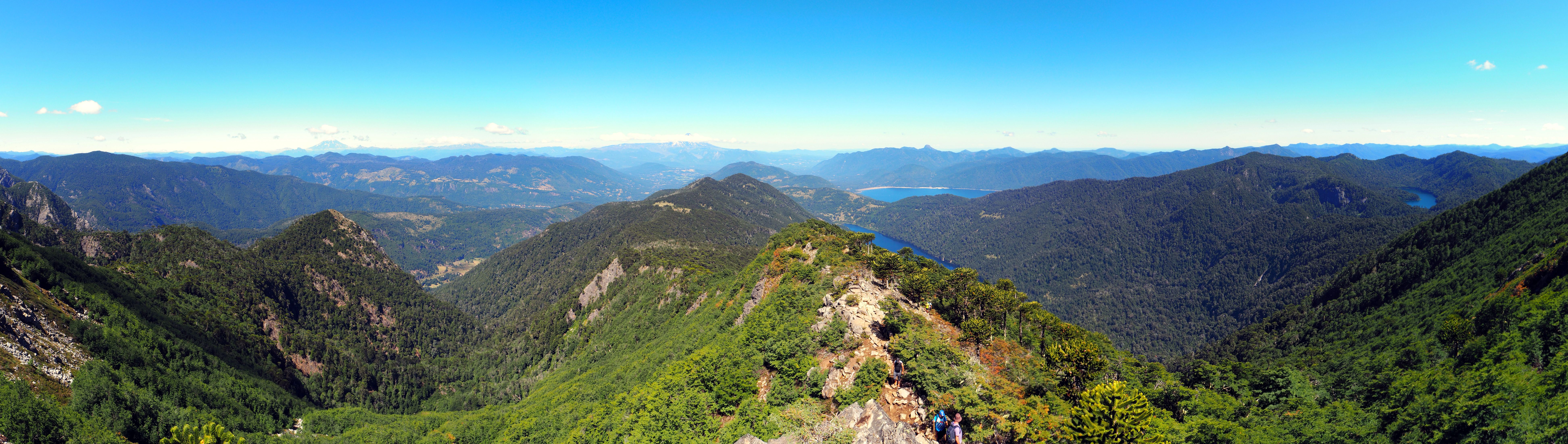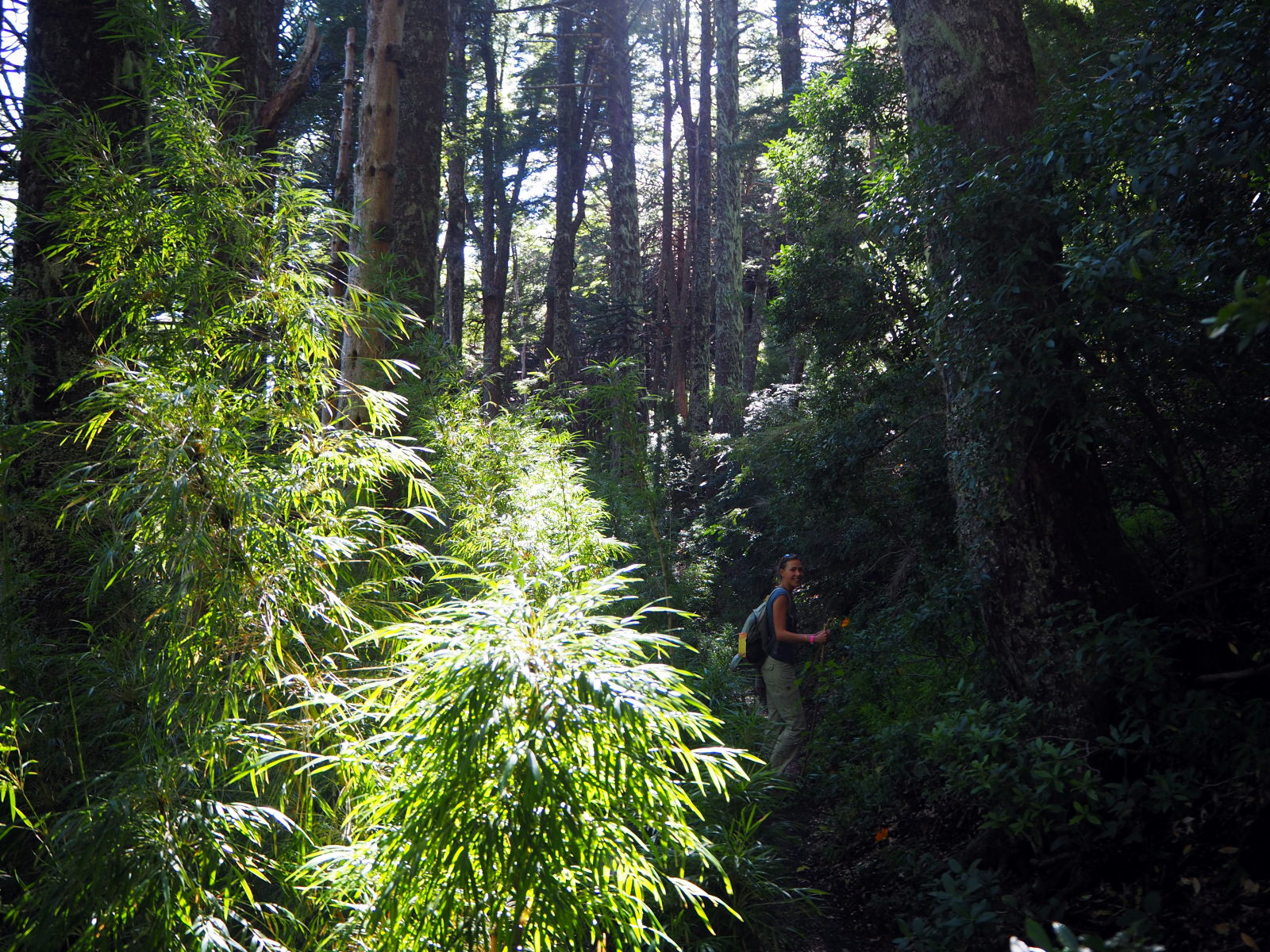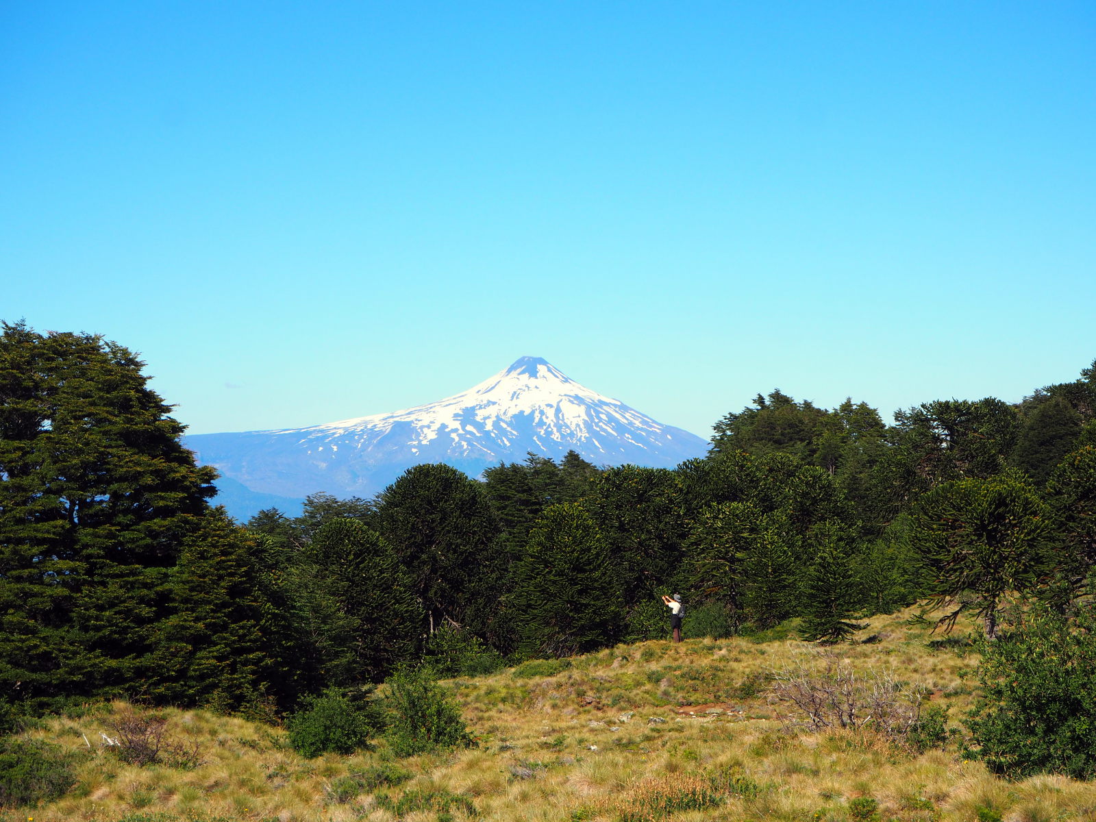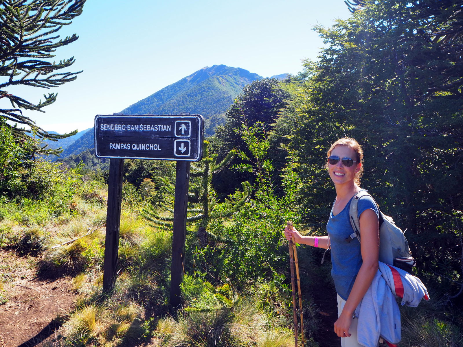 Dès le début ça monte assez raide dans la foret. Comme le chemin est bordé de bambous, on se fabrique des bâtons de marche pour nous aider à progresser. Heureusement, les points de vue pendant la montée sont nombreux et offrent de belles récompenses. On découvre également les fameux arbres Araucaria, typiques du coin. On dirait un croisement entre un sapin et un cactus. Puis nous arrivons sur un semi-plat qui offre une superbe vue sur les environs et quelques volcans !