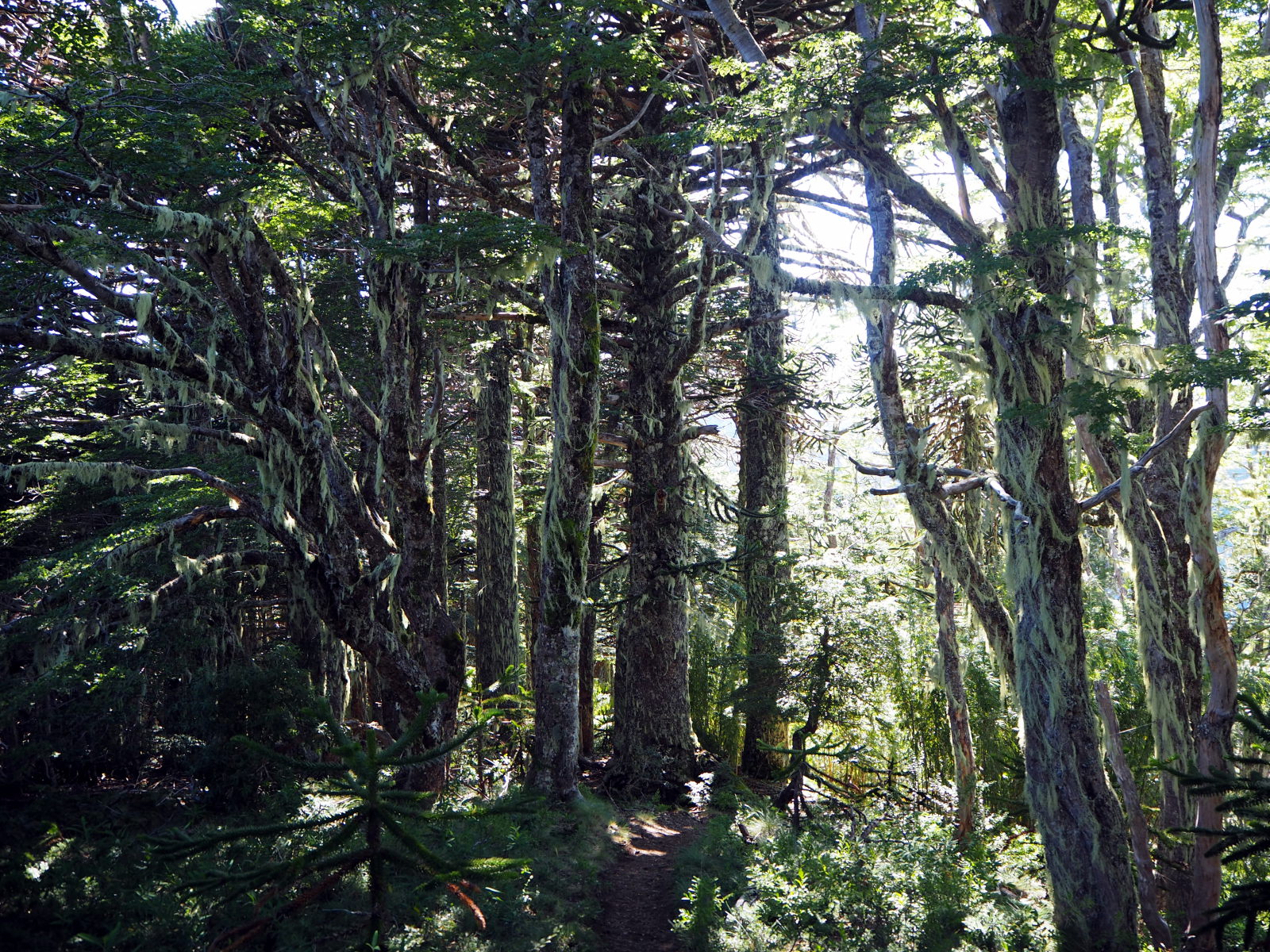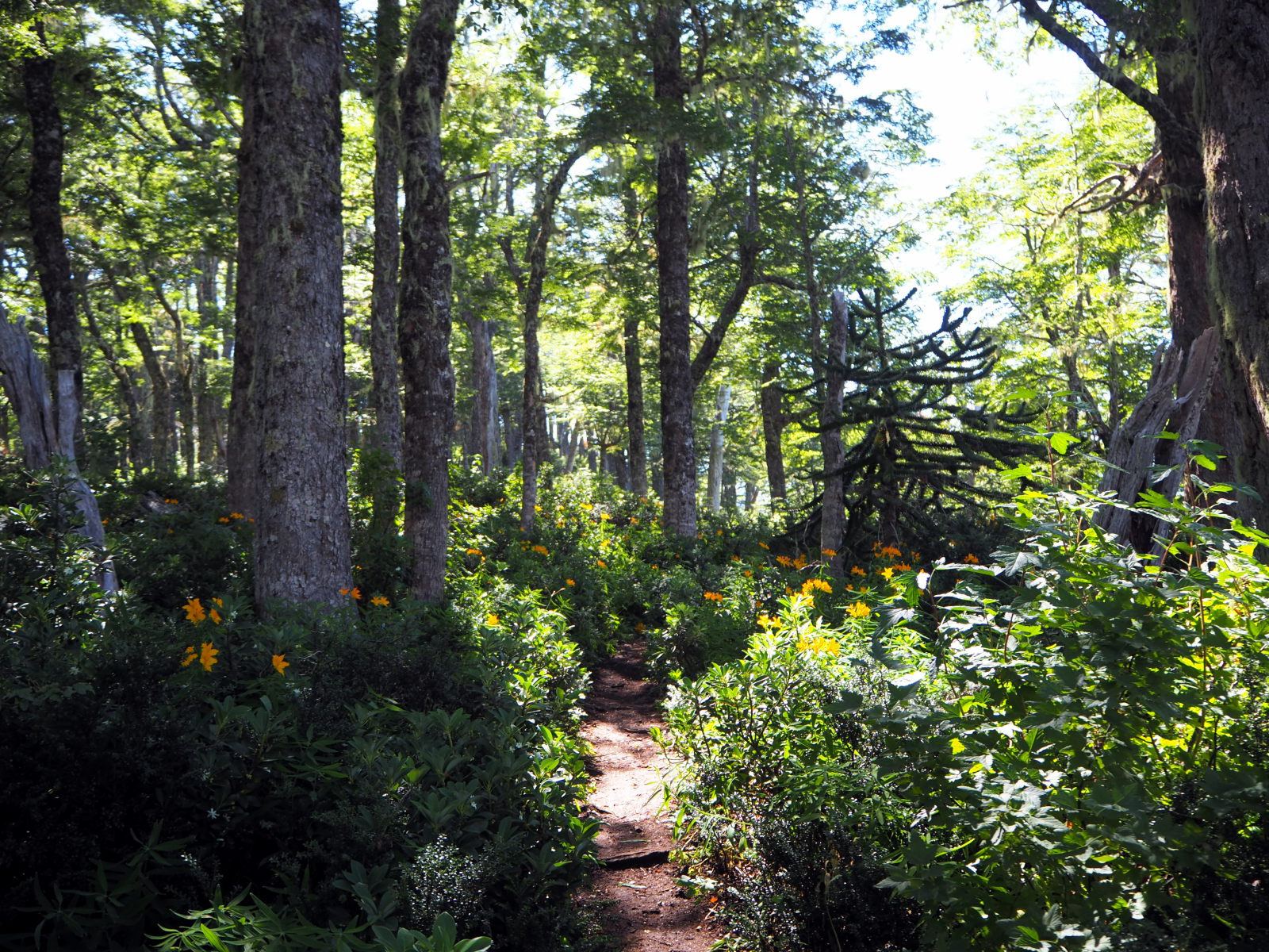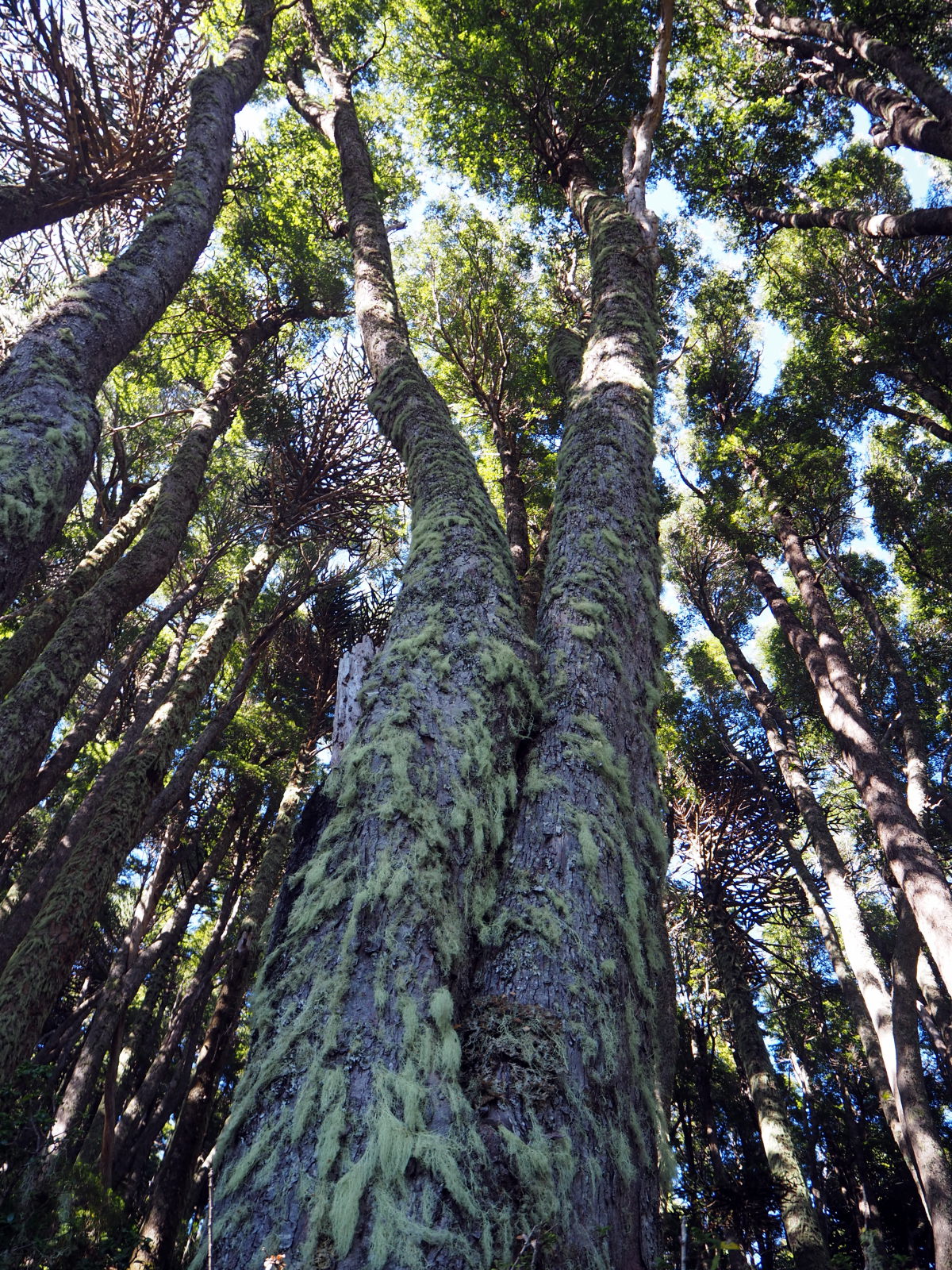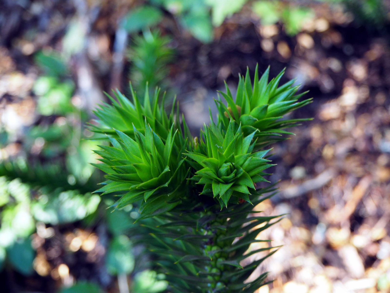 Dès le début ça monte assez raide dans la foret. Comme le chemin est bordé de bambous, on se fabrique des bâtons de marche pour nous aider à progresser. Heureusement, les points de vue pendant la montée sont nombreux et offrent de belles récompenses. On découvre également les fameux arbres Araucaria, typiques du coin. On dirait un croisement entre un sapin et un cactus. Puis nous arrivons sur un semi-plat qui offre une superbe vue sur les environs et quelques volcans !