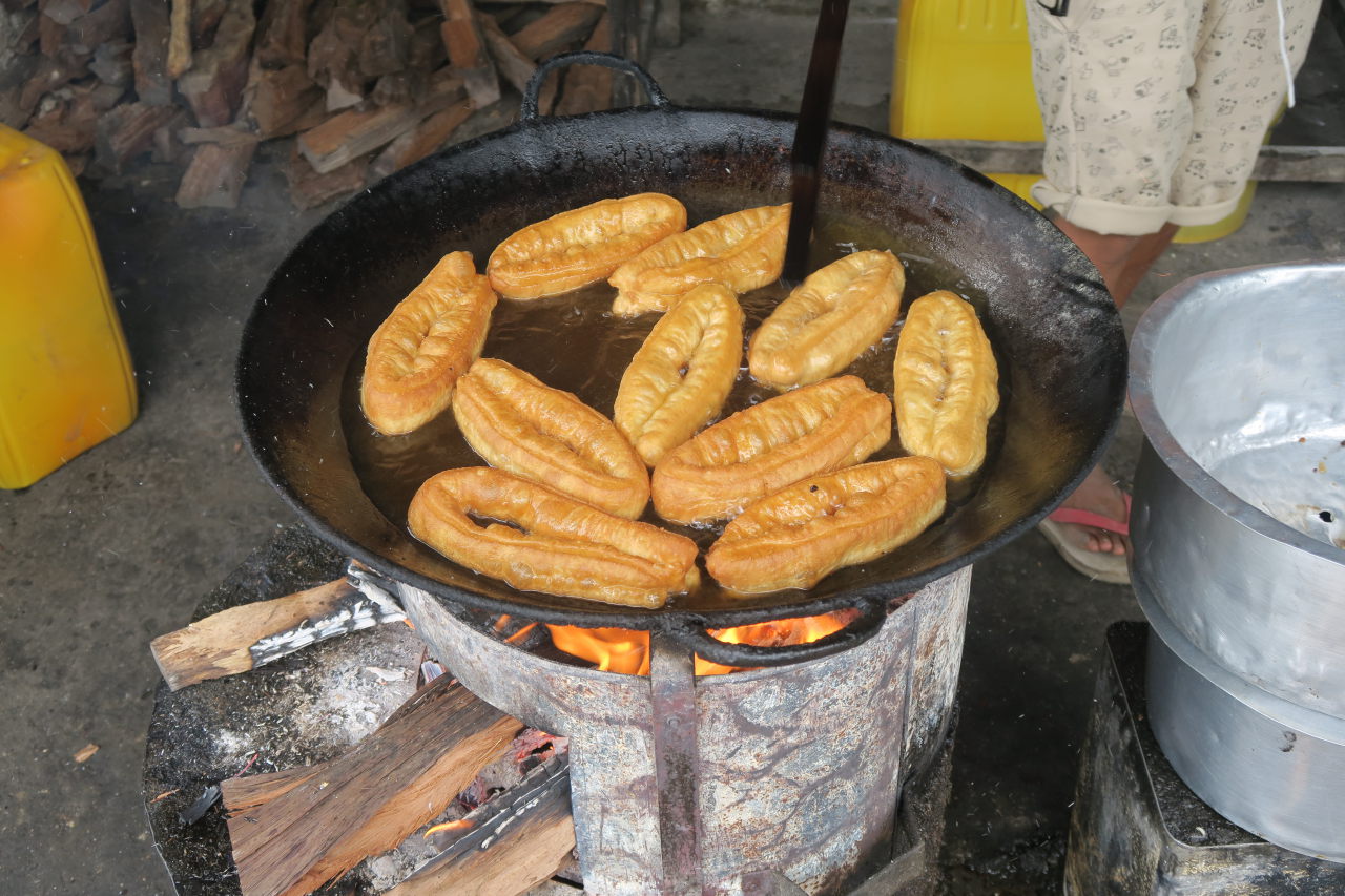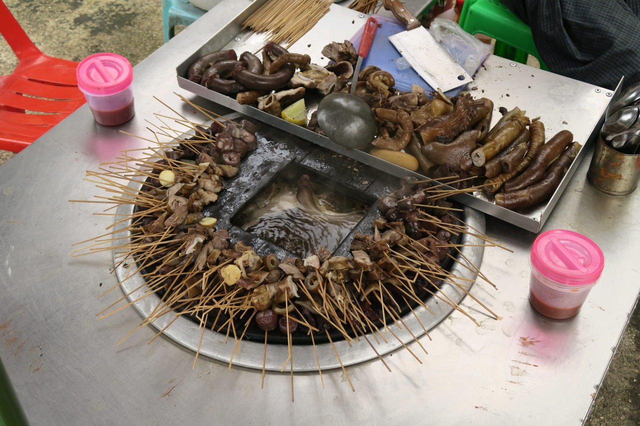 Cuisson de différents abats (de poulet ?), il suffit de choisir sa brochette et de la plonger dans l’huile bouillante au centre