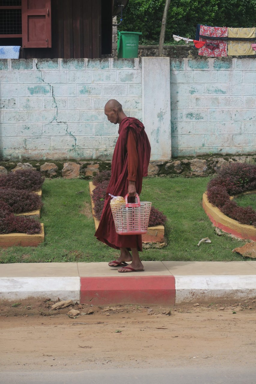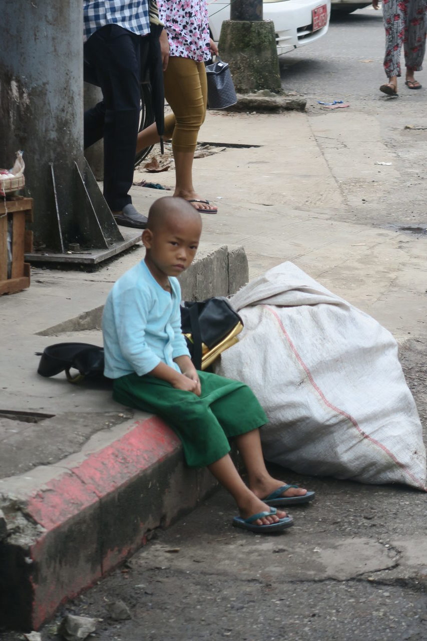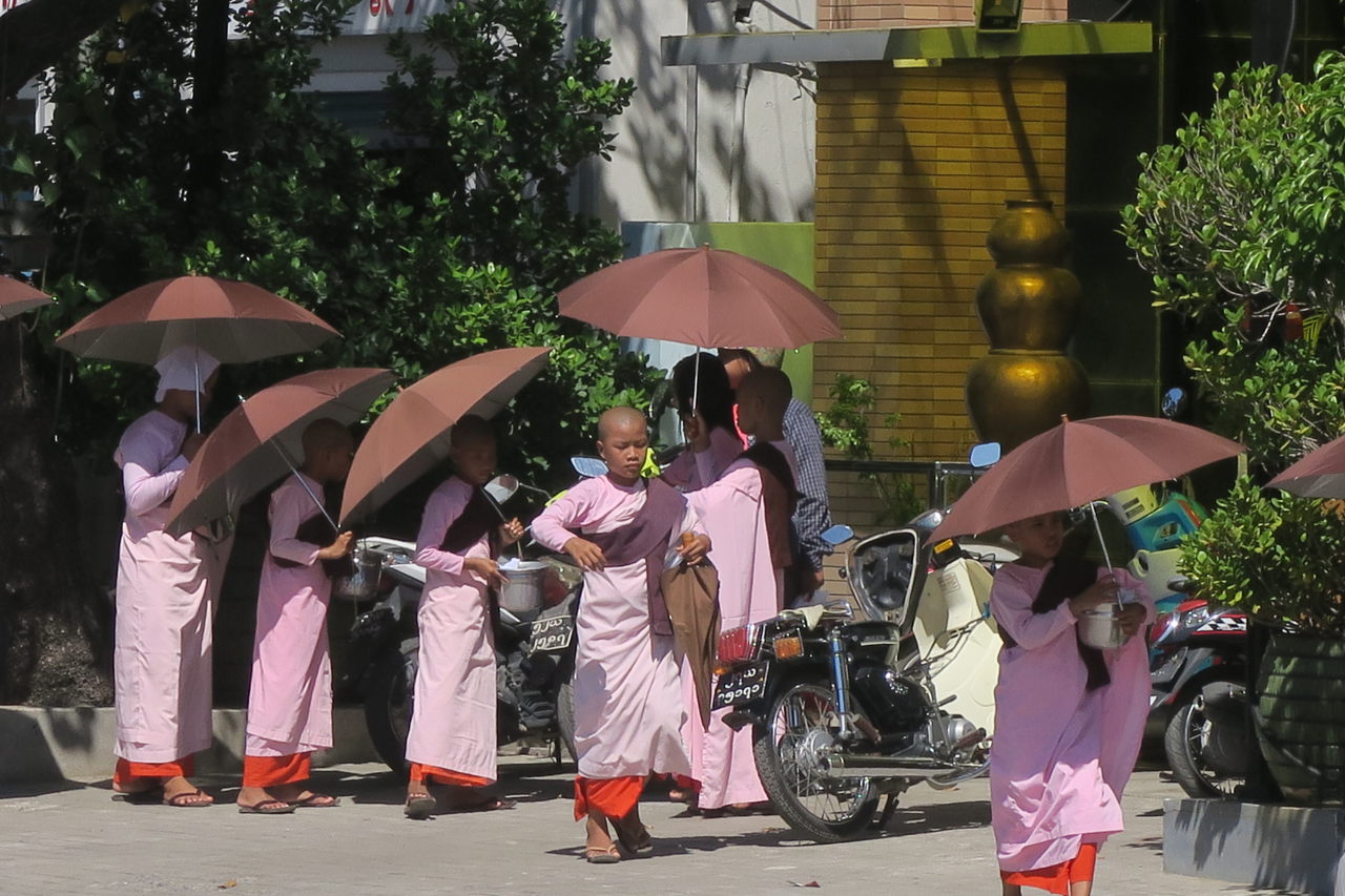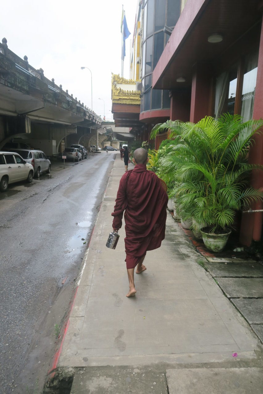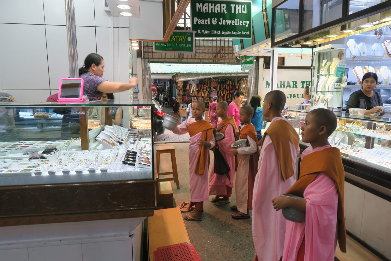 Des moines faisant la quête dans les stands du marché de Bogyoke
