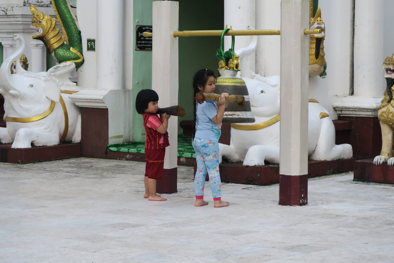 Julien fait sonner une cloche dans l’un des temples du complexe