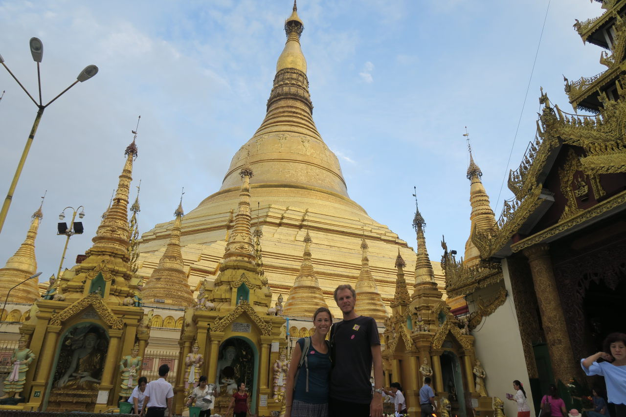 A l’intérieur de la pagode Shwedagon. La pagode centrale (bordée de ses petites pagodes) est entourée de temples