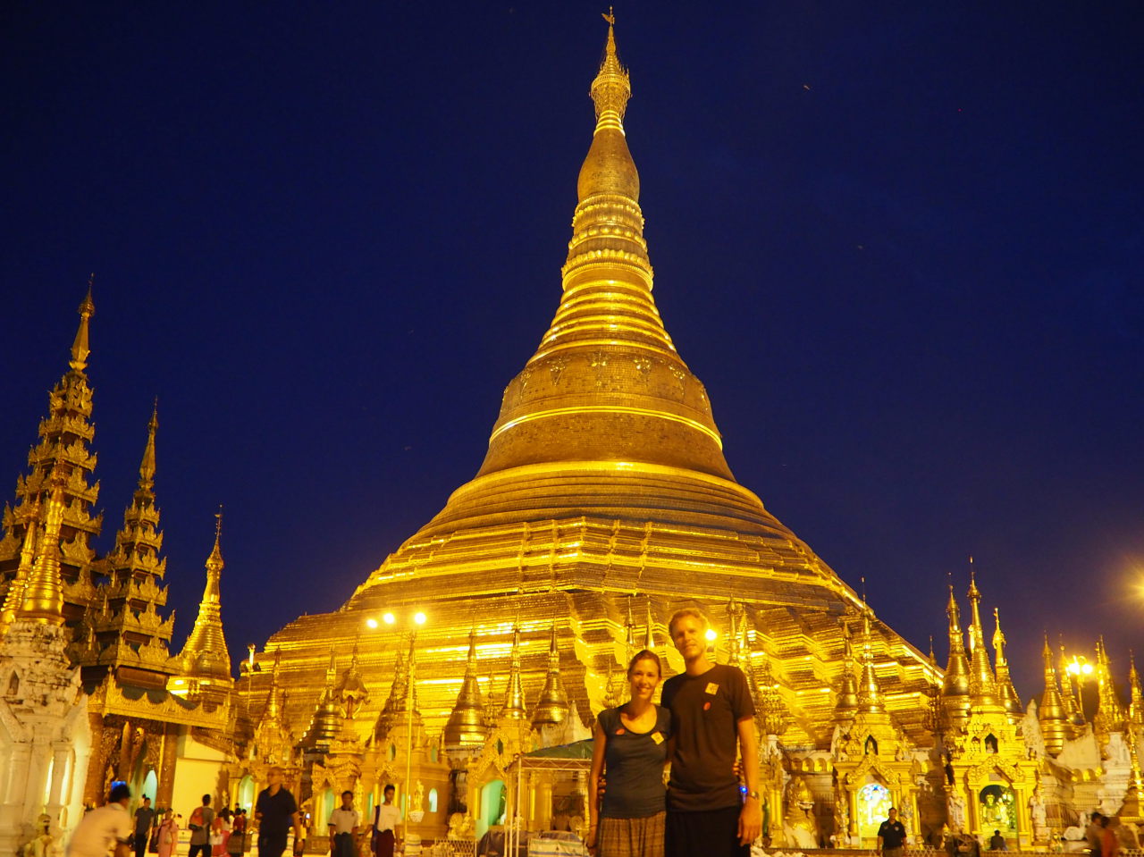 Elise et Julien devant la pagode à la tombée de la nuit