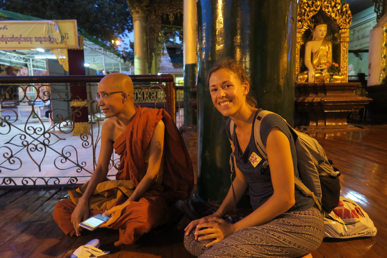 Elise qui discute avec un moine bouddhiste