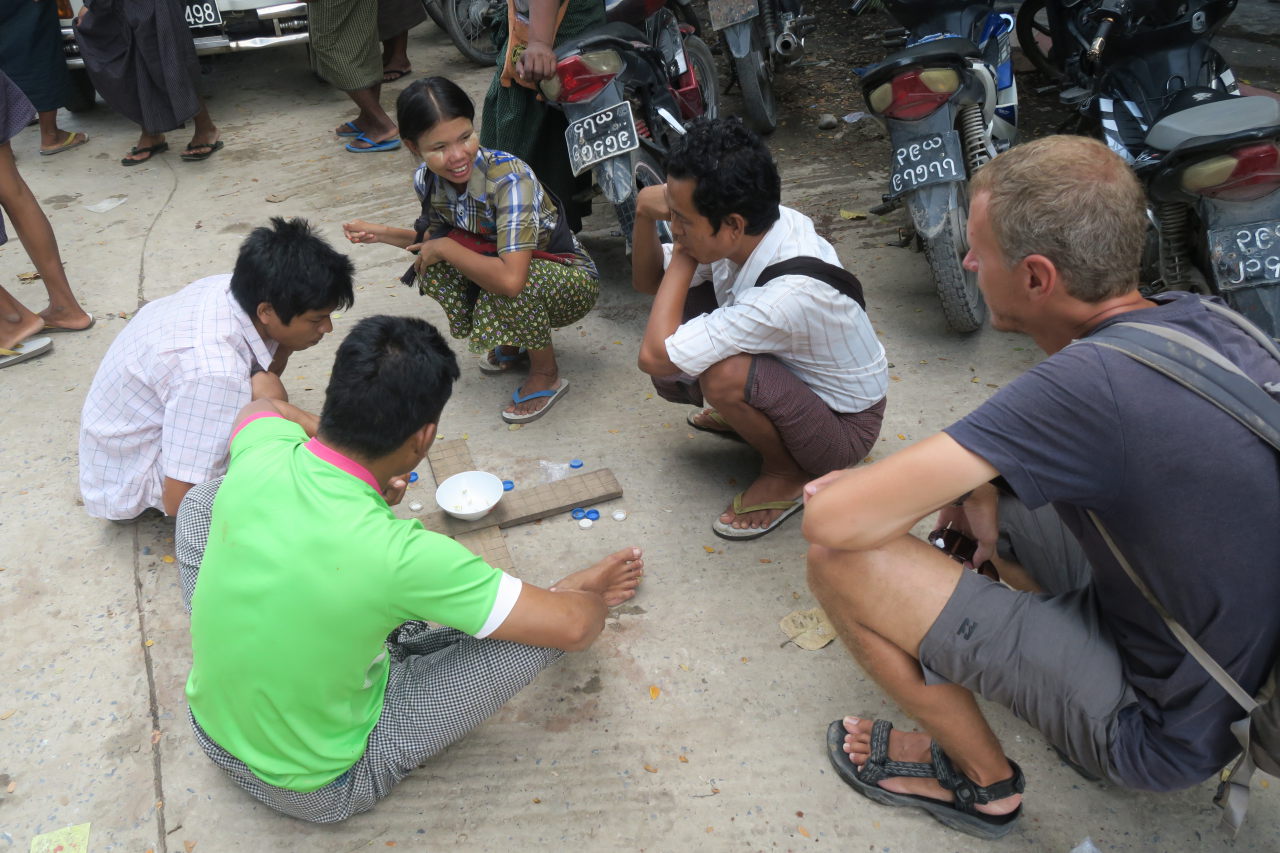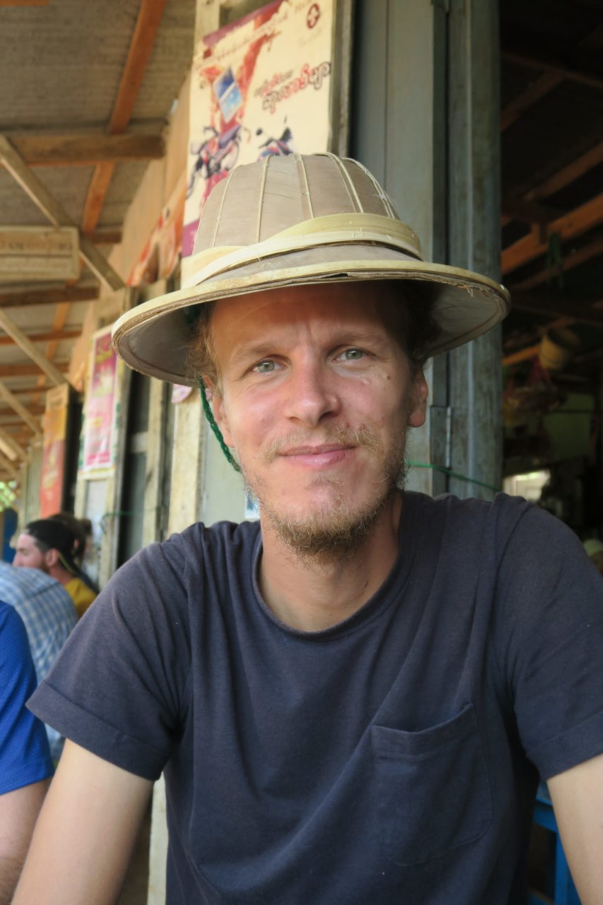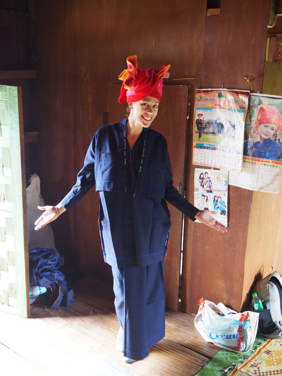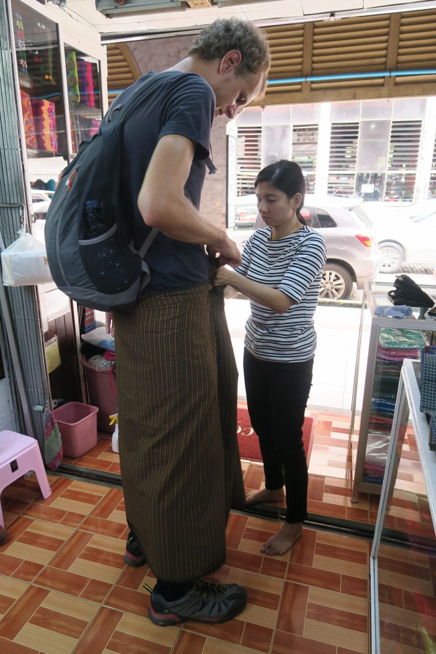 Julien essaye un « longwy », vêtement traditionel birman
