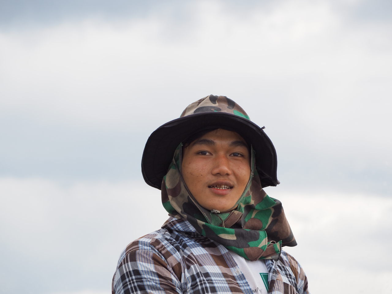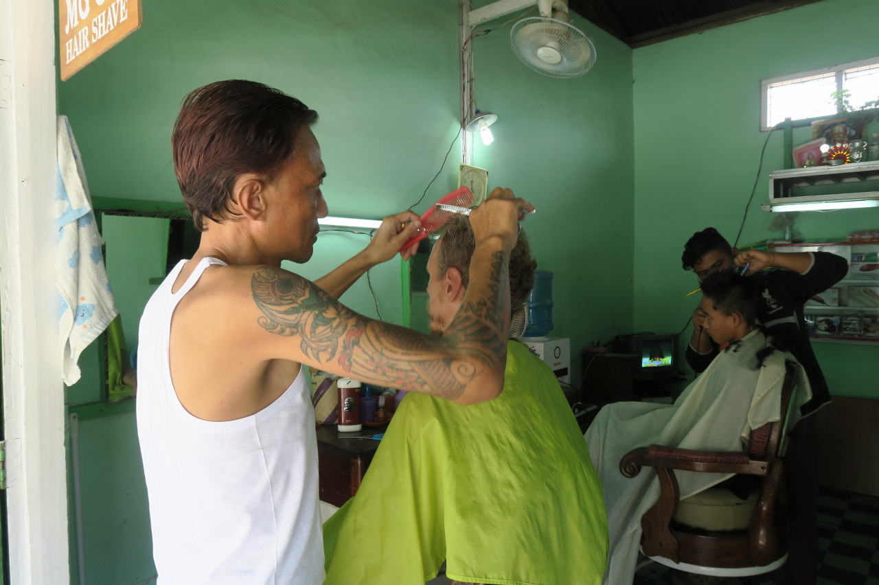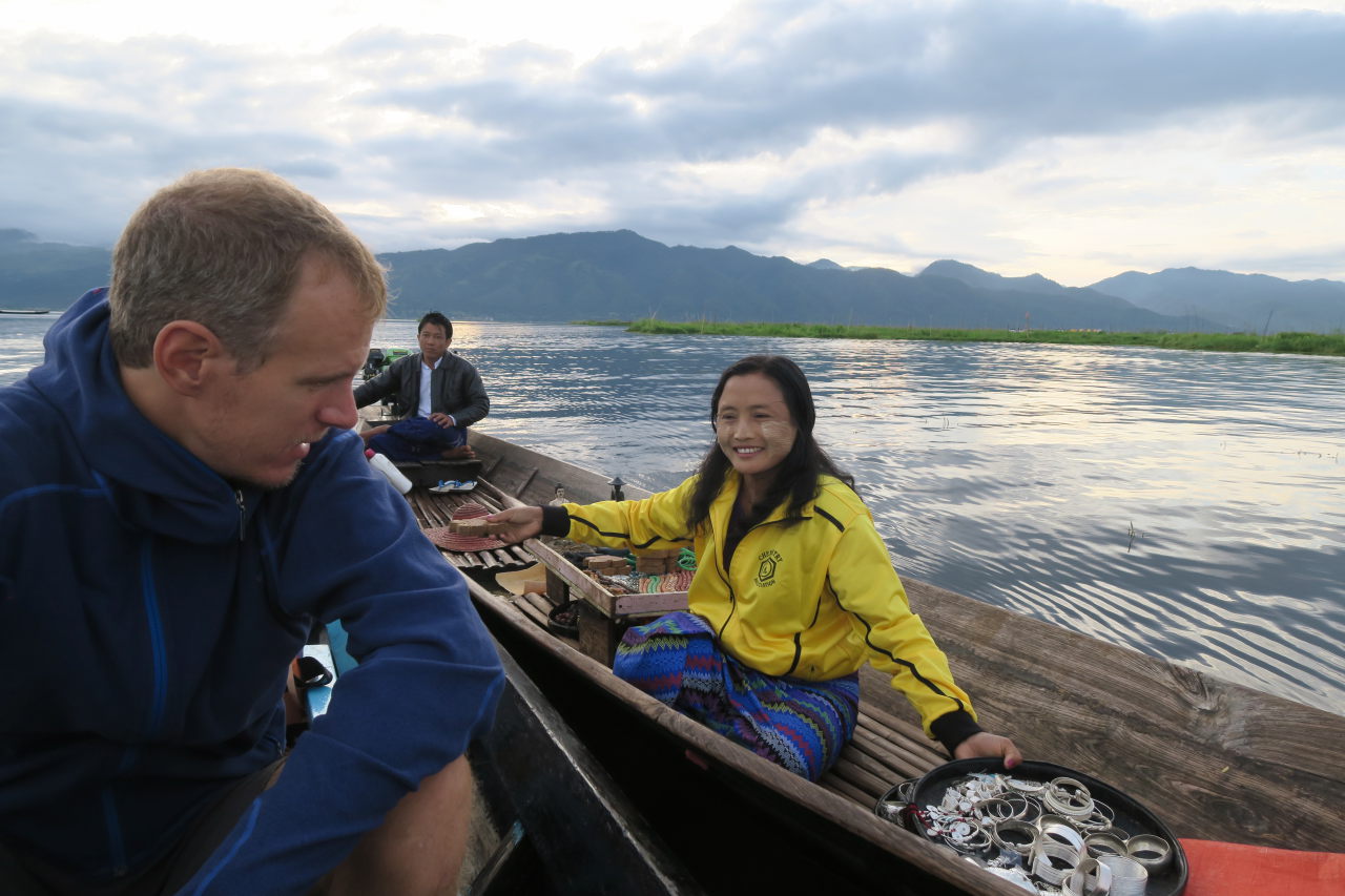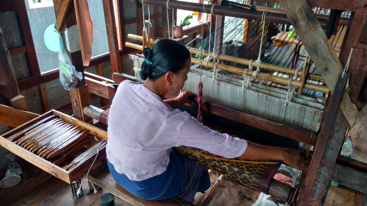 Julien essaye un « longwy », vêtement traditionel birman