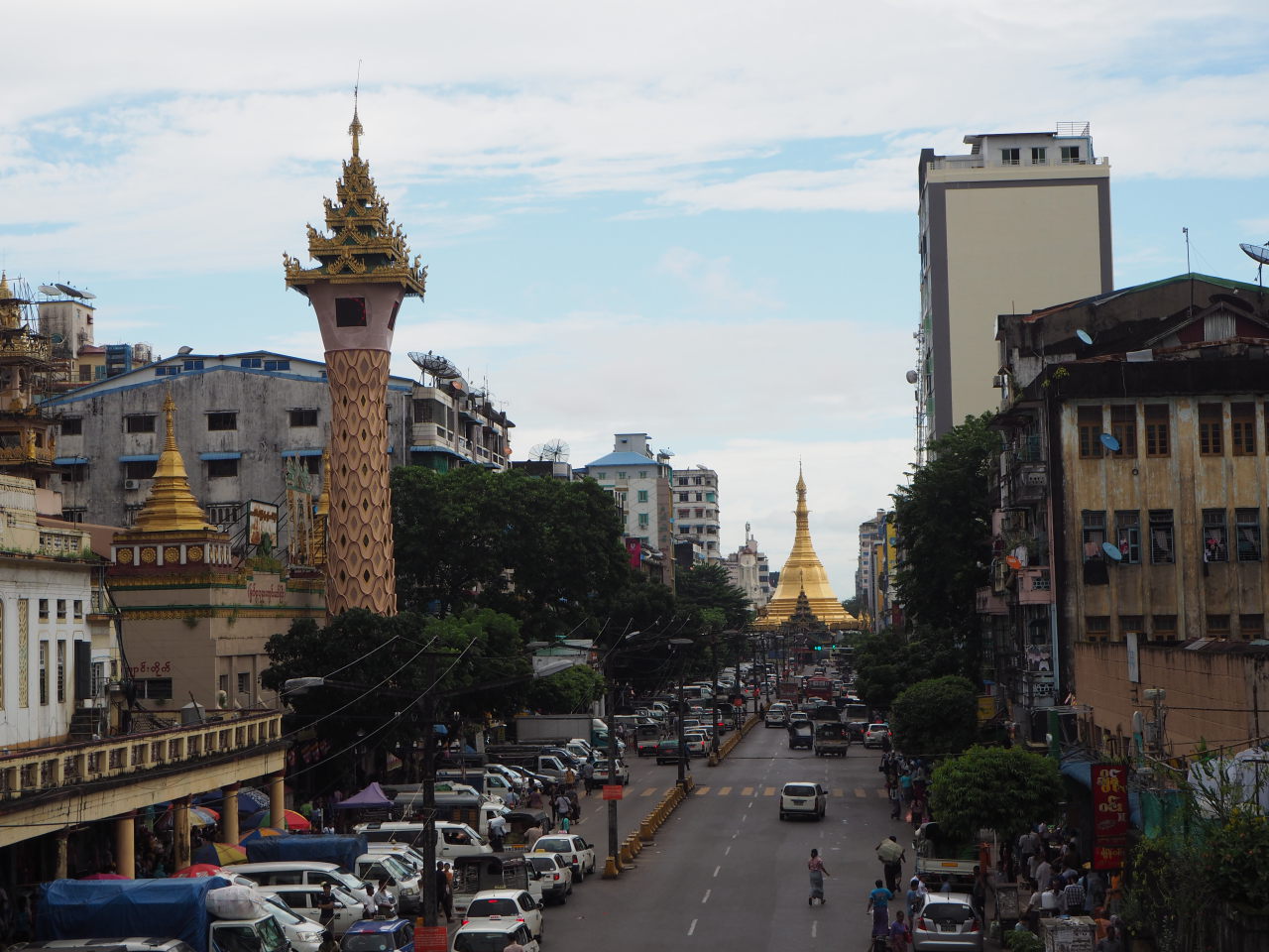 La pagode Sule vue depuis une passerelle