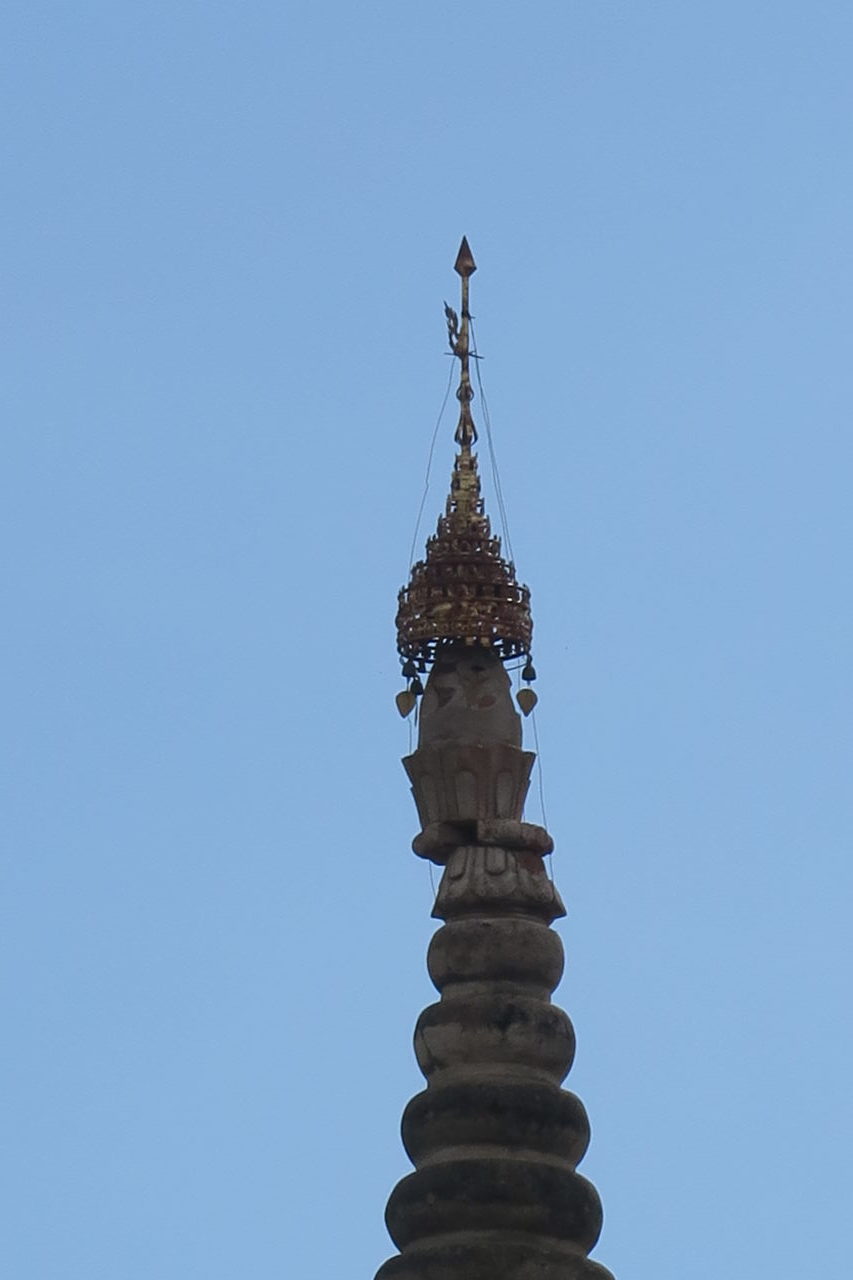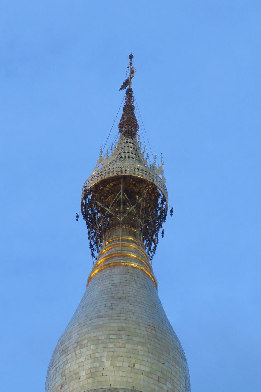 Le sommet de la pagode, composée de : l’ombrelle ornementale (qui contient les cloches), la « girouette » et le « seinbu » (sphère incrustée de pierres précieuses)