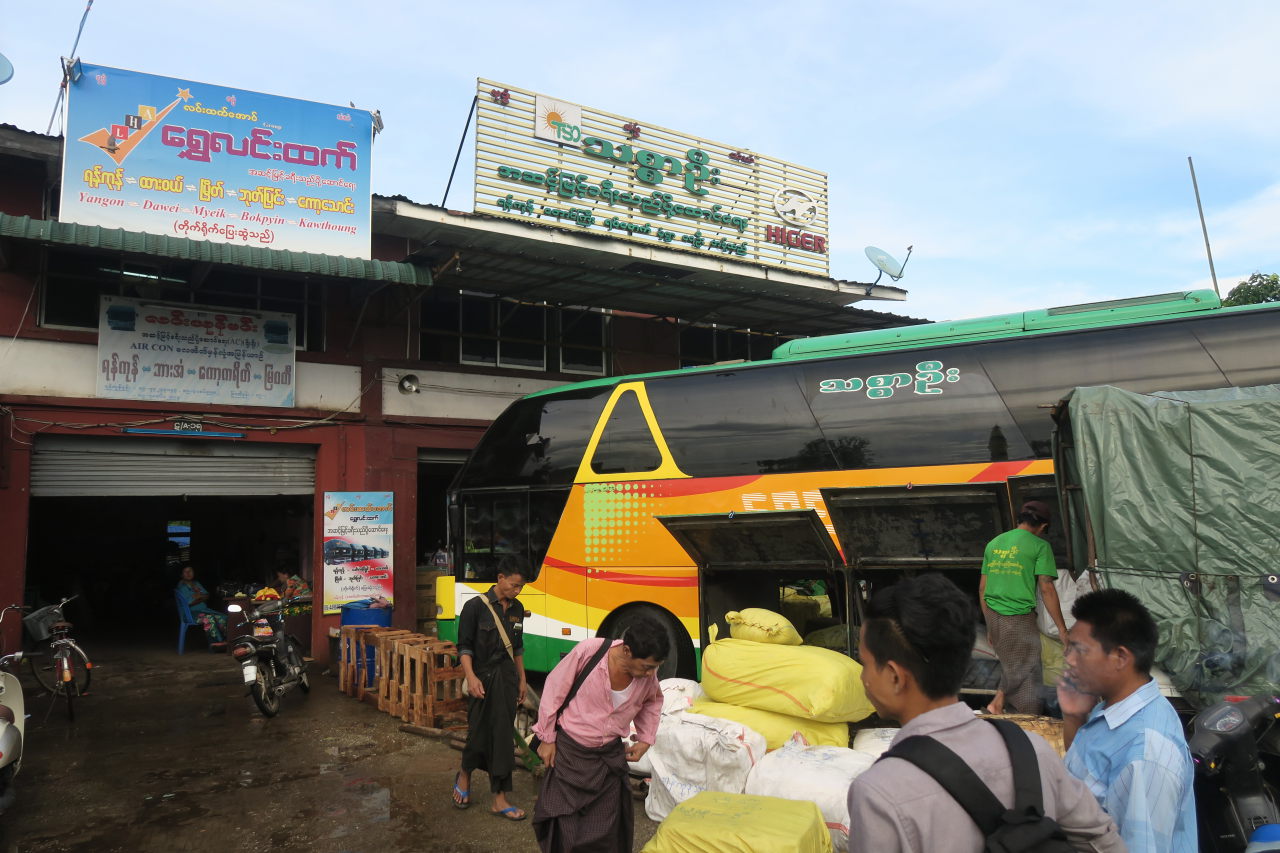 Notre « comptoir » de bus à la « highway bus station » de Yangon : un des bus en cours de chargement
