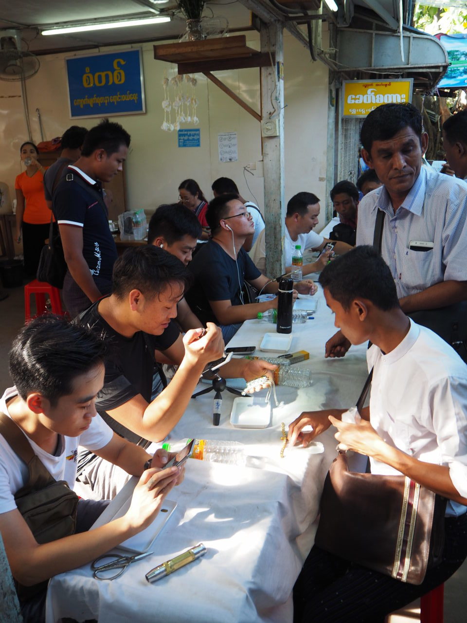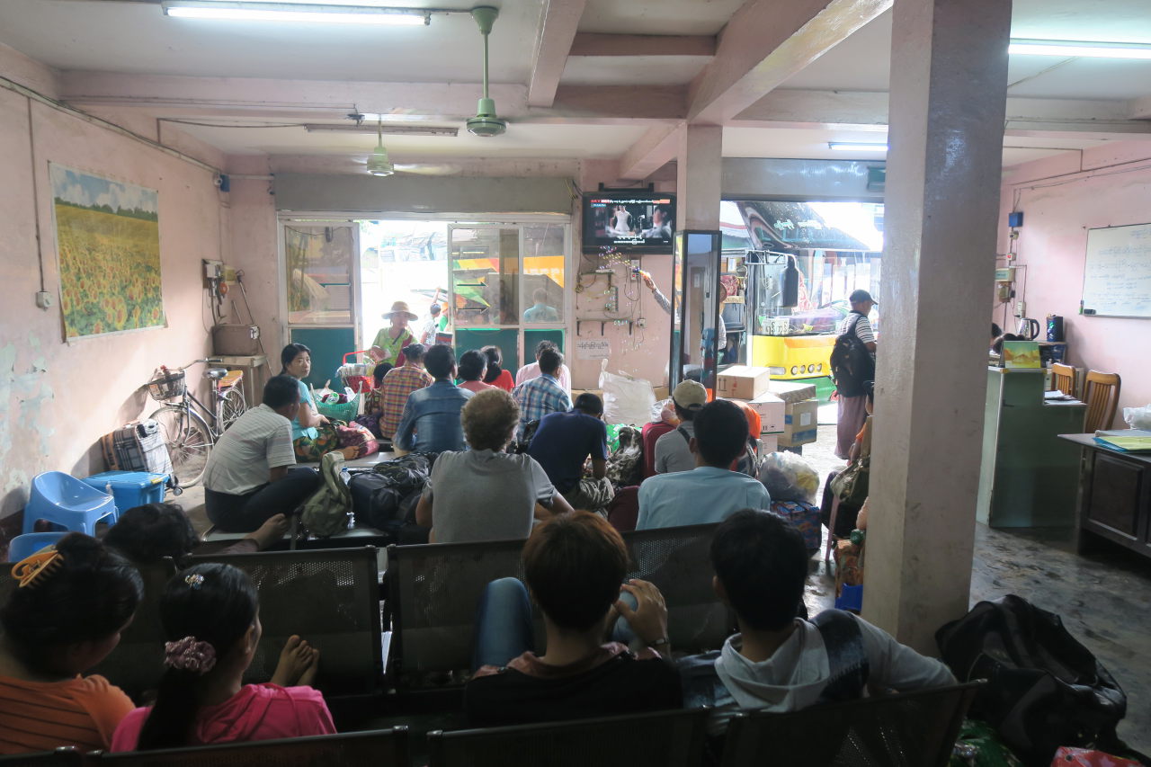 Notre « comptoir » de bus à la « highway bus station » de Yangon : vue sur la salle d’attente