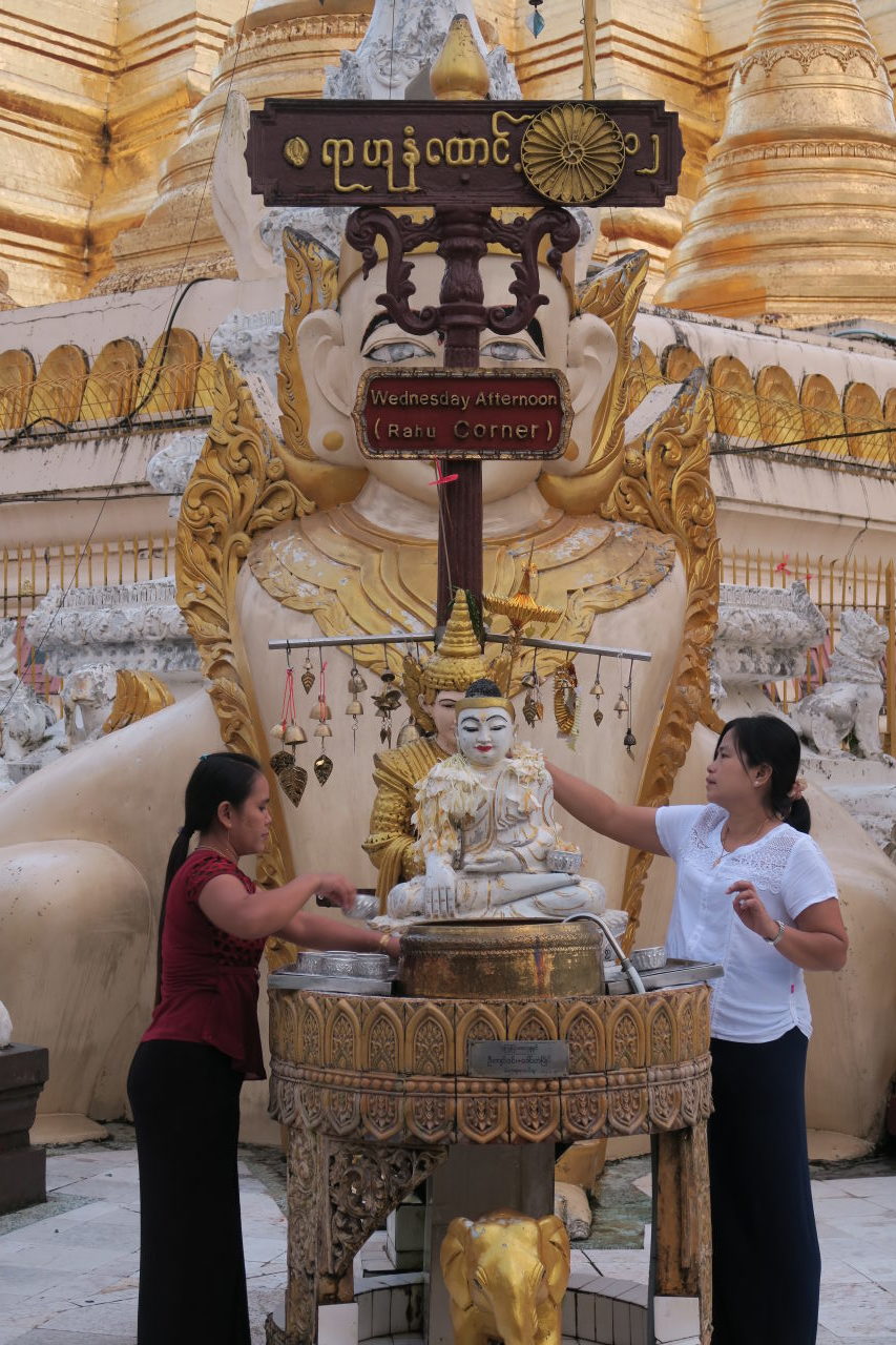 Tout autour de la pagode, différents « coins » nommés comme les jours de la semaine (ici le « Wednesday corner »). Les croyants sélectionnent le jour de leur naissance et viennent arroser le Buddha selon un rituel précis, afin de se porter chance