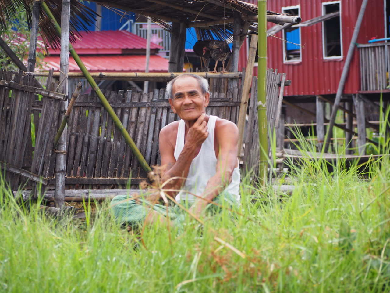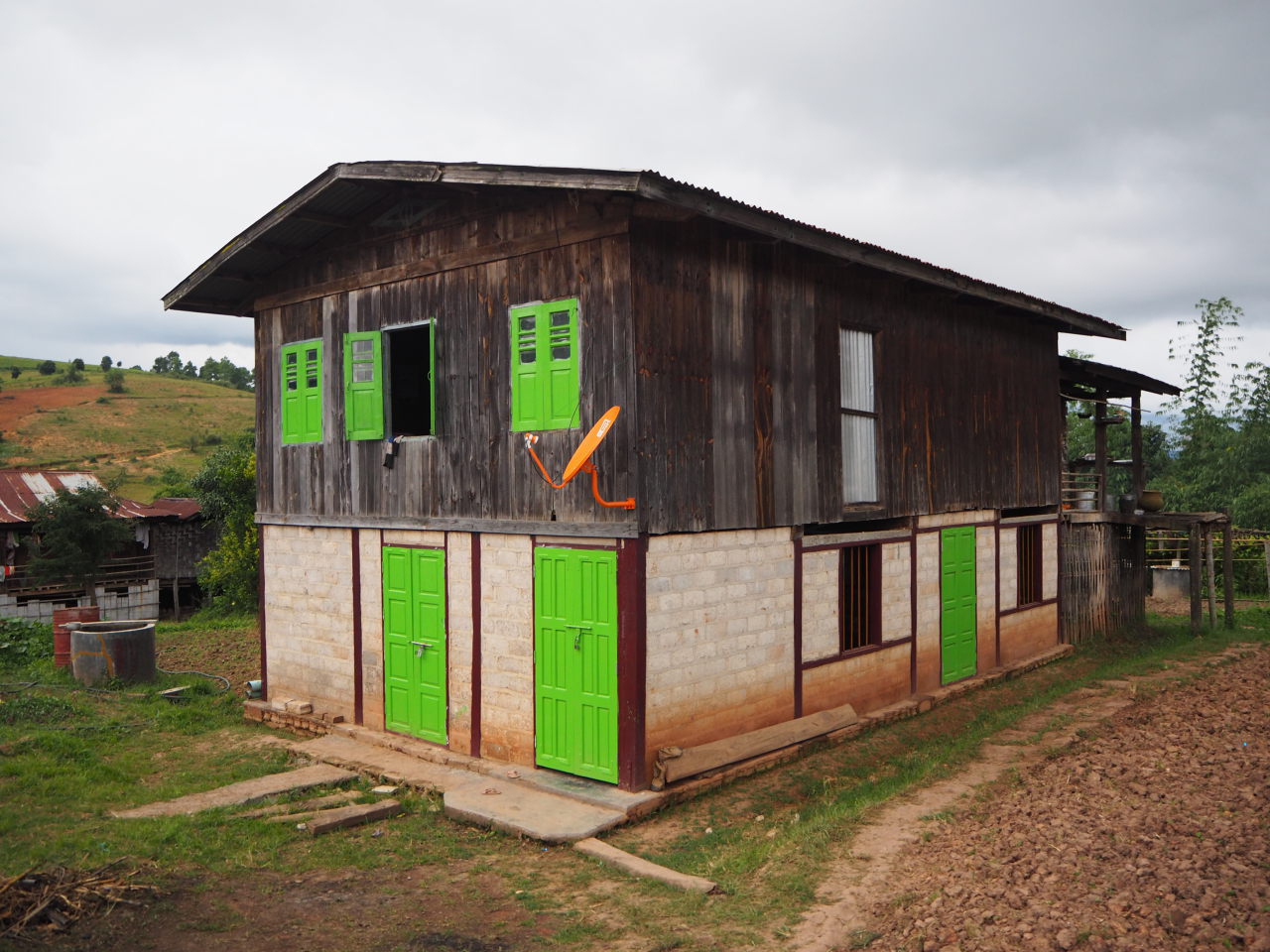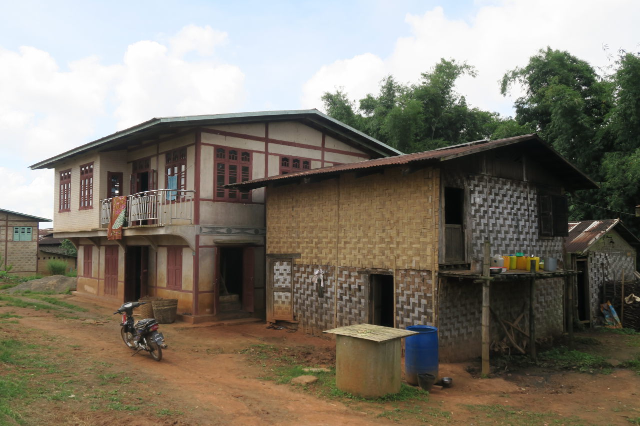 Ici les maisons sont traditionnellement en bambou (à droite), puis avec le temps (et l’argent) certaines famille arrivent à construire « en dur » (à gauche)