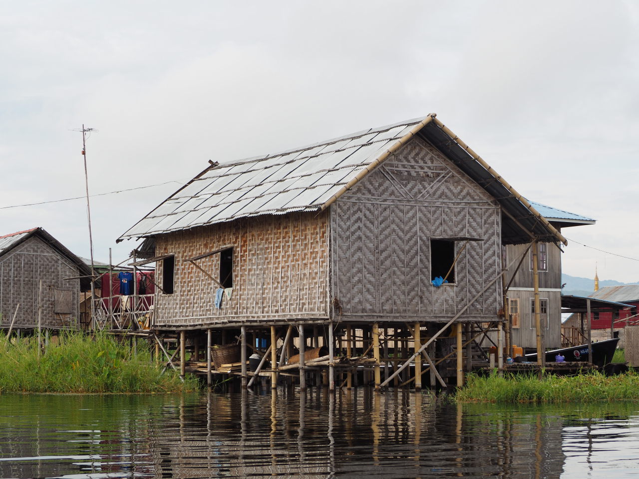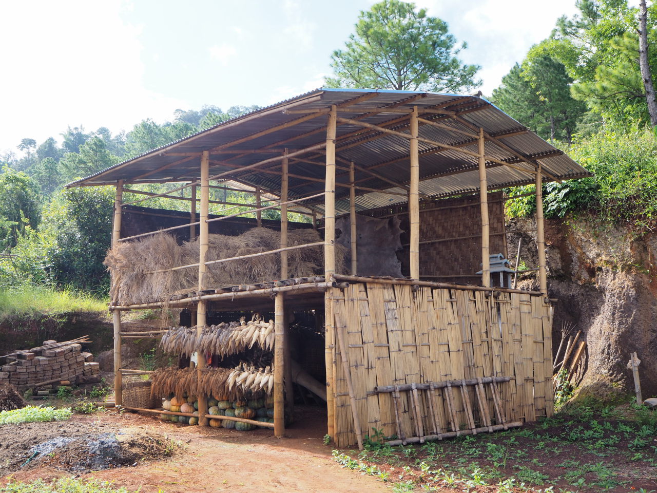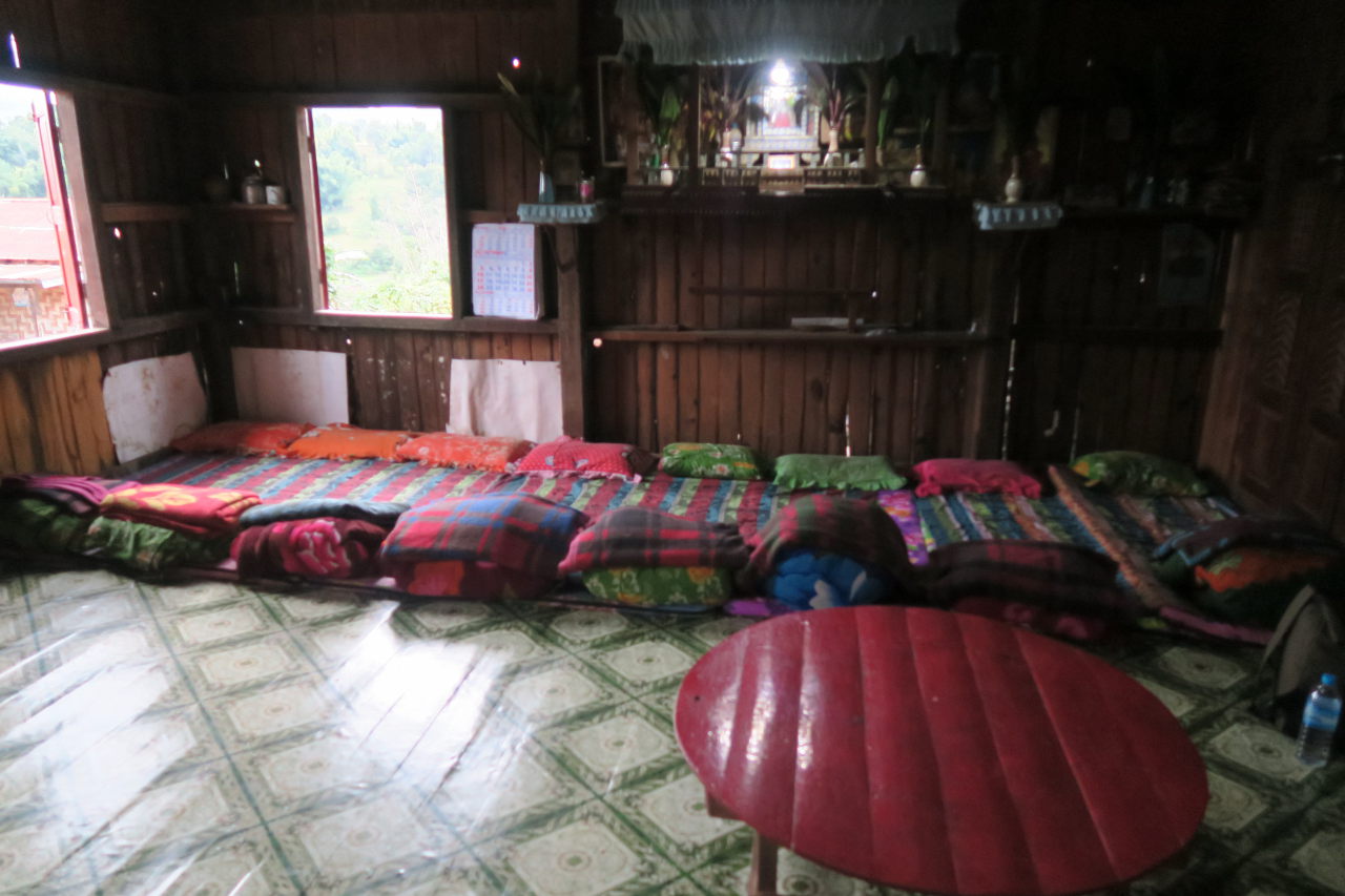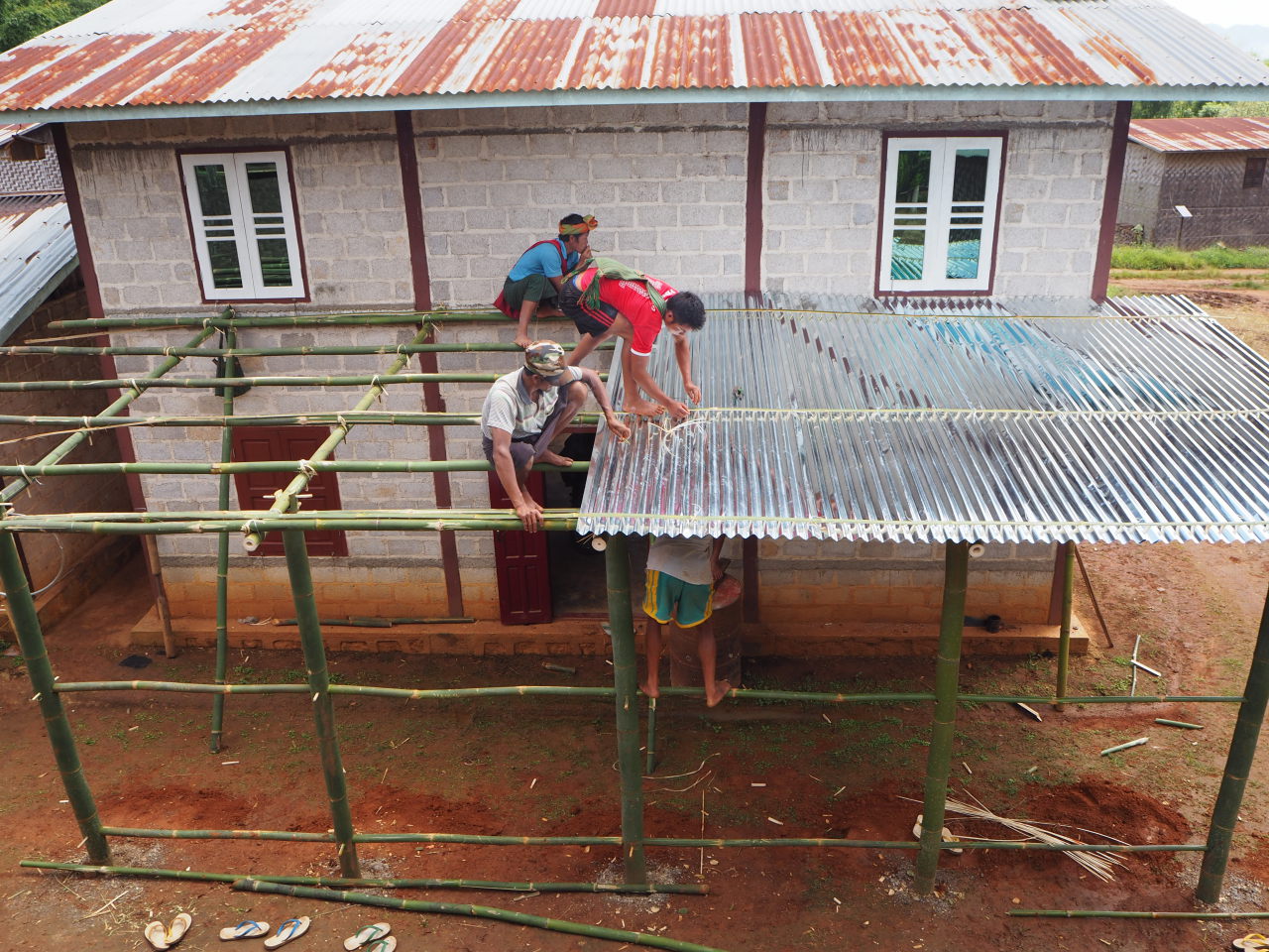 Ici les maisons sont traditionnellement en bambou (à droite), puis avec le temps (et l’argent) certaines famille arrivent à construire « en dur » (à gauche)