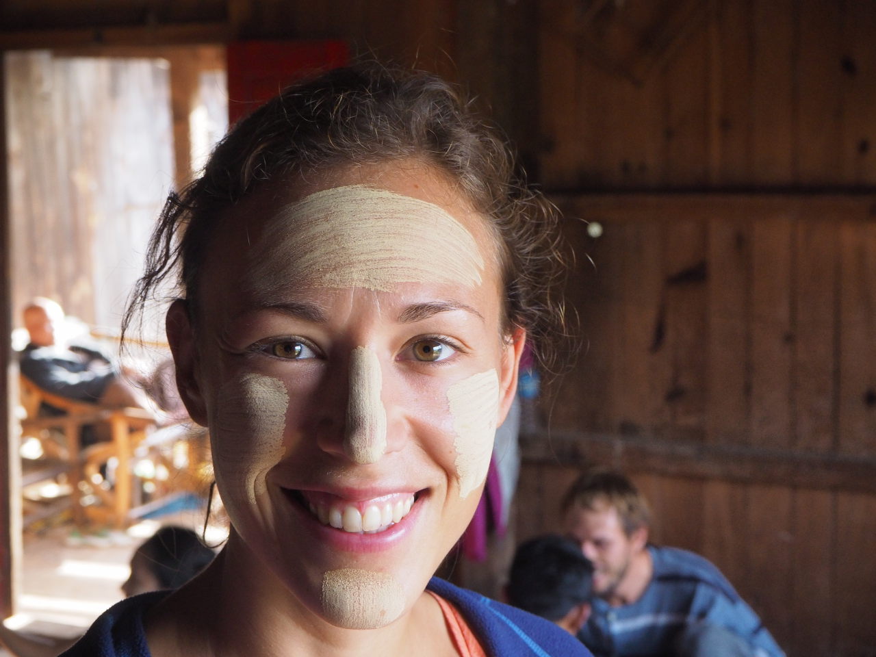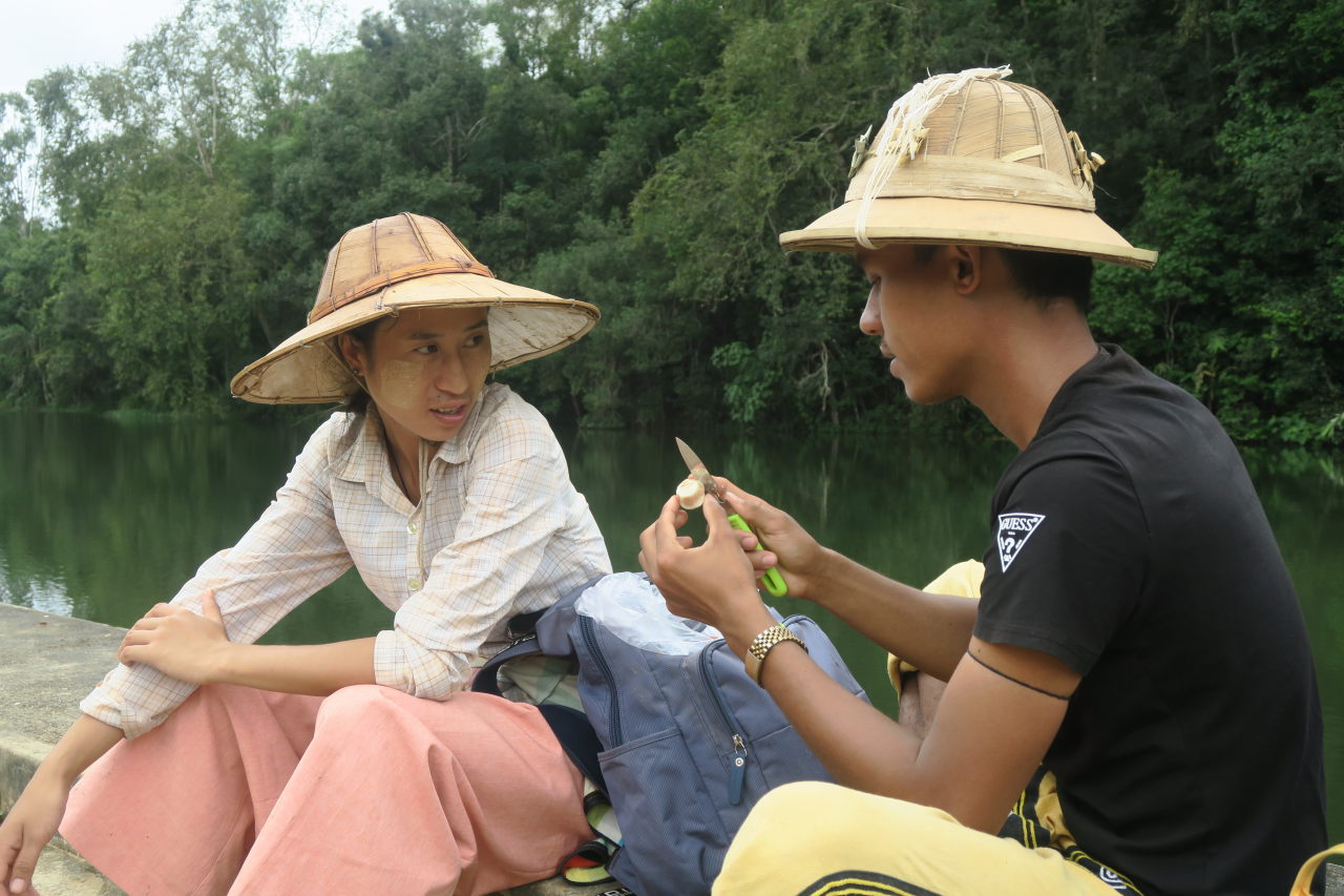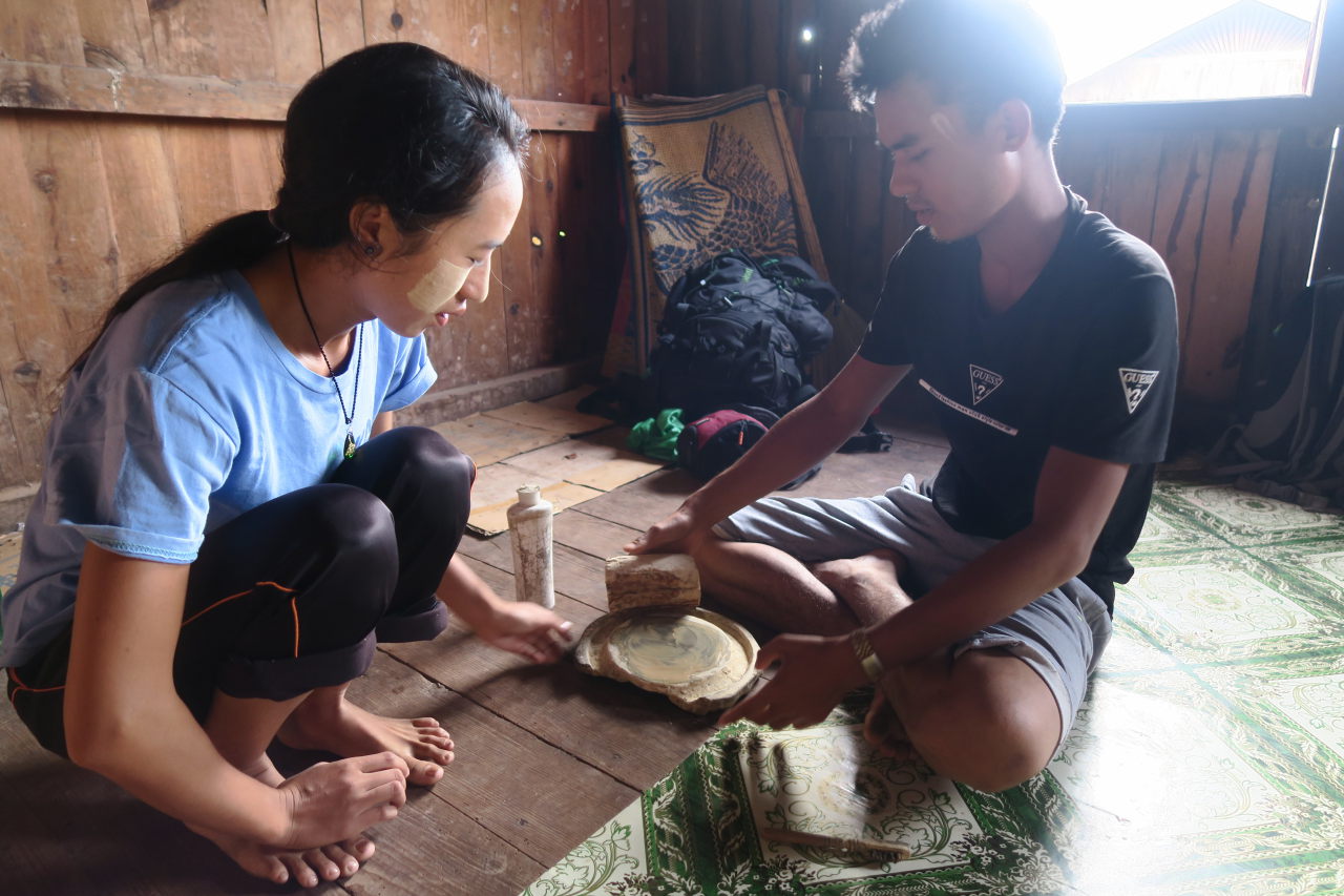 Nos guides préparant le « tanaka », utilisée comme protection solaire et maquillage (le produit vient d’une branche d’arbre)