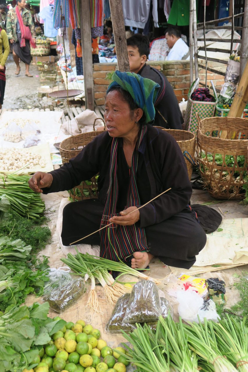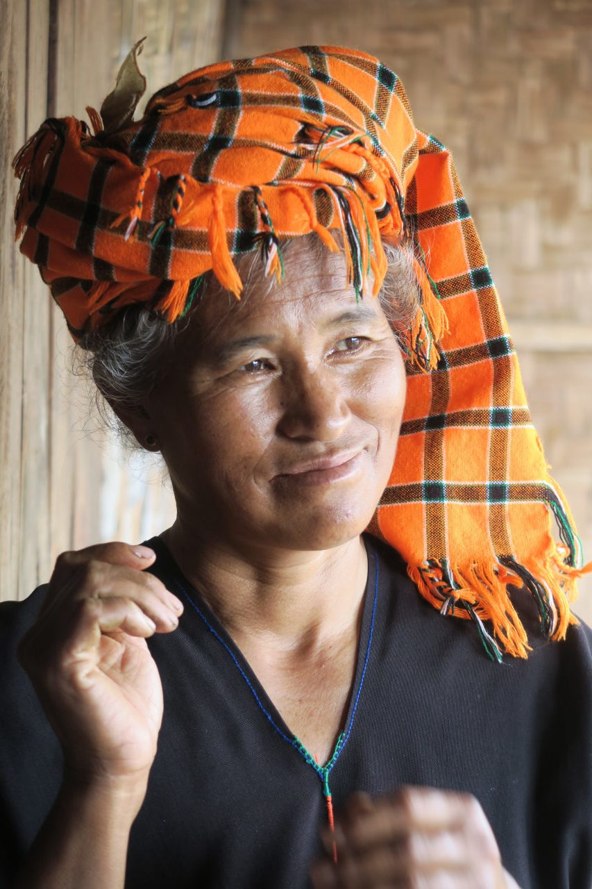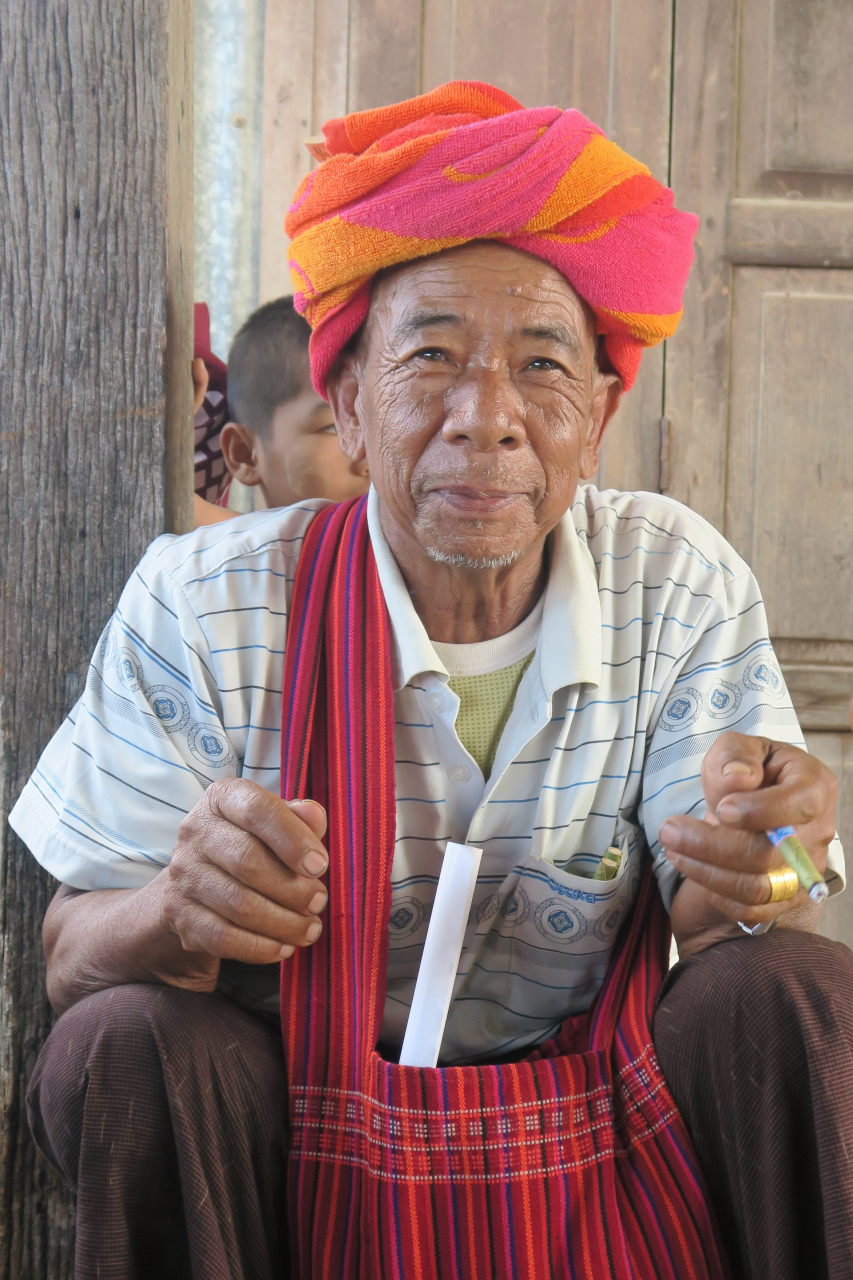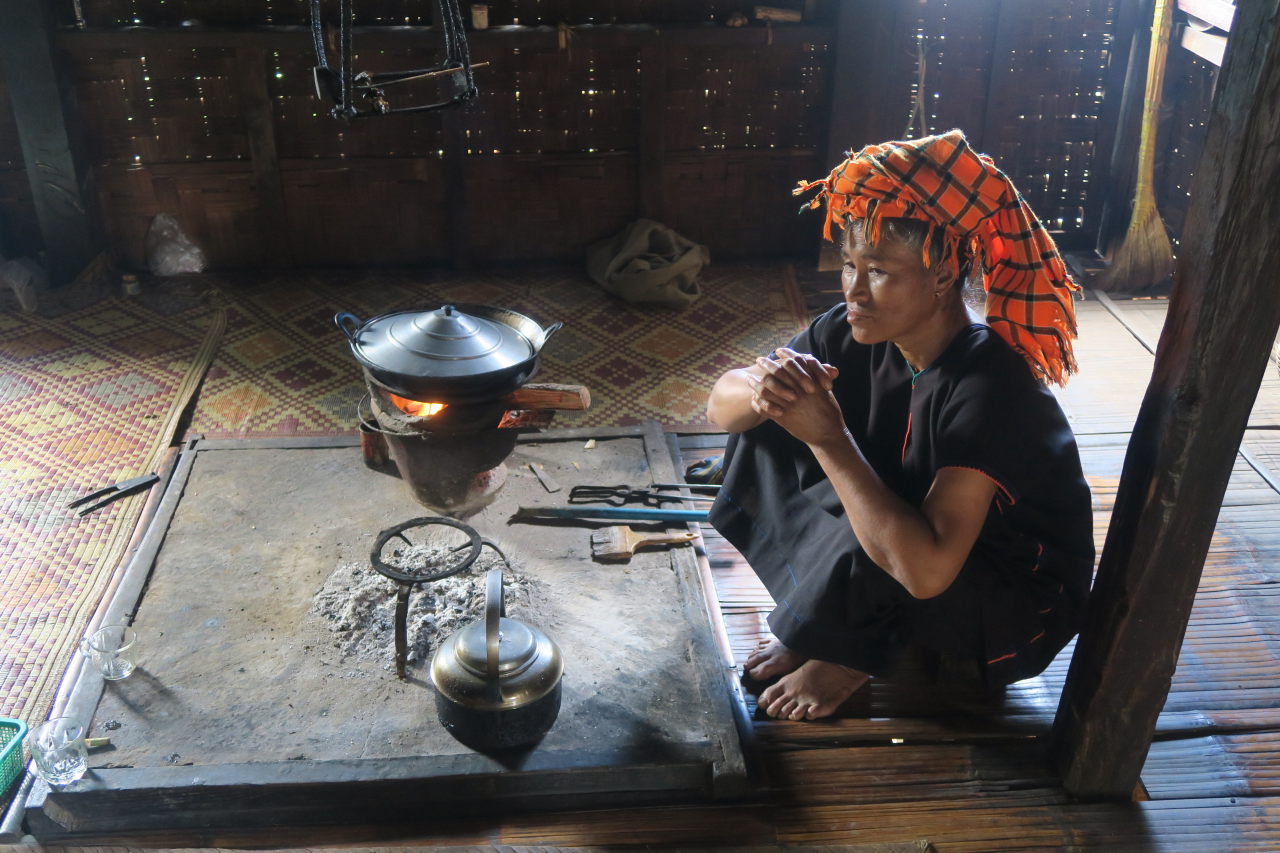 La mère de notre guide, assise dans sa cuisine, préparant le thé. Elle porte les vétements traditionnels de l’ethnie Pa-O : un ensemble noir et un « turban » de couleur sur la tête
