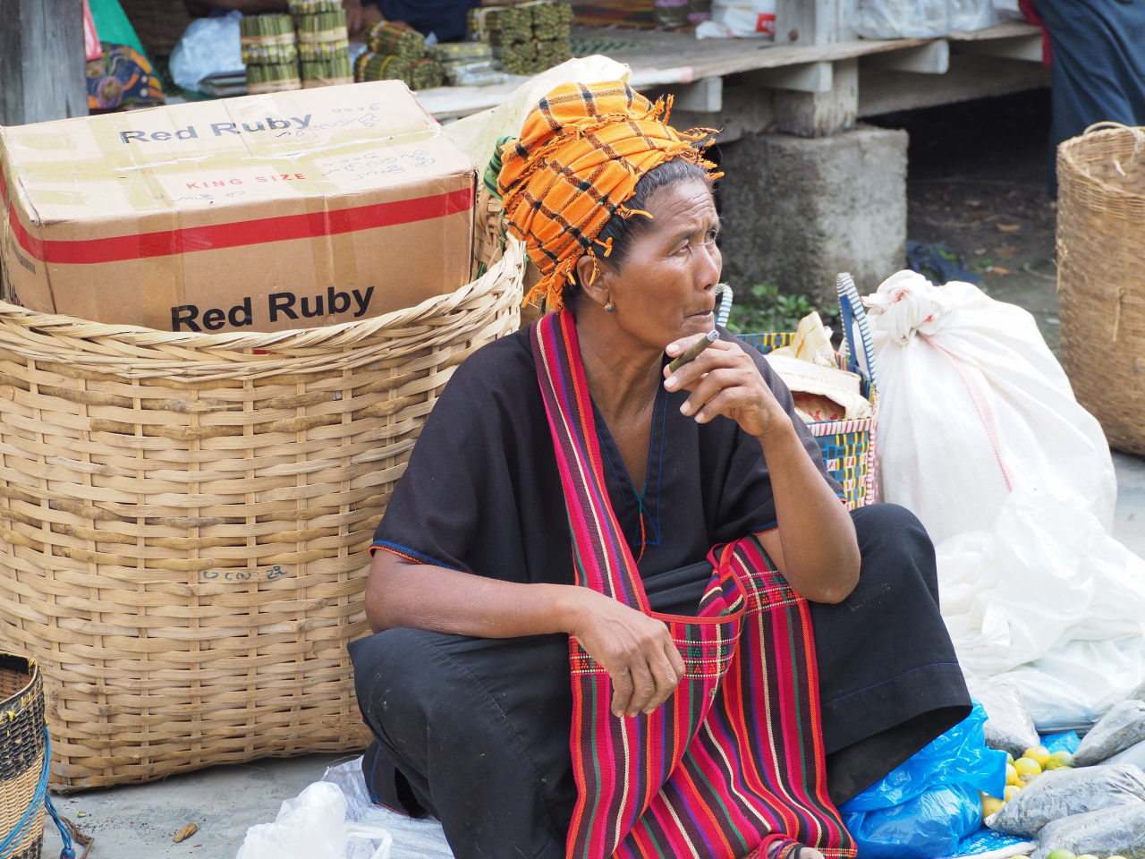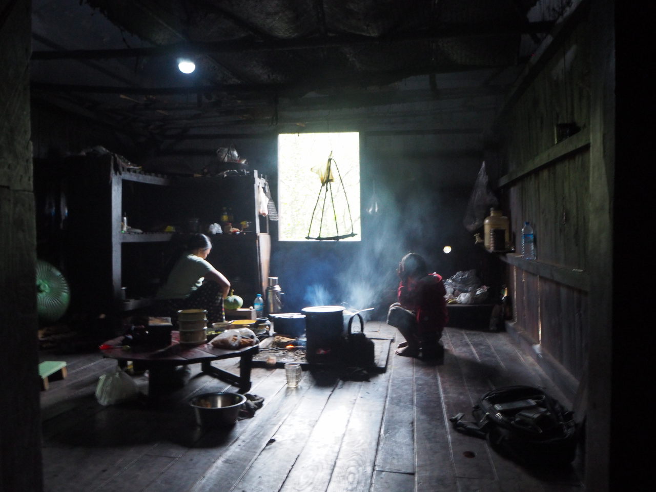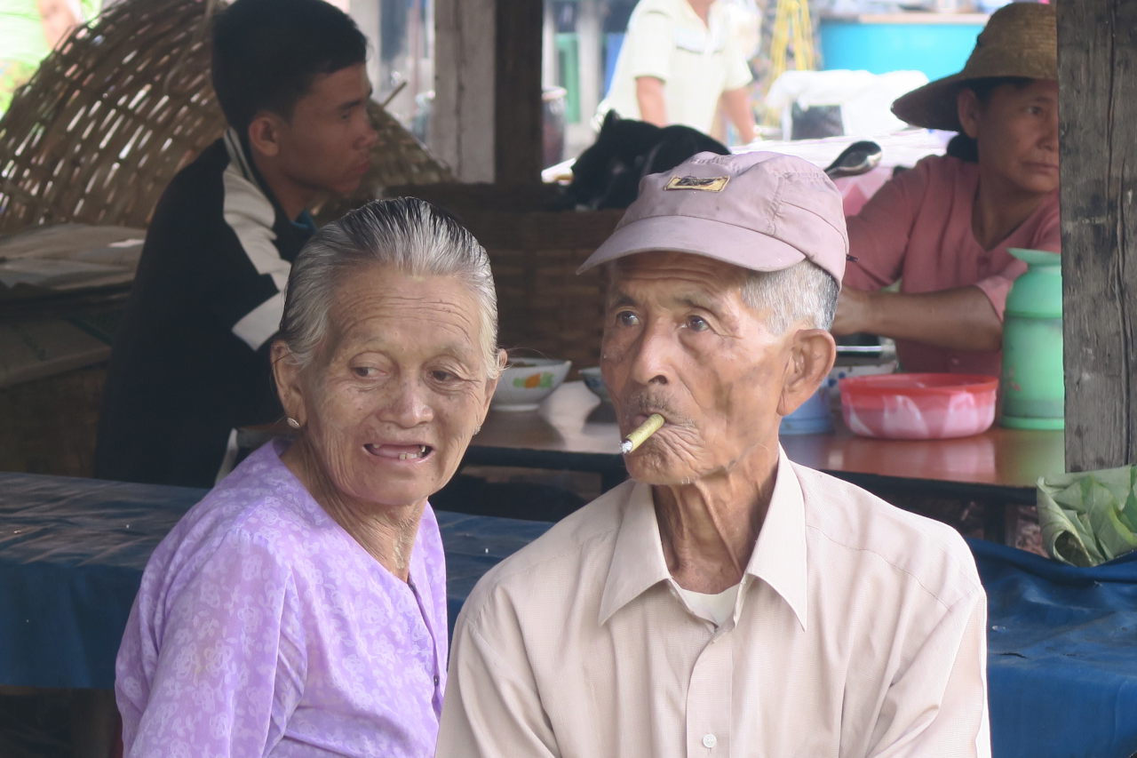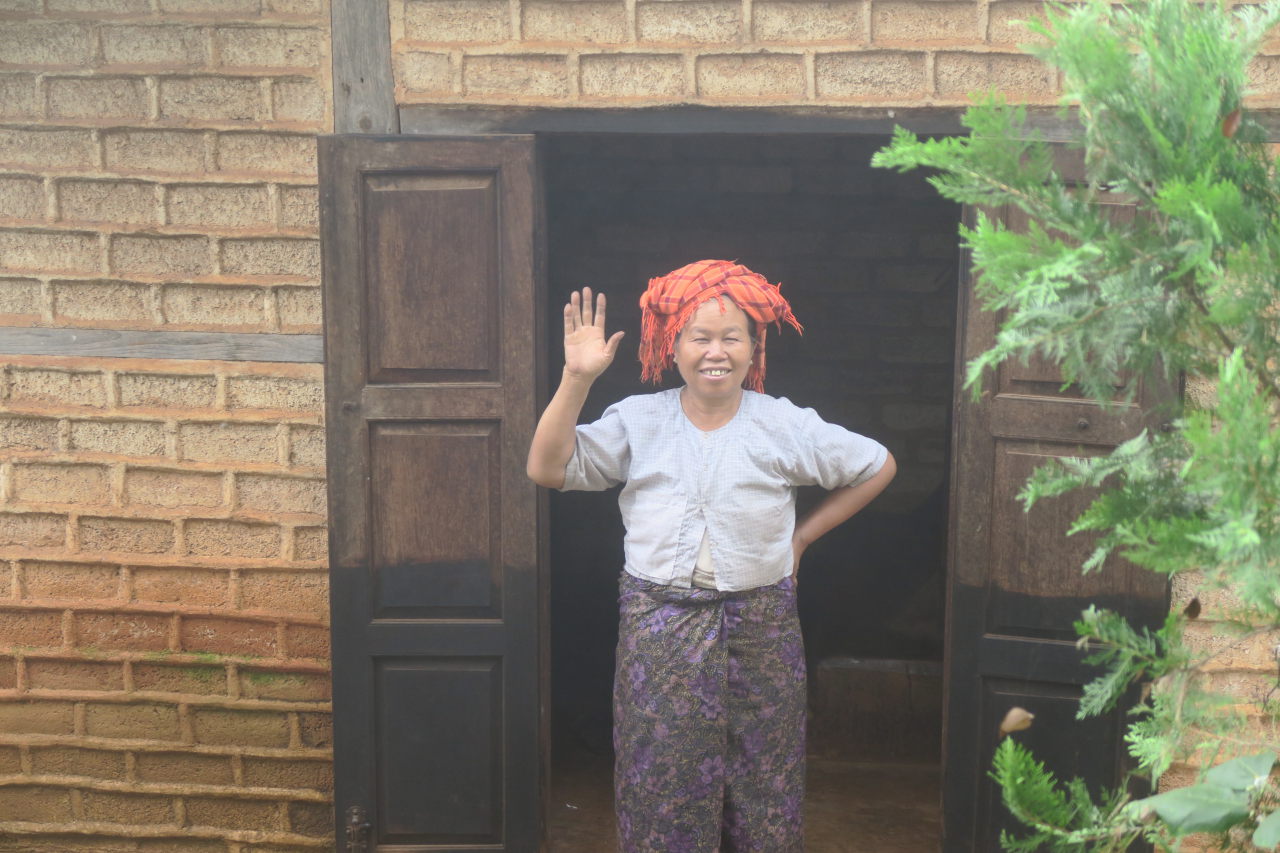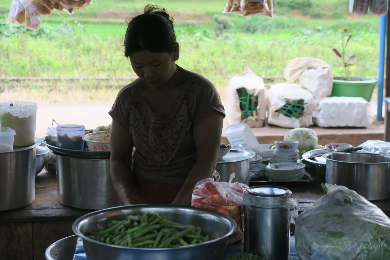 La mère de notre guide, assise dans sa cuisine, préparant le thé. Elle porte les vétements traditionnels de l’ethnie Pa-O : un ensemble noir et un « turban » de couleur sur la tête