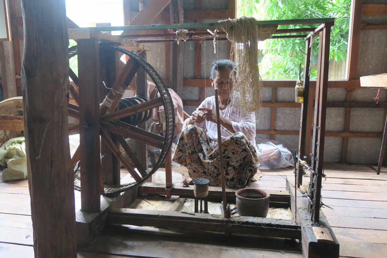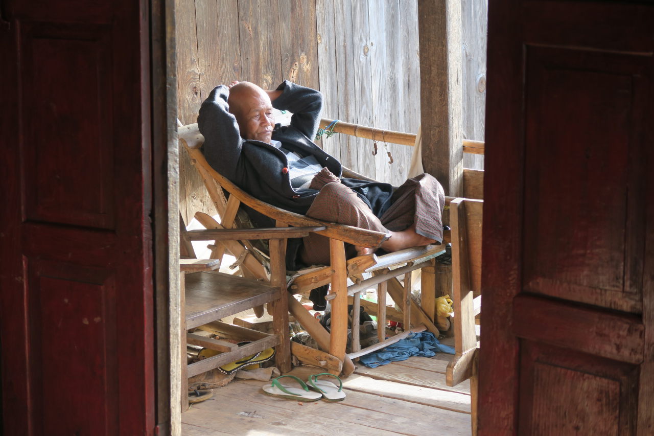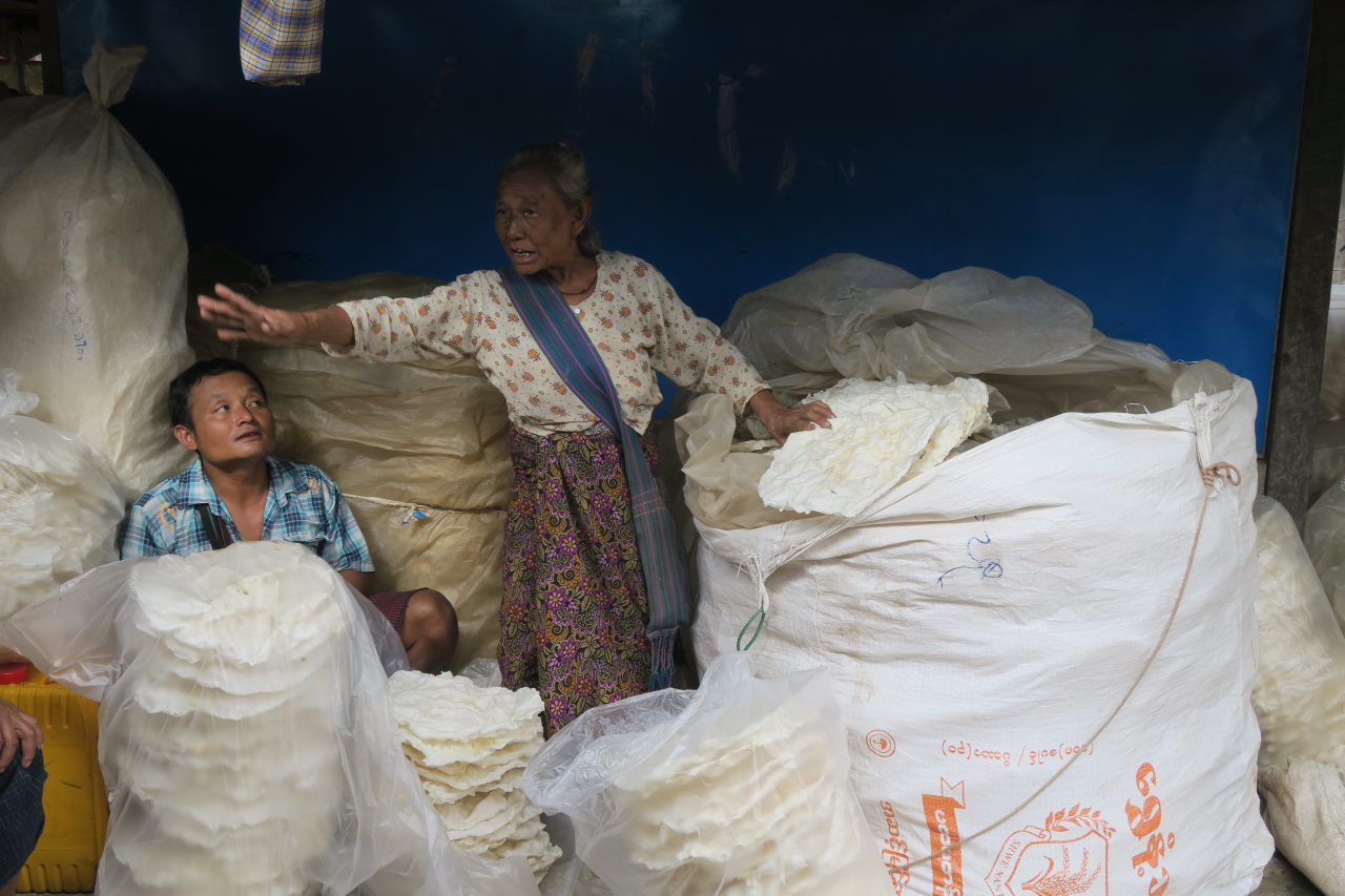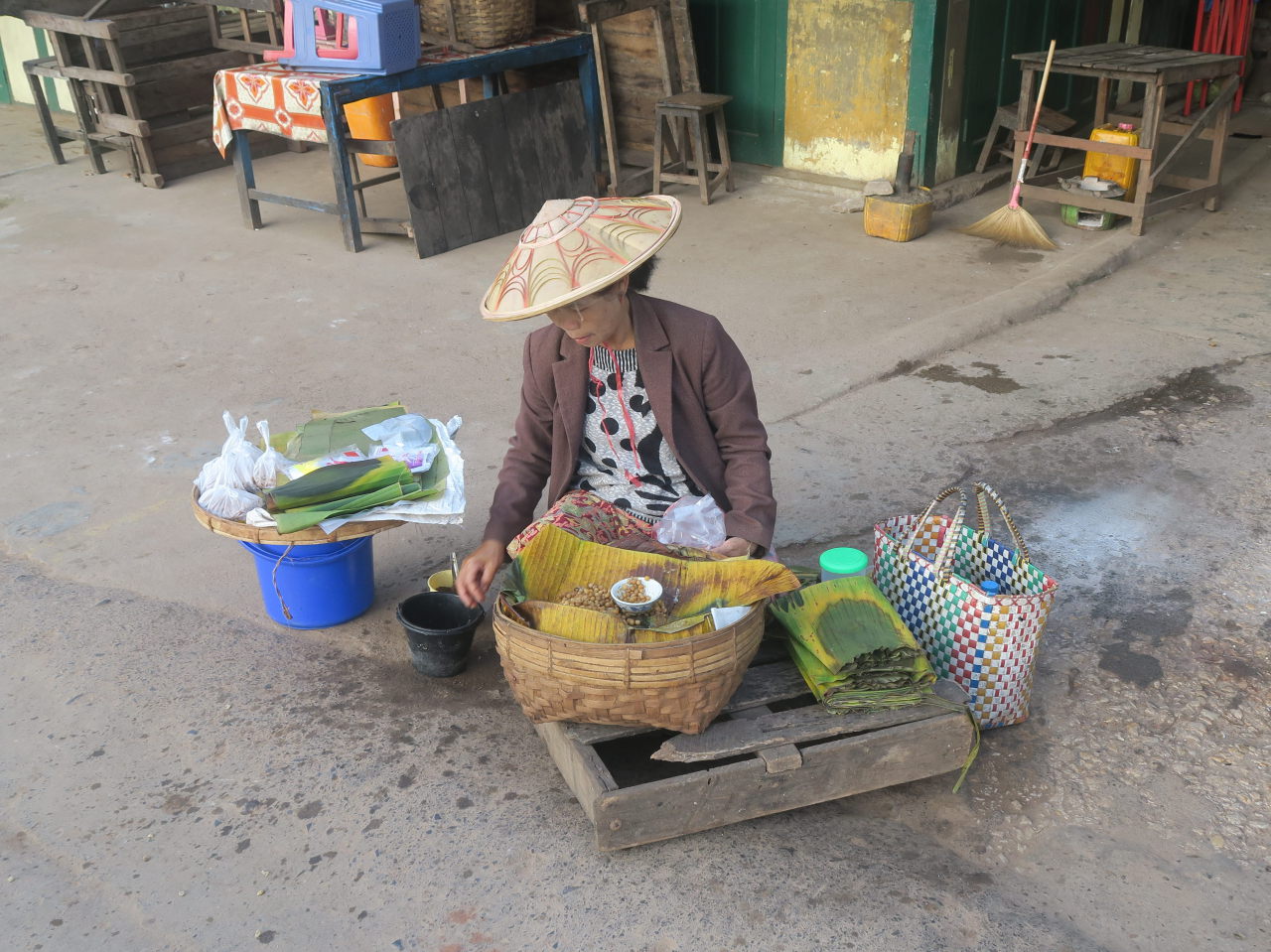 La mère de notre guide, assise dans sa cuisine, préparant le thé. Elle porte les vétements traditionnels de l’ethnie Pa-O : un ensemble noir et un « turban » de couleur sur la tête