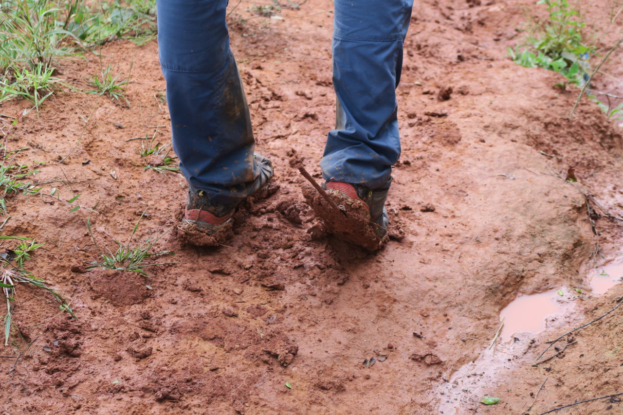 Les chaussures d’Elise après plusieurs heures dans les chemins boueux