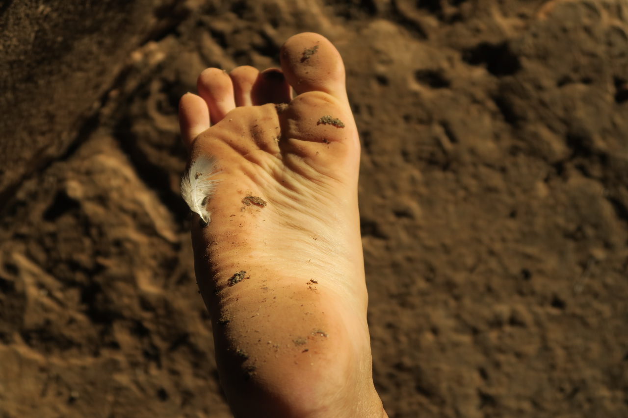 Les semelles de boue sous les chaussures de Julien