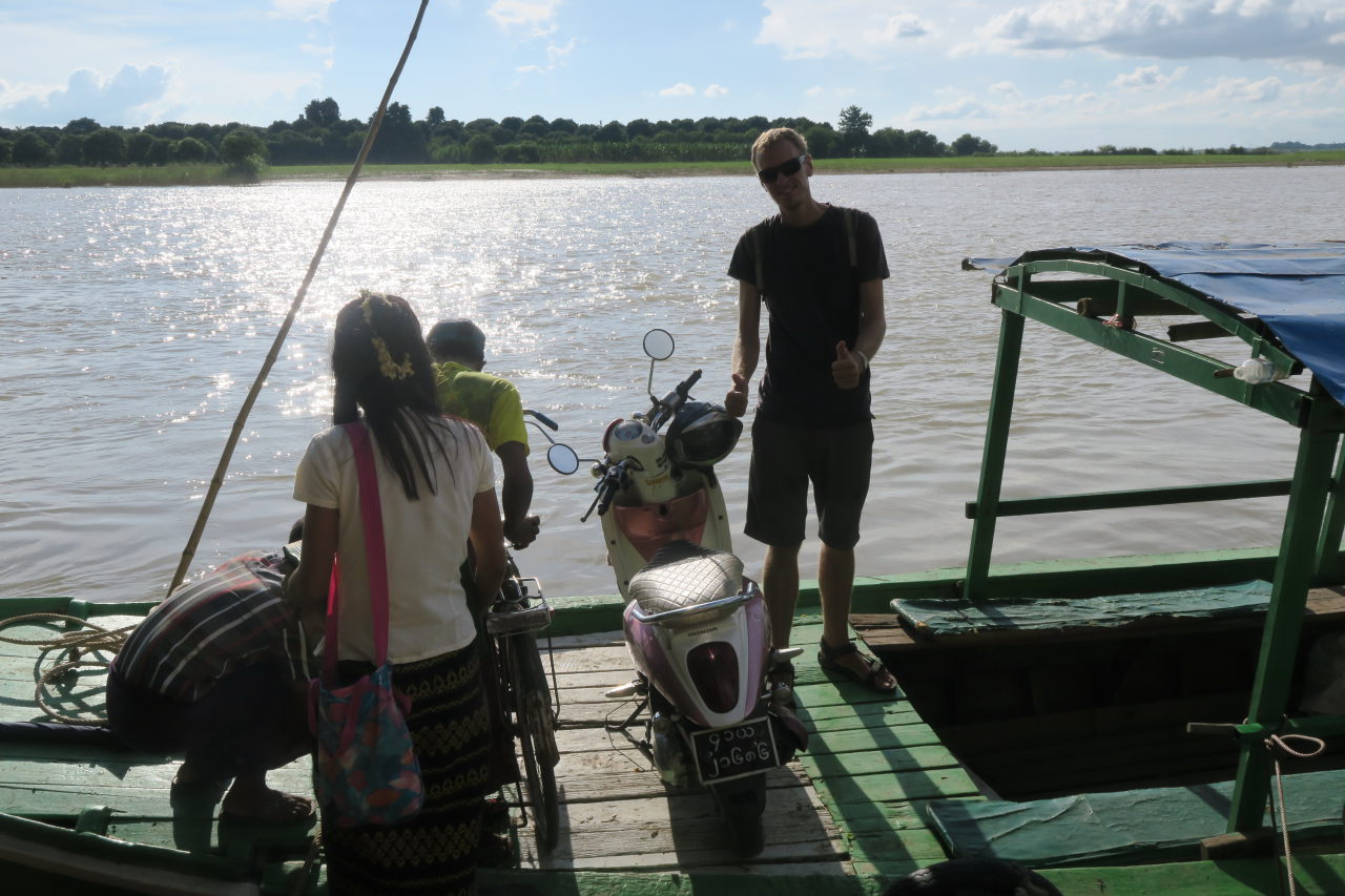 Julien tient notre scooter sur le bateau nous amenant à Inwa
