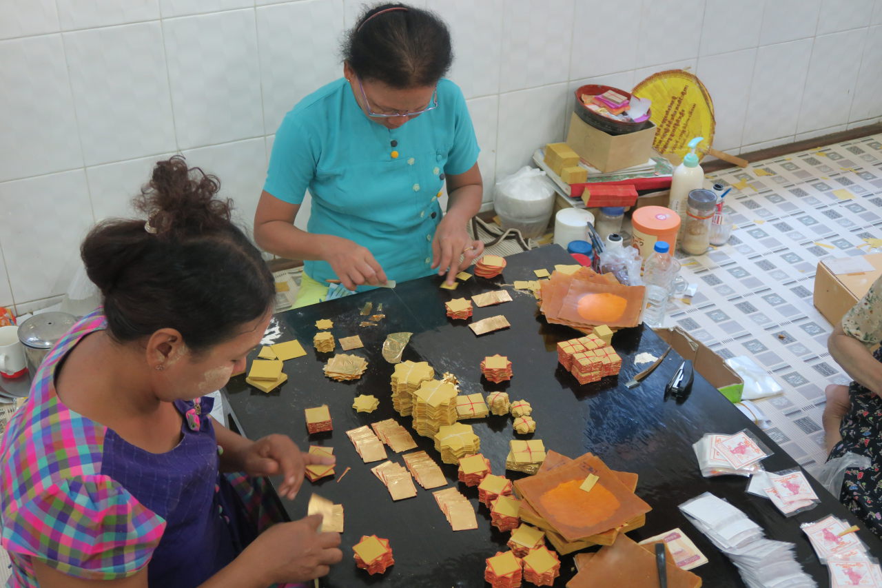 les femmes découpent les feuilles d’or aplaties pour les mettre en carrés. Elles seront ensuite vendues