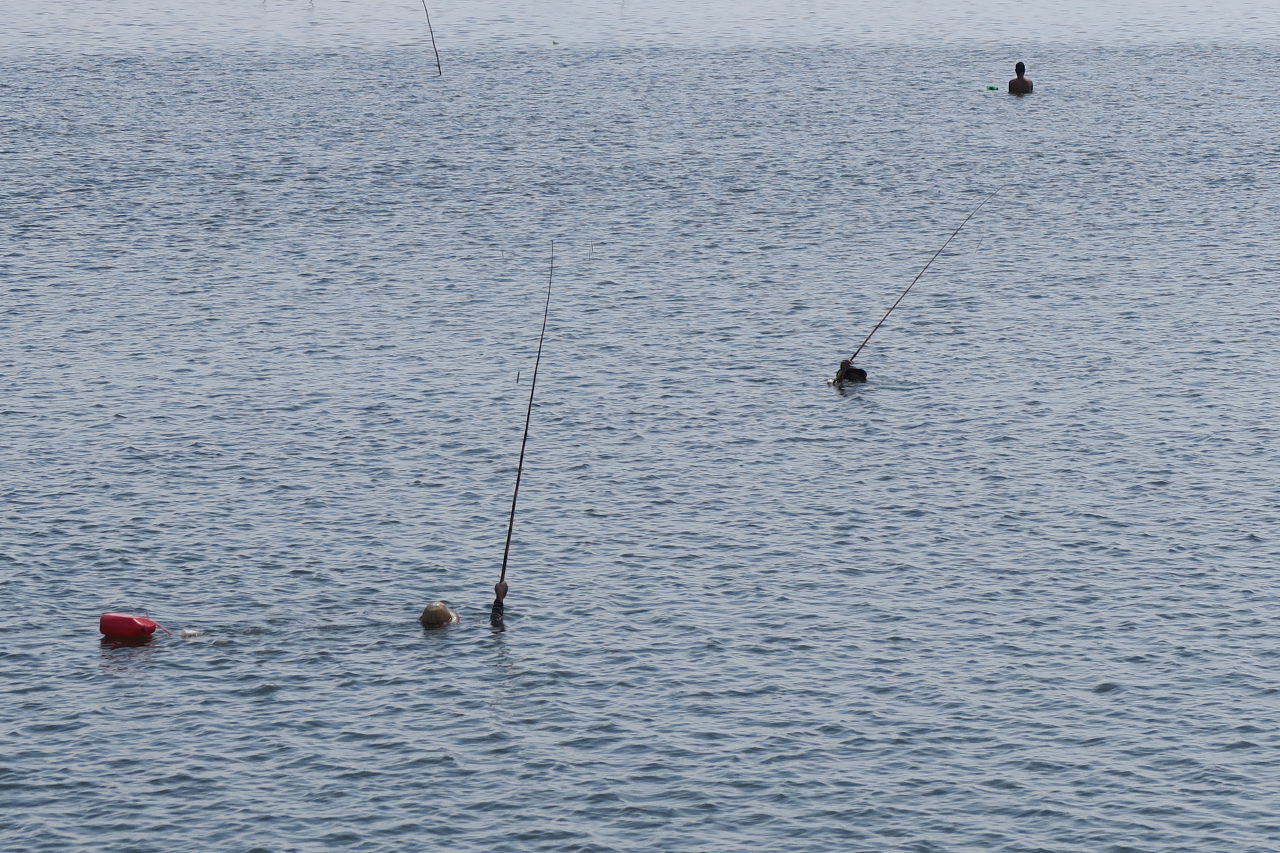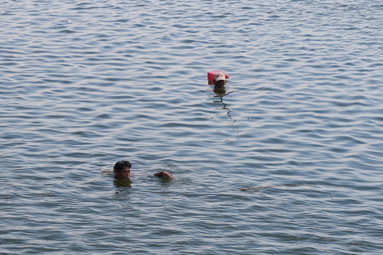 Les pêcheurs sont presque entièrement sous l’eau dans le lac Taungthaman