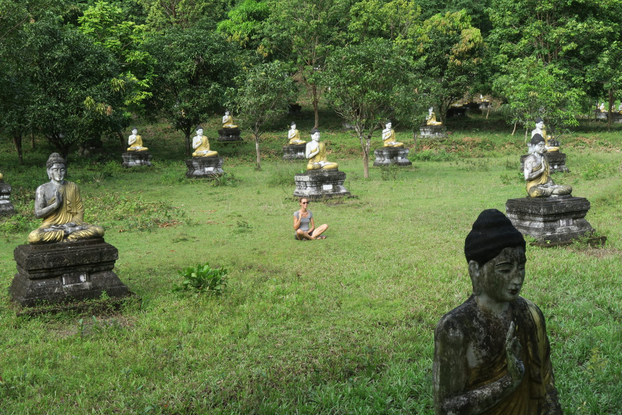 Panorama d’Elise assise au milieu des Buddhas