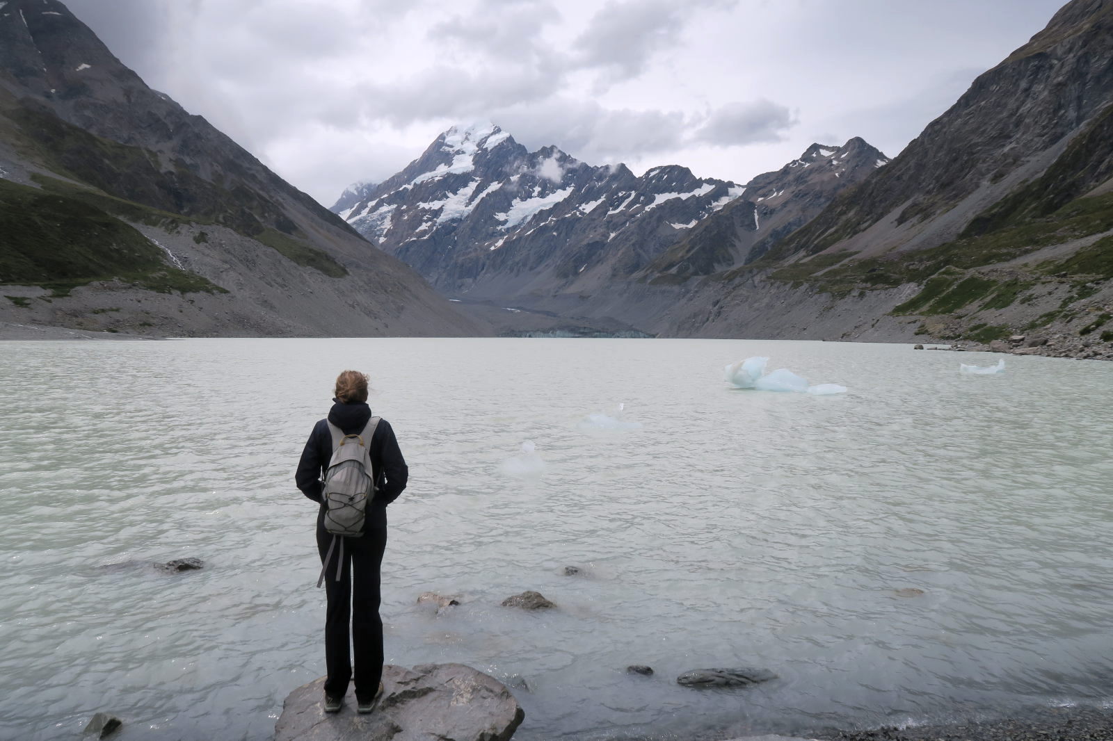 Elise en contemplation devant le lac Hooker
