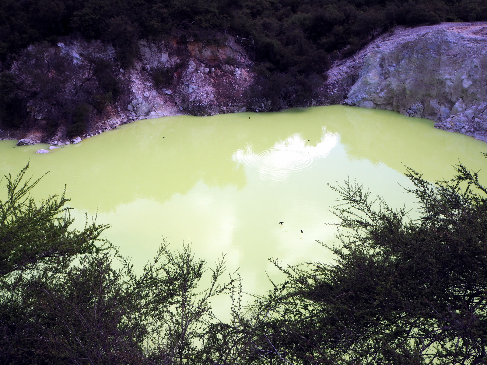 Devil’s pool, Wai-o-tapu. Les petits points noirs au dessus de l’eau sont des hirondeles venues festoyer