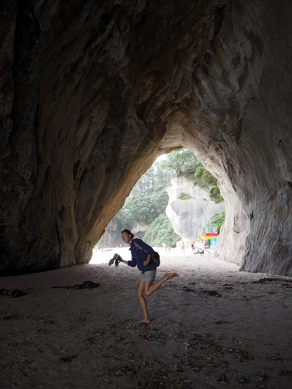 Elise prends la pose sous la grande arche de Cathedral cove (Coromandel)