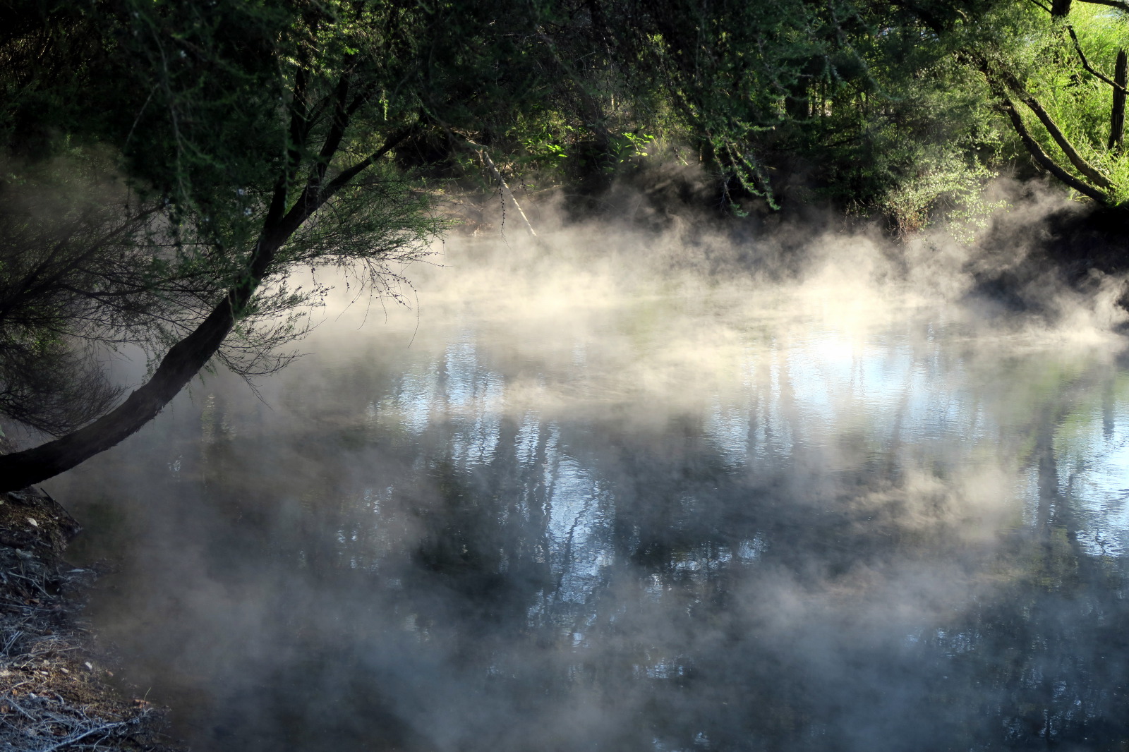 Branches recouvertes d’eau au parc thermal de Kuirau à Rotorua