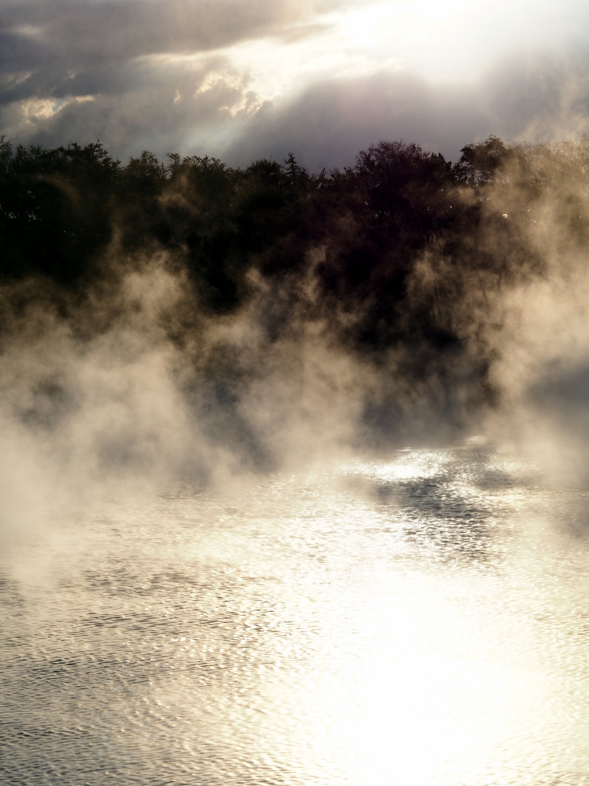 Elise dans les brumes des lacs d’eau chaude, au parc themral de Kuirau à Rotorua