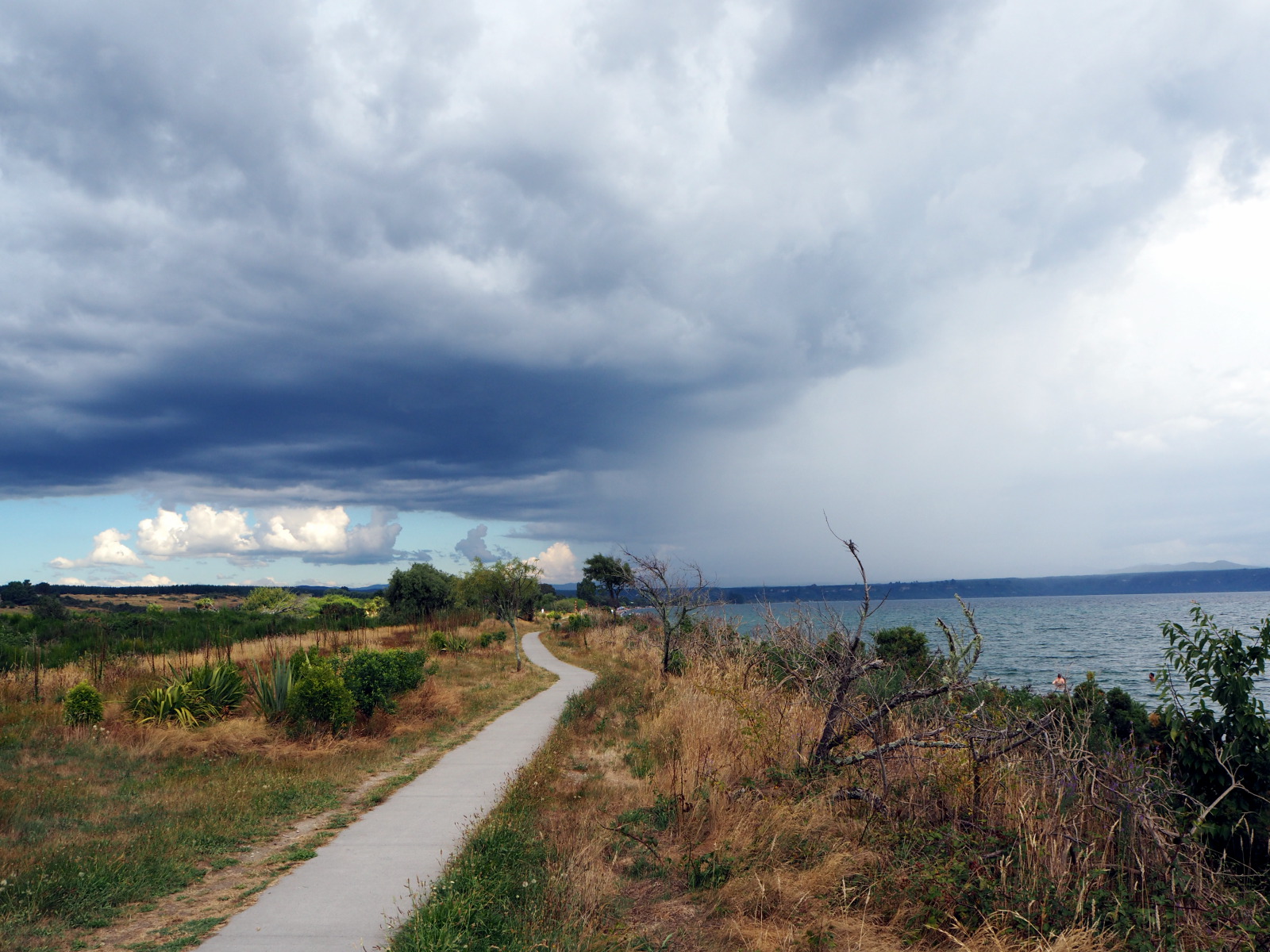 Petit sentier au bord du lac Taupo, avec au loin, la pluie du le Tongariro National Park