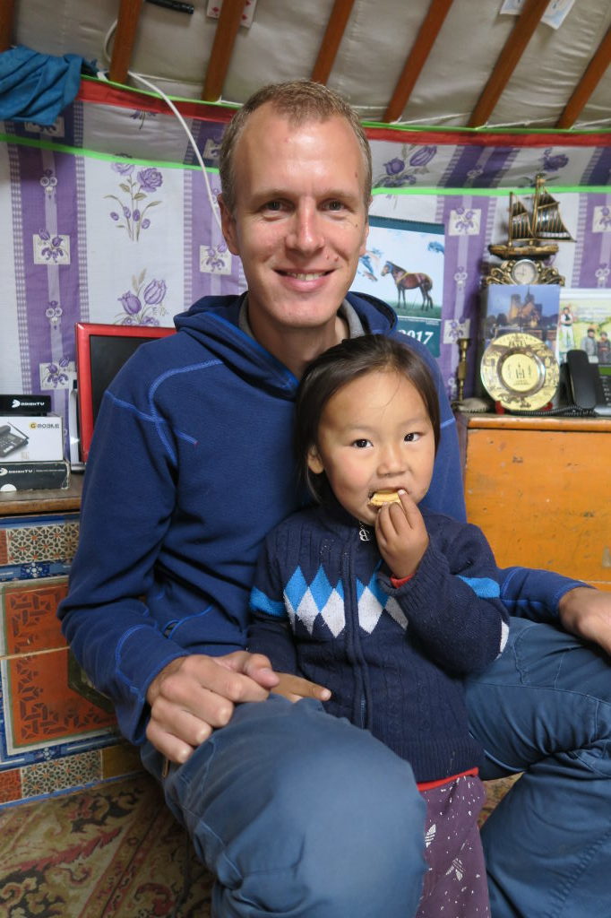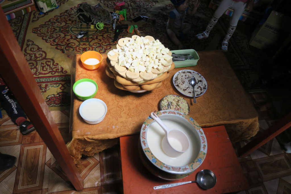 Nous avions lu beaucoup de choses sur la légendaire hospitalité mongole. Et bien nous vous confirmons que ce n’est pas une légende ! A peine arrivés au campement, nous sommes accueillis avec du lait salé, du pain et du urum (crème de lait que l’on met sur le pain). Nous découvrirons par la suite que chaque personne entrant dans une yourte est accueillie par ce rituel. Beaucoup d’invités sont arrivés à l’improviste lors de notre séjour et chaque fois Chigmee préparait un repas ou proposait de se reposer dans la yourte voisine. Tout cela s’inscrit dans la vieille tradition qui veut que les mongols s’entraident pour leur survie mutuelle quand ils traversent leurs vastes contrées à cheval.