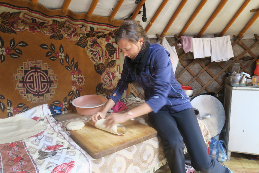 Rapidement Elise s’intéresse à la préparation des plats, et Chimgee n’hésite pas à la faire participer. On nous avait dit que la nourriture nomade n’était pas très bonne, pourtant nous on s’est régalé. Il est vrai qu’au bout d’un moment, ça devient monotone : de la viande (principalement du mouton), des préparations diverses à base de farine (pâtes, sortes de crêpes), et préparations à base de lait et ses dérivés.