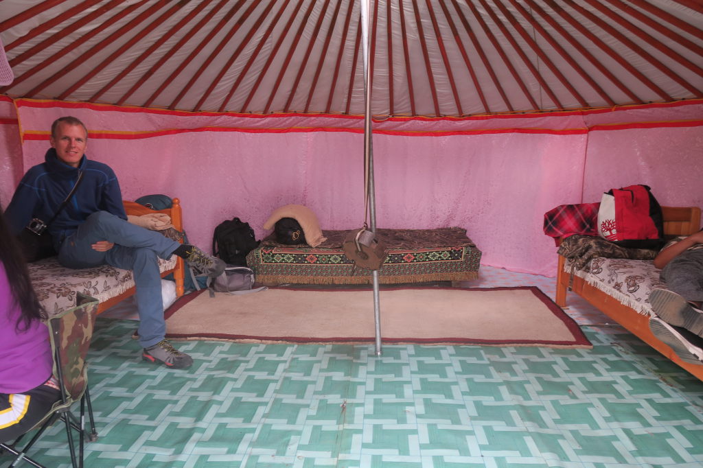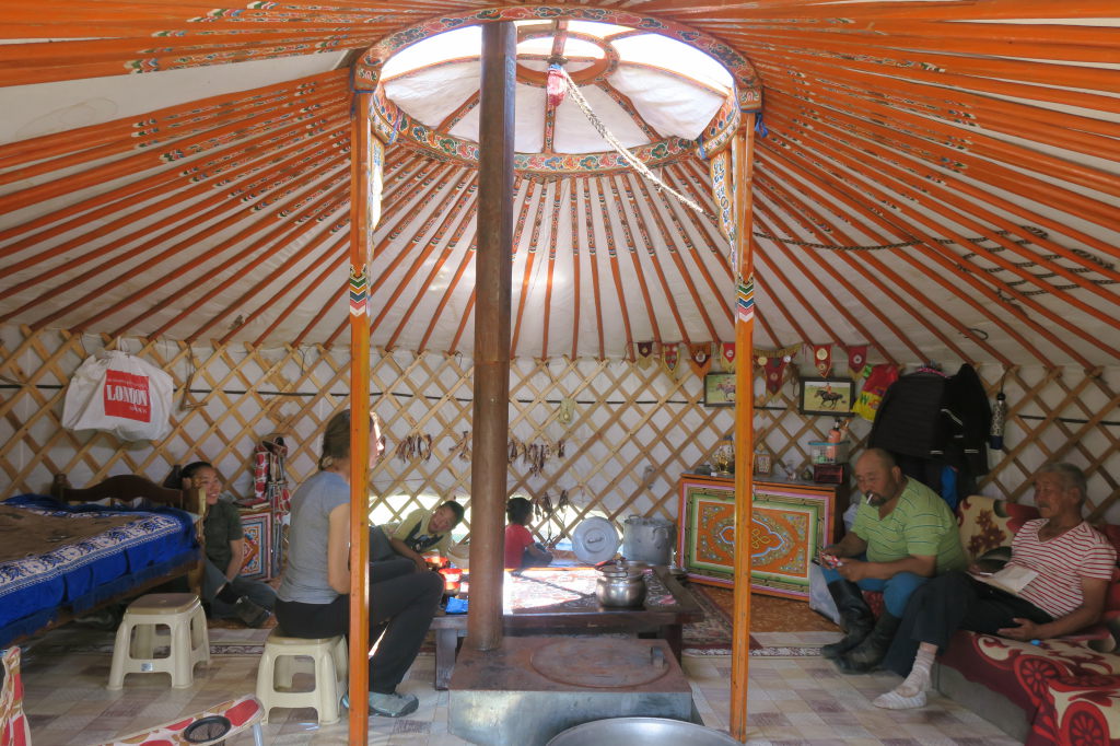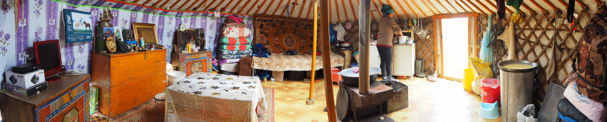 Les yourtes sont vraiment étonnantes. De l’extérieur, elles ressemblent à de grandes cabanes blanches, comme de grandes tentes de camping. Mais quand on rentre dedans par cette porte en bois souvent décorée, on entre dans un univers insoupçonné. A gauche et à droite : deux lits. au fond, une commode avec des photos posées dessus, une horloge, un miroir, une télé même ! Un peu devant, une table et des tabourets, et au milieu un poêle pour se chauffer et cuisiner. Au sol, du linoleum. Les lits servent pour s’asseoir le jour, cuisiner dessus aussi, et dormir la nuit à plusieurs dessus. Les visiteurs entrent sans frapper et doivent normalement s’installer sur le lit de gauche.
