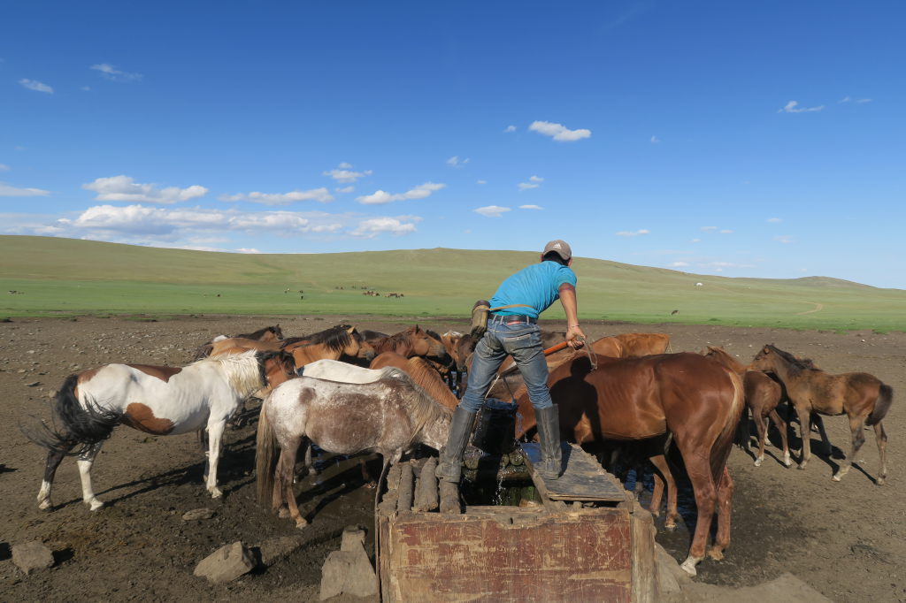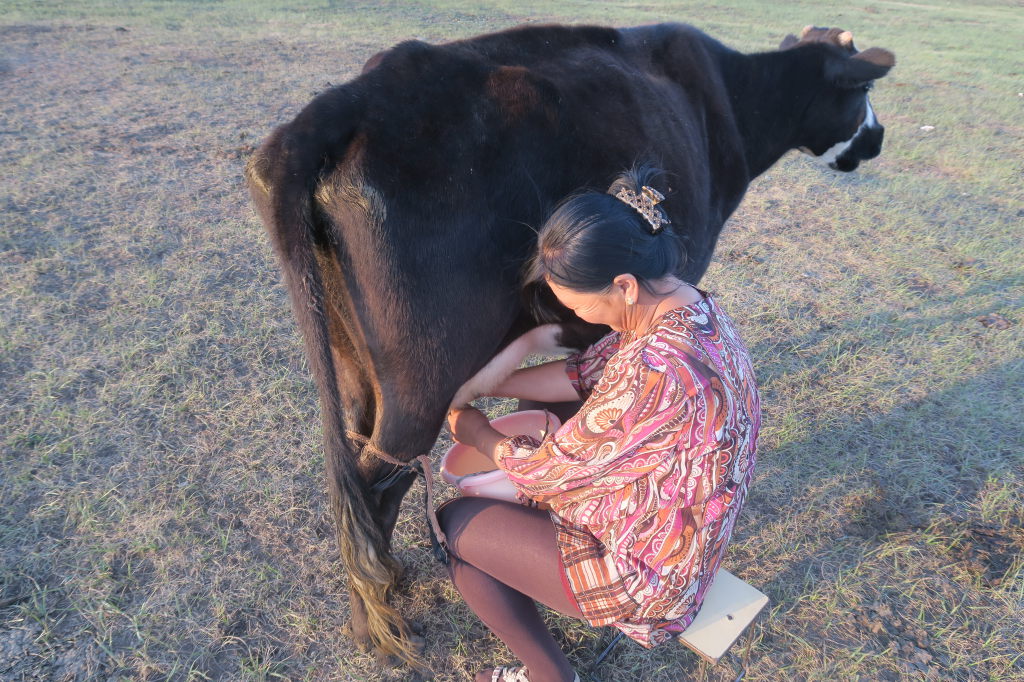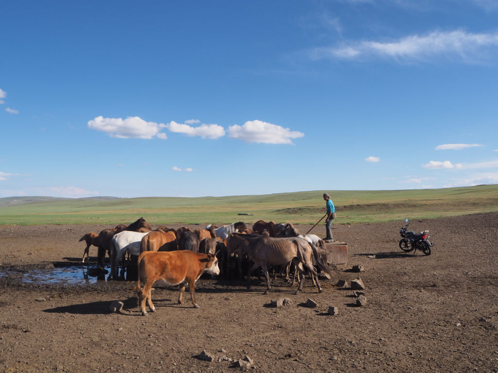 Les journées se déroulent ainsi : vers 6-7h le matin, traite des vaches (certaines familles traitent aussi les juments, 6 à 8 fois par jour), aller puiser l’eau au puits. Il faut pour cela rassembler le troupeau, nous courrons derrière les bêtes en criant pour les rassembler. Un peu de légèreté et d’exercice nous fait le plus grand bien ! On se rend compte que ça court vite une biquette ;) Il faut aussi éviter que les troupeaux se mélangent, notamment au puits (toutes les bêtes du coin rappliquent !). Puis vient la préparons du déjeuner. L’après-midi s’étire, avec quelques tâches diverses, jusqu’à la traite du soir, le diner et le coucher.