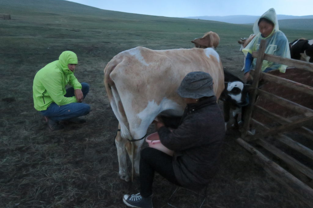 Nous goutons le tarag maison (yaourt fait à partir du lait). Puis nous jouons avec les enfants au Shagai (un jeu avec des os de cheville de mouton) et préparons le diner. Il pleut toujours mais nous allons aider pour la traite des vaches. L’orage est au dessus de nous. Elise rentre se mettre à l’abri car elle a vite froid mais Julien brave la pluie, se faisant tremper mais appréciant cet instant sauvage, avec d’impressionnants éclairs qui déchirent le ciel, faisant peur à tout le monde à chaque fois.