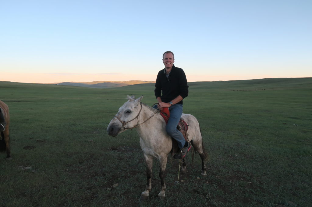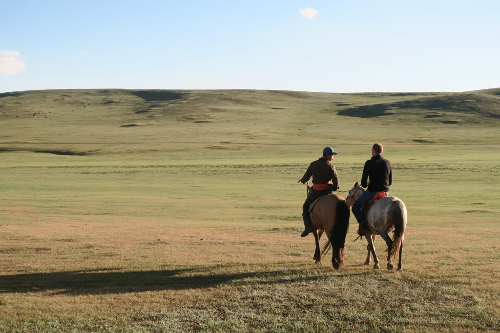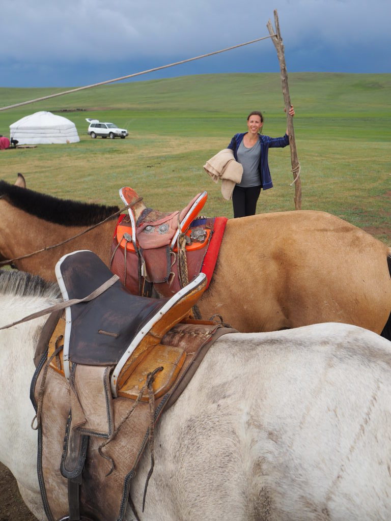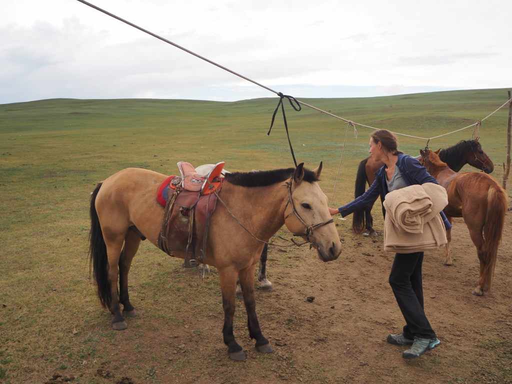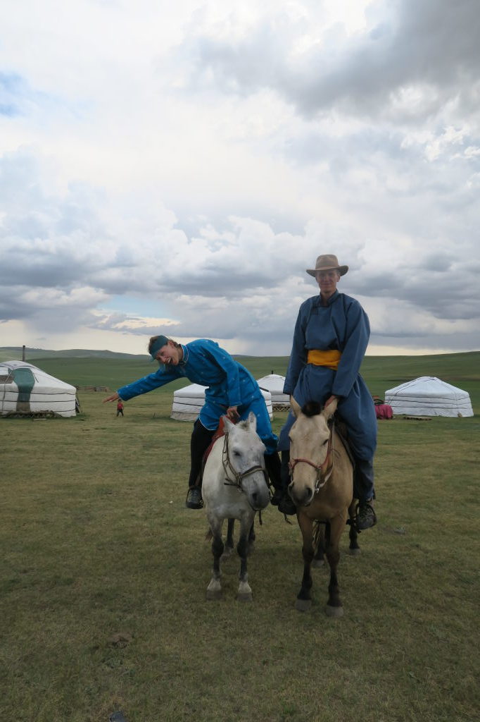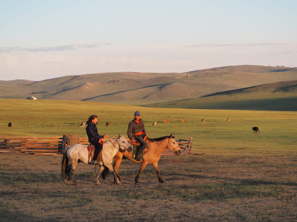 Le lendemain, deuxième essai, cette fois-ci avec deux chevaux (dont un emprunté à un campement voisin), et une deuxième selle, occidentale ! Beaucoup plus confortable, malgré des étriers trop courts pour les grandes jambes de Julien. On rajoute une couverture sur la selle mongole pour Elise, c’est mieux mais c’est toujours pas ça… Julien gère son cheval, mais celui d’Elise est pris à la bride, du coup elle à la jambe collée à l’autre monture, ça cogne et ça frotte contre les lanières en cuir… Après 2 heures, on a vraiment mal partout.