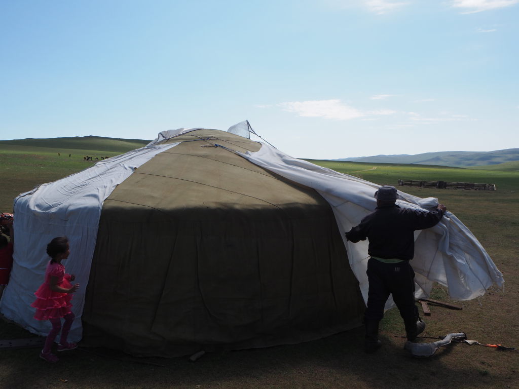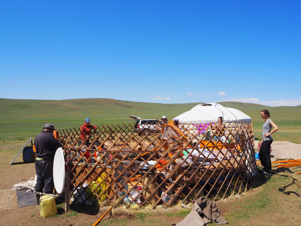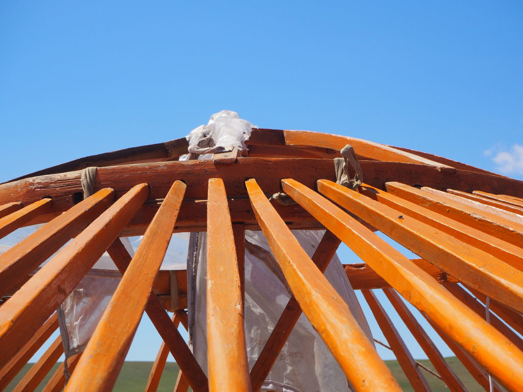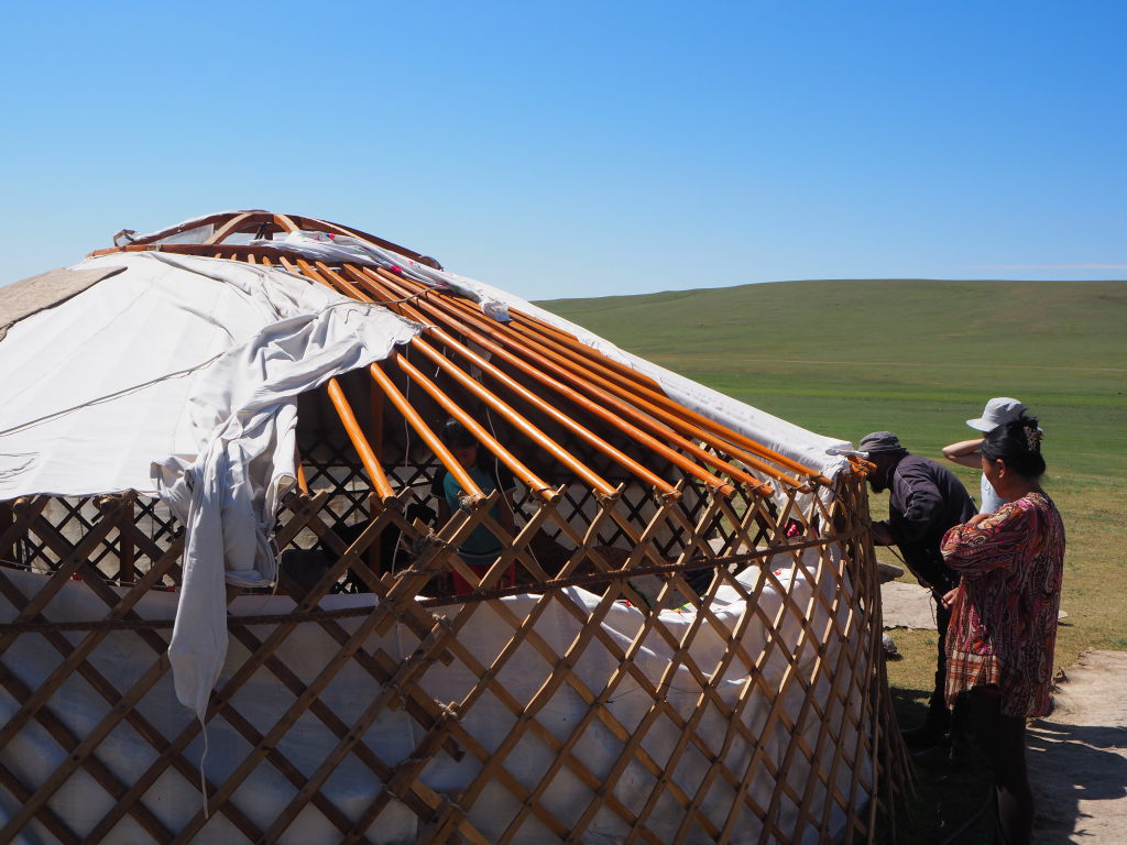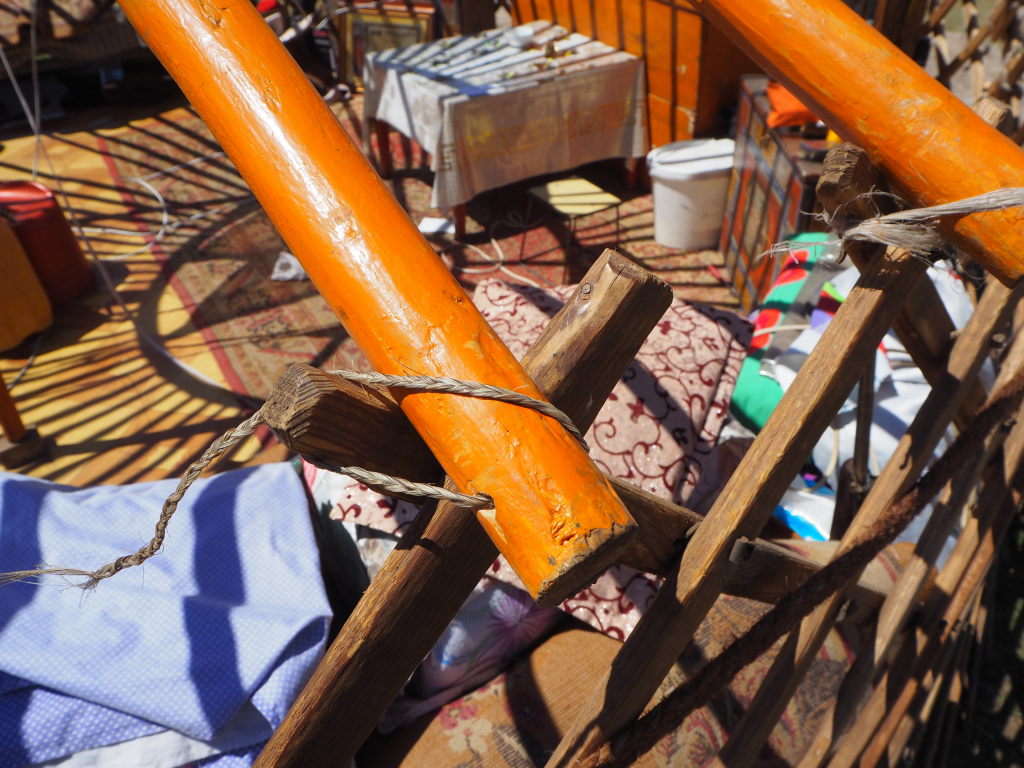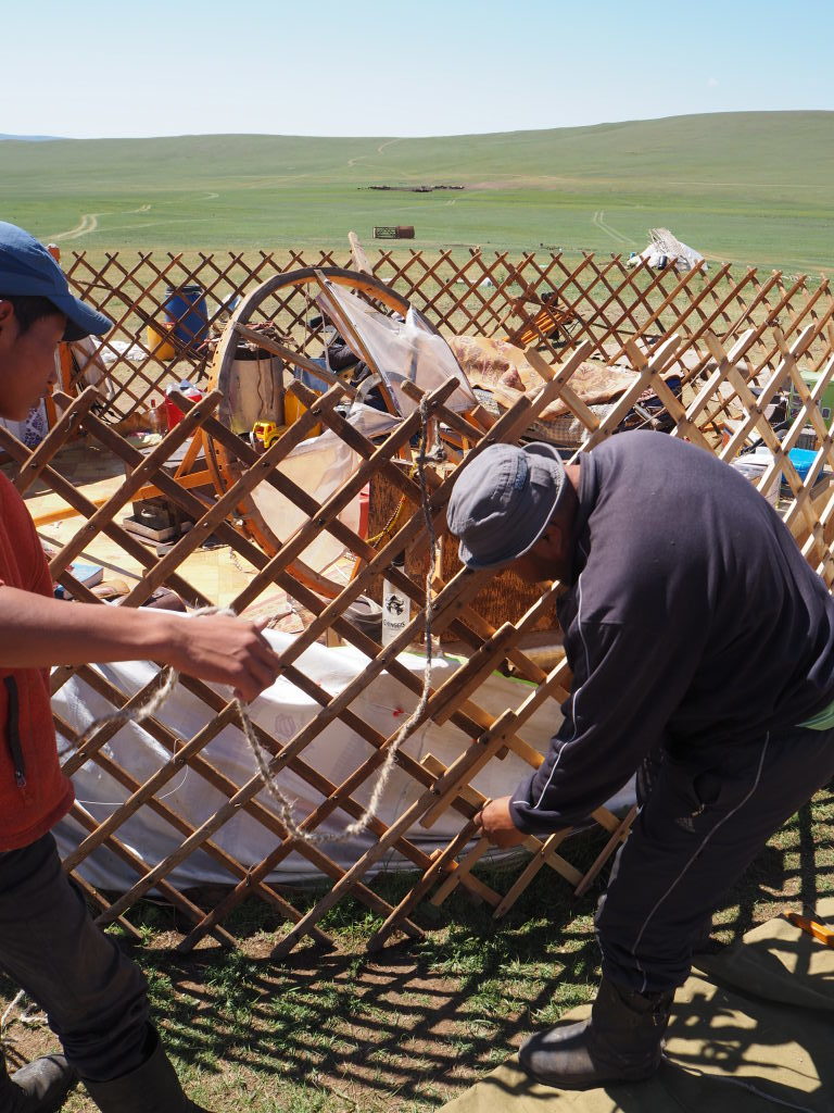 Il est dit que 3 hommes peuvent monter une yourte en 30 minutes. Il faut dire qu’il n’y a aucun abris dans la steppe, la yourte (qu’on appelle aussi ger)est le seul refuge contre le vent, la pluie, le soleil ou la neige. Elle est composée d’un « mur » (un treillage en bois) circulaire, d’un pilier central avec deux montants, et de longues tiges en bois (représentant la femme et l’homme) qui reposent sur ces deux éléments pour former le toit. Puis l’ensemble est enveloppé de couches de feutres en laine et de tissus en coton. En fonction des saisons ils rajoutent ou enlèvent des couches.