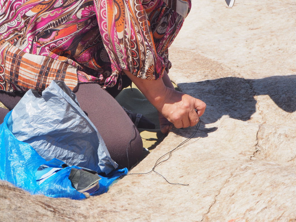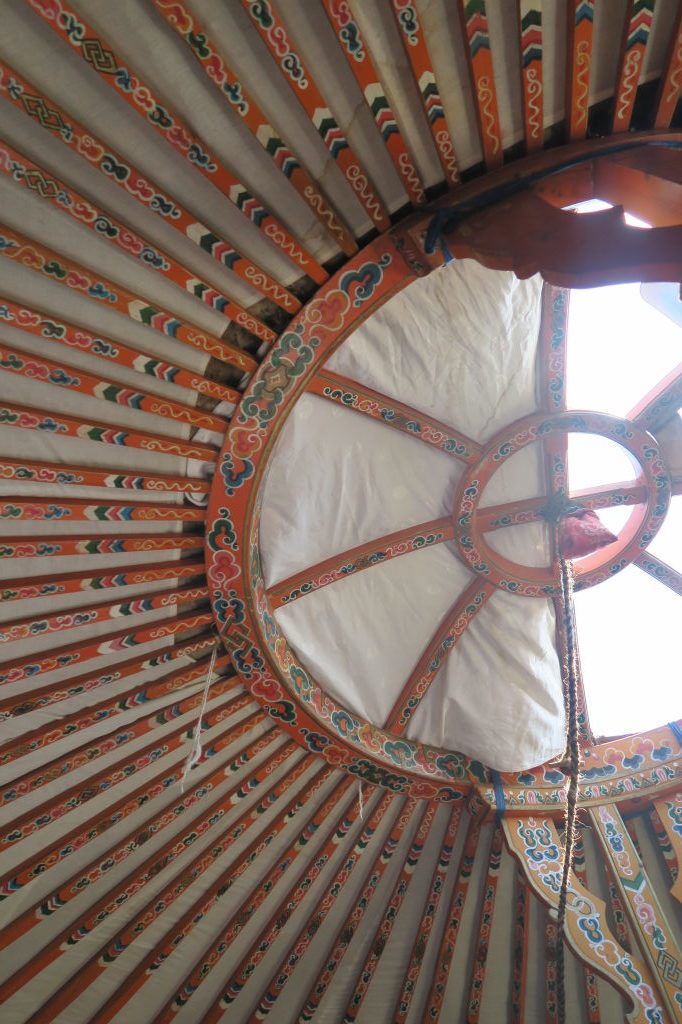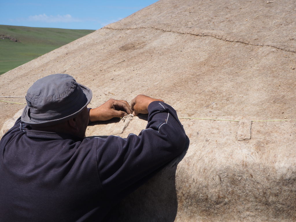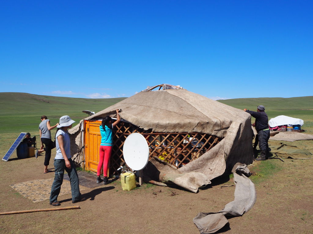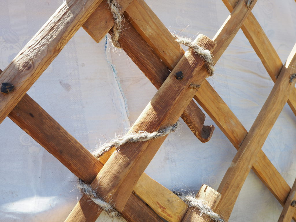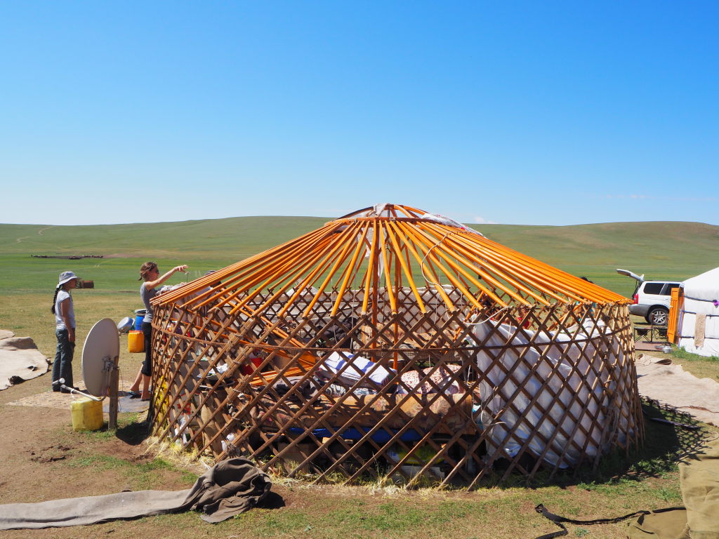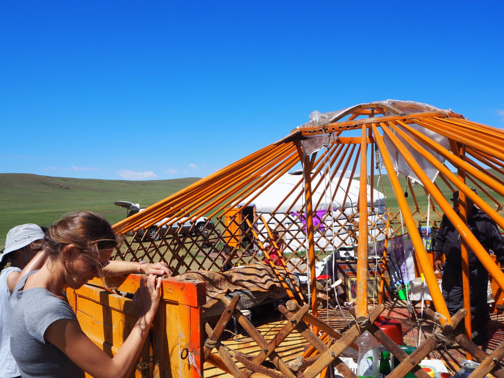 Il est dit que 3 hommes peuvent monter une yourte en 30 minutes. Il faut dire qu’il n’y a aucun abris dans la steppe, la yourte (qu’on appelle aussi ger)est le seul refuge contre le vent, la pluie, le soleil ou la neige. Elle est composée d’un « mur » (un treillage en bois) circulaire, d’un pilier central avec deux montants, et de longues tiges en bois (représentant la femme et l’homme) qui reposent sur ces deux éléments pour former le toit. Puis l’ensemble est enveloppé de couches de feutres en laine et de tissus en coton. En fonction des saisons ils rajoutent ou enlèvent des couches.