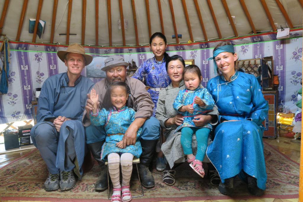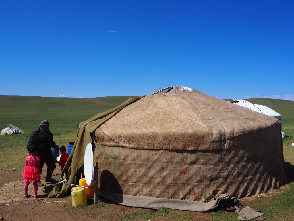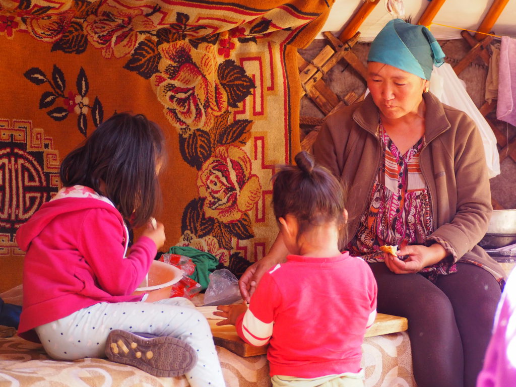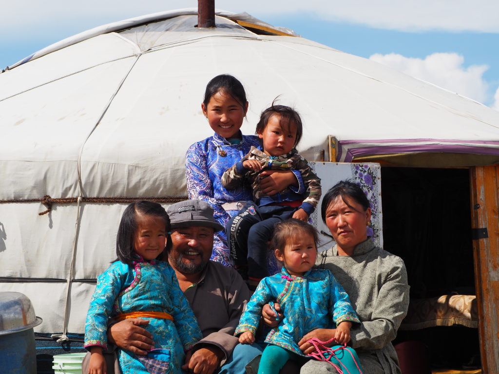 Nous voyons des campements de yourtes au loin. Finalement nous arrivons à un campement de 4 yourtes, où nous passerons la semaine. Trois yourtes appartiennent à notre famille d’accueil : une pour eux, une pour nous (et notre guide), une troisième qui sert de stockage. La quatrième héberge la belle famille de nos hôtes. Nos hôtes, Chimgee (la femme) et Baldan (le mari) gardent leur 3 petits-enfants venus en vacances chez eux (selon notre guide il est primordial pour eux de passer du temps à la campagne, manger des produits laitiers et respirer le grand air pour survivre à l’hiver rude à venir) ainsi que leur dernière fille de 12 ans (qui le reste de l’année habite avec sa sœur à Oulan-Bator pour pouvoir aller à l’école).