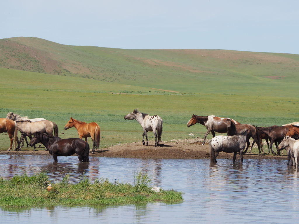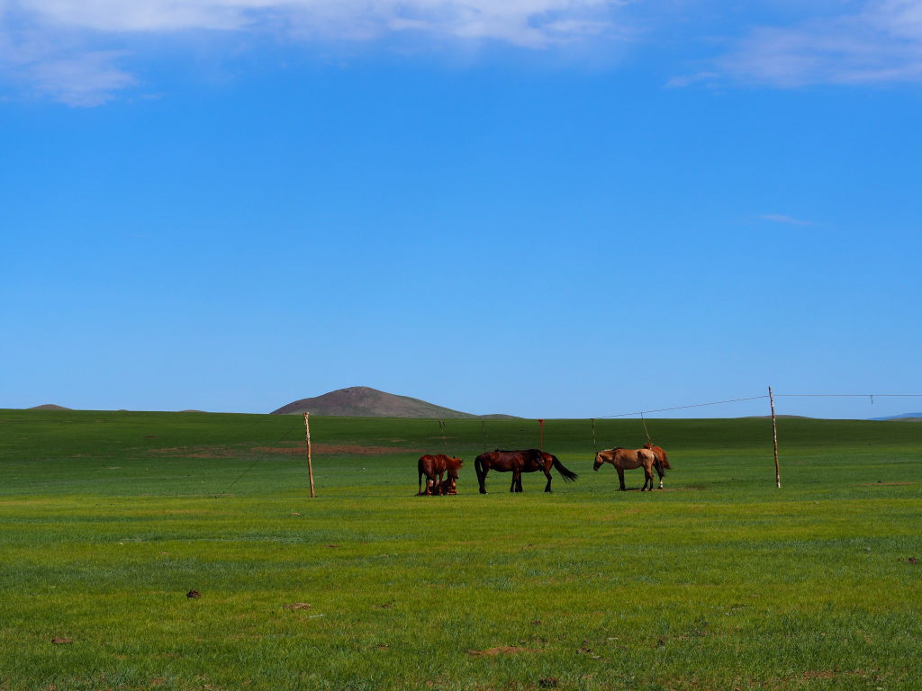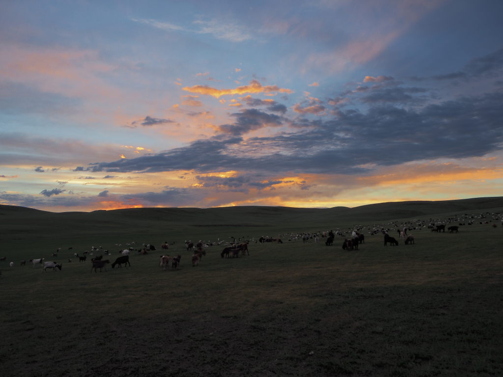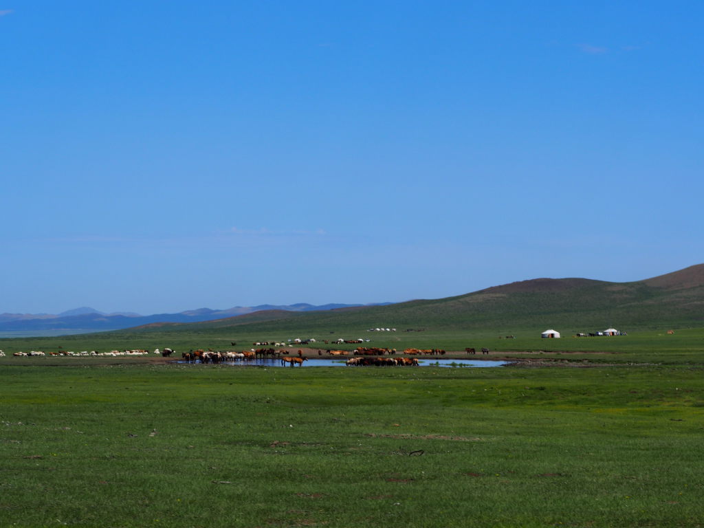 Nous avions déjà eu un magnifique aperçu du paysages mongols en arrivant par le nord depuis Irkoutzk avec le transmongol. A une heure de Oulan-Bator, vers le Sud, le paysage est plus vert, vallonné, immense et paisible. Des troupeaux de vaches, chèvres, moutons et chevaux sont en liberté ici, et cohabitent. Il faut parfois séparer les troupeaux pour ne pas qu’ils se mélangent.