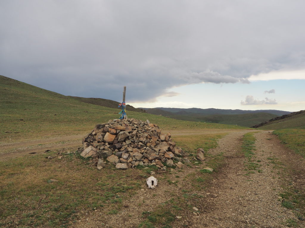Pas de routes mais des pistes. Ici et là, des totem bouddhistes, amas de pierres avec un bâton au milieu recouvert de bandes de tissus de toutes les couleur. La croyance veut que l’on tourne trois fois autour en jetant des pierres.