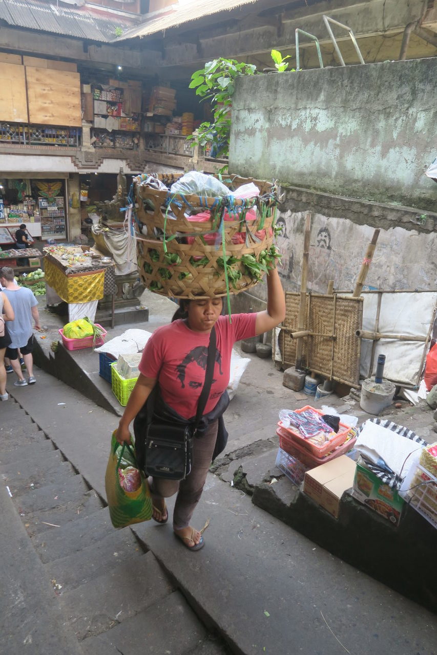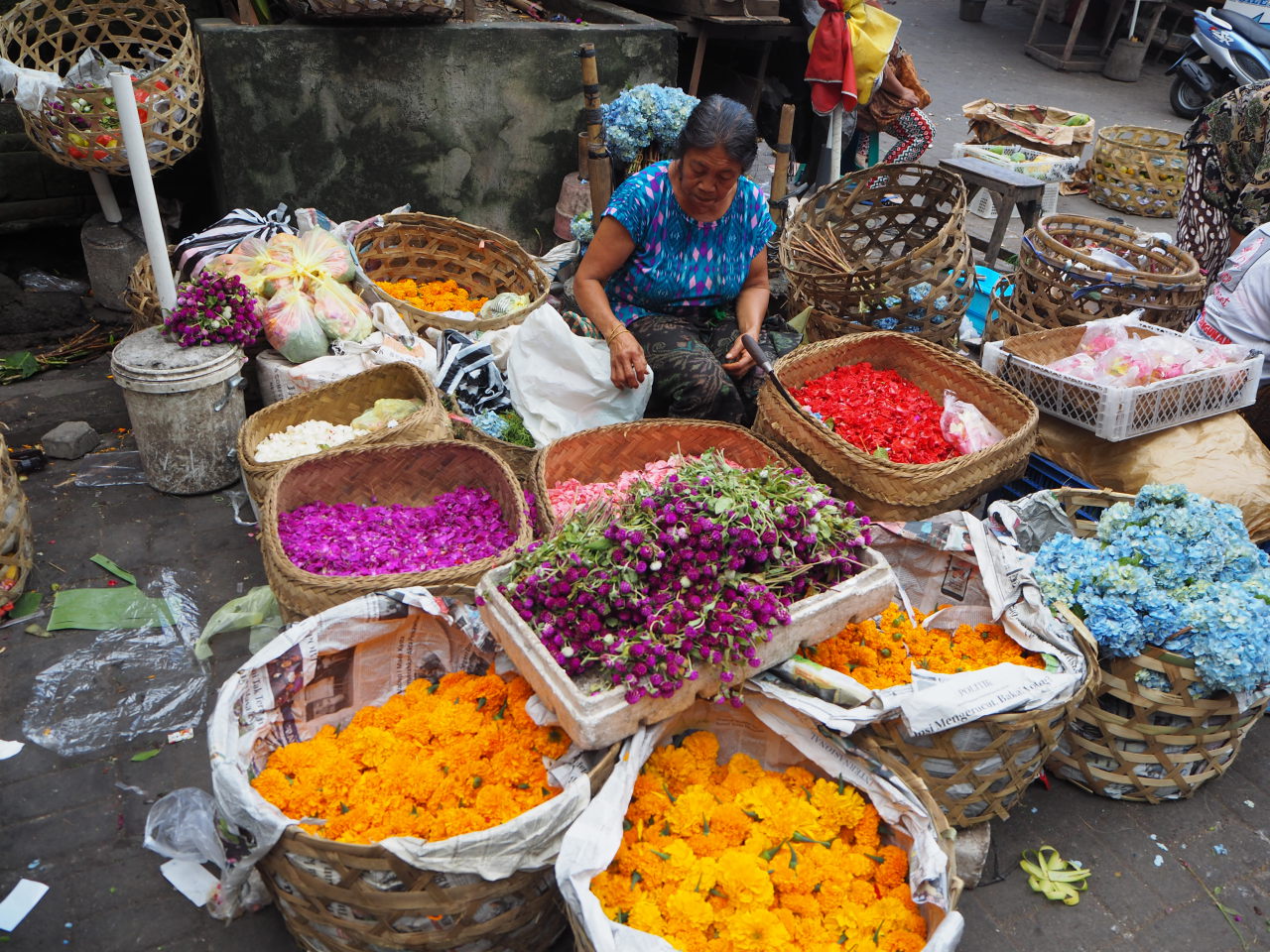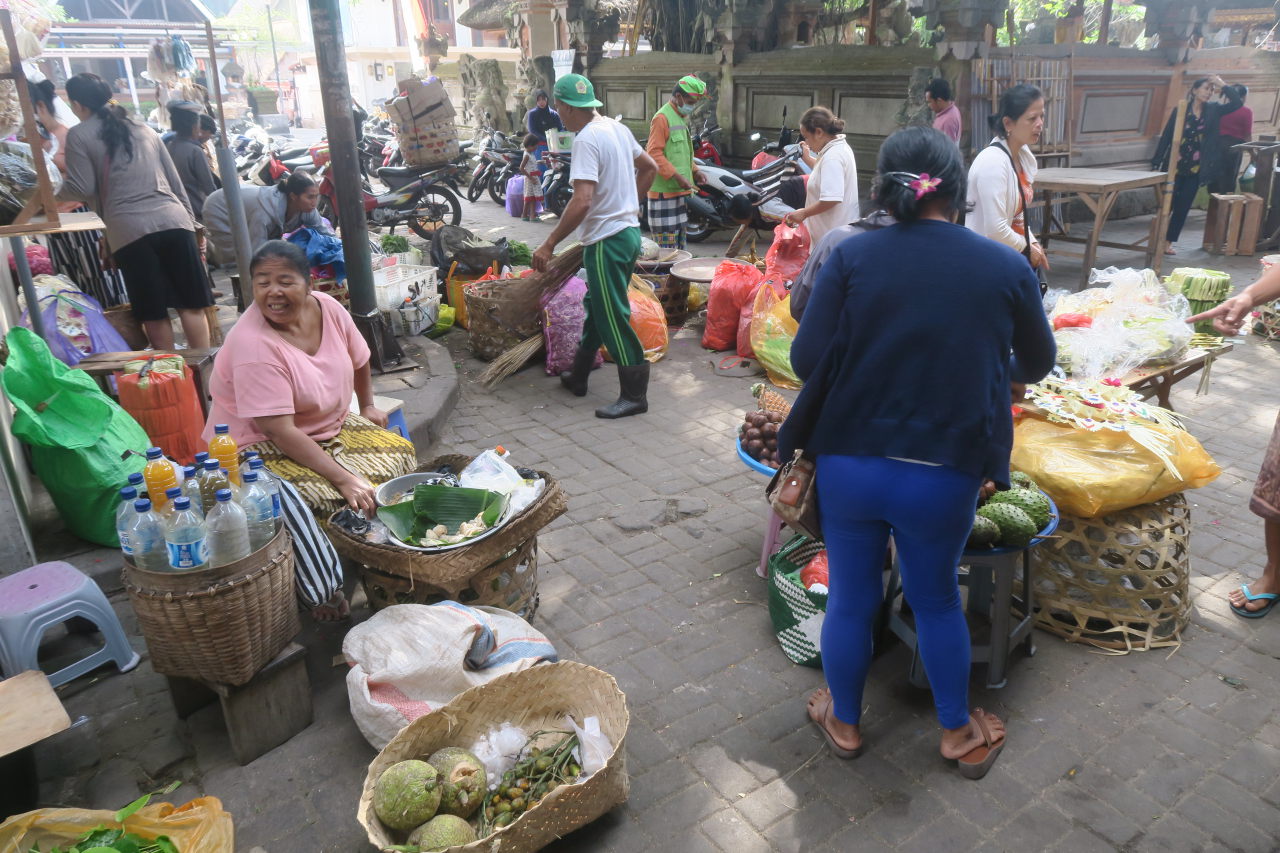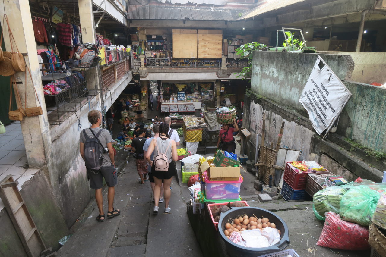 Le marché d’Ubud ouvre ses portes à 4h du matin pour les locaux. En vente : produits frais, poissons sous glace, viandes, légumes, fruits, épices, fleurs pour les offrandes aux temples, etc.